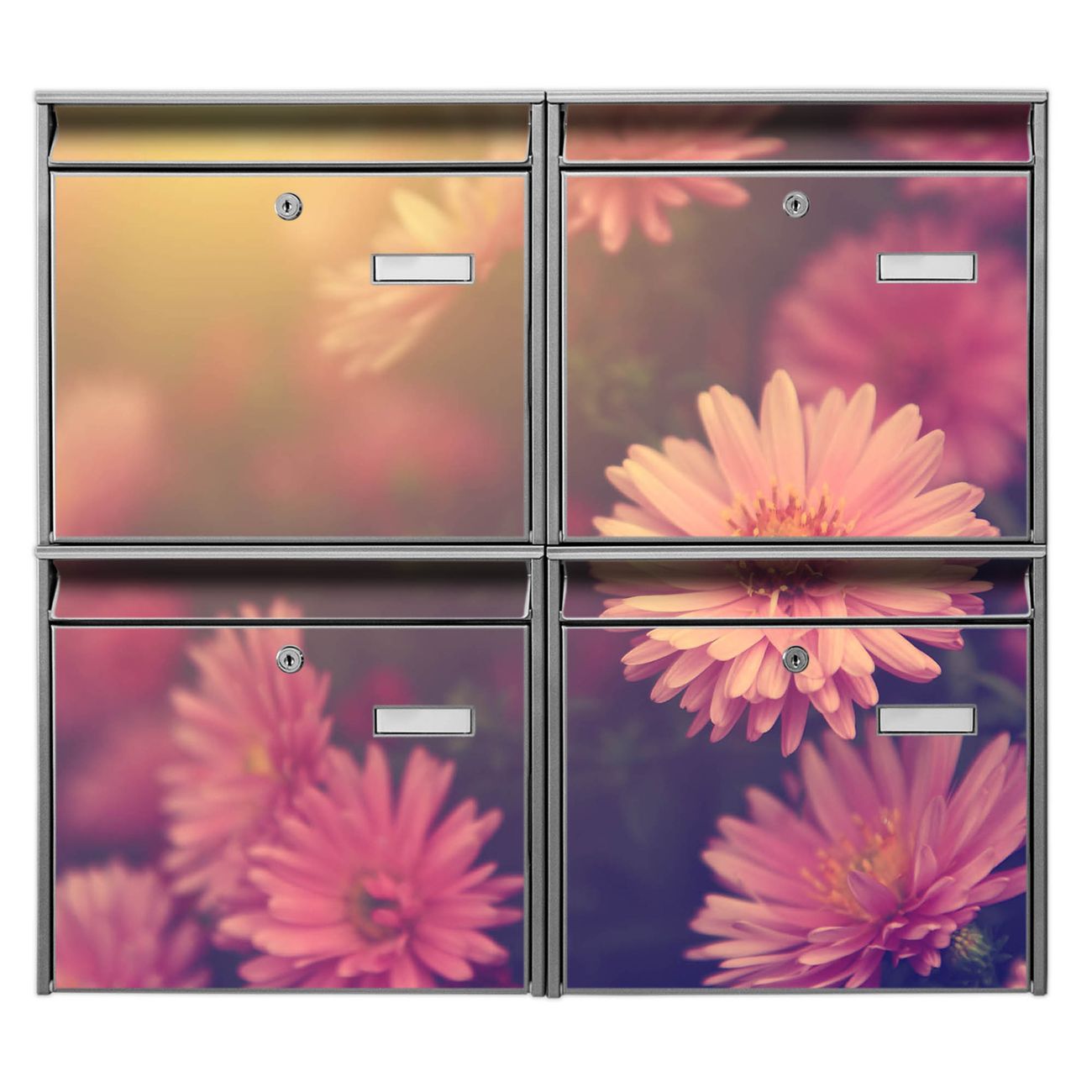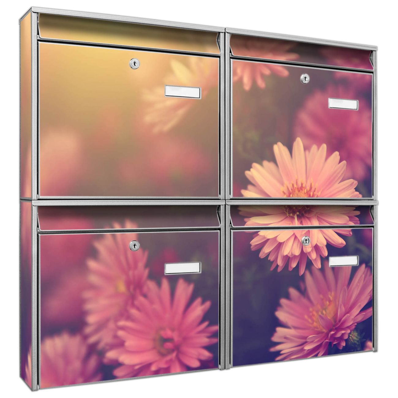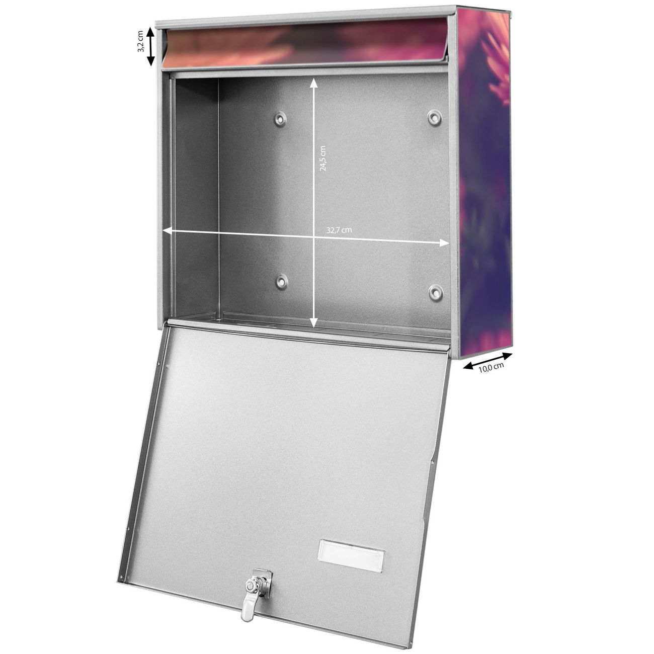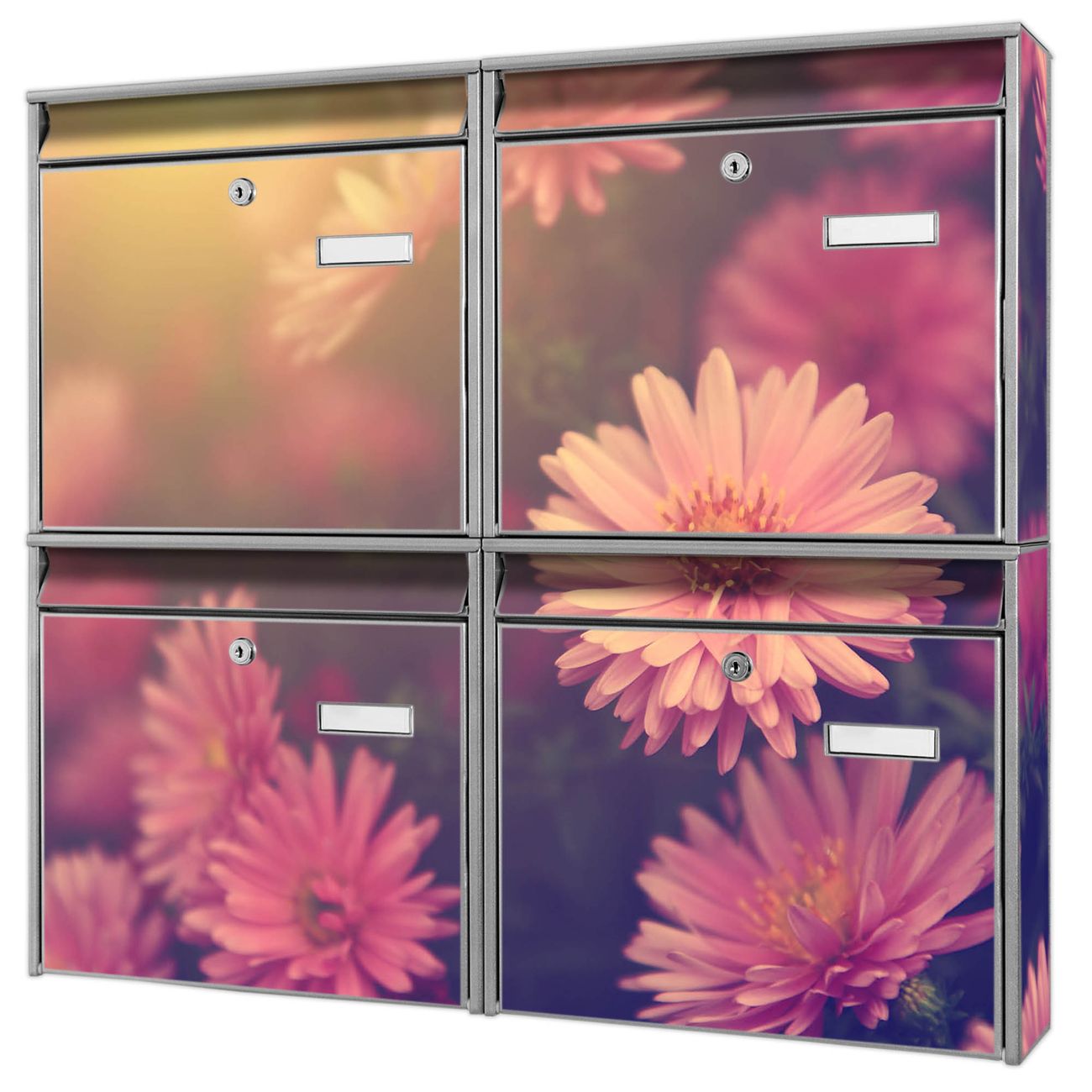 FUNKTION: Die Burg-Wächter Briefkastenanlage mit Motiv Gerbera 2 bietet Ihnen ausreichend Fassungsvermögen um auch A4 und C4 Sendungen zu empfangen. Das integrierte Namensschild lässt sich individuell beschriften. Wählen Sie aus den Grundfarben weiß, silber und schwarz. DESIGN: Die 4 Briefkästen haben ein ansprechendes und zeitloses Design, ohne dabei auf Funktionalität zu verzichten. Das Material ist sehr stabil, wetterfest und rostfrei. Durch das Motiv Gerbera 2 werden die Postkästen zu einem Blickfang. DETAILS: Die Postkästen bestehen aus verzinktem Stahl der zusätzlich mit Klarlack versiegelt wurde. Die Kästen sind gesamt 64,5cm hoch, 72,5cm breit und 10cm tief. Das Motiv besteht aus einer wetter- und UV-festen Folie, die Ihren Briefkasten zusätzlich vor Kratzern schützt. Die Postkästen werden mit Montagematerial, je einem Namensschild und je zwei Schlüsseln geliefert. NUTZEN: Das Briefkastenset eignet sich für die Wandmontage, die Größe bietet genügend Platz für Sendungen aller Art. Das zeitlose Design sowie die stabile Bauart bieten Ihnen einen treuen Begleiter für Ihre Post. BANJADO:
