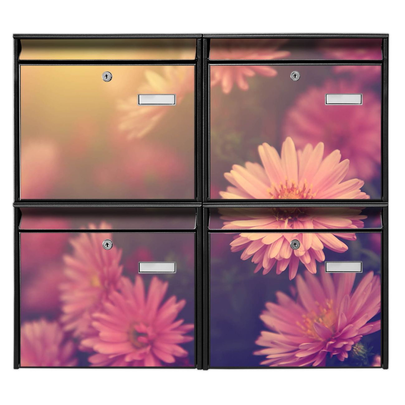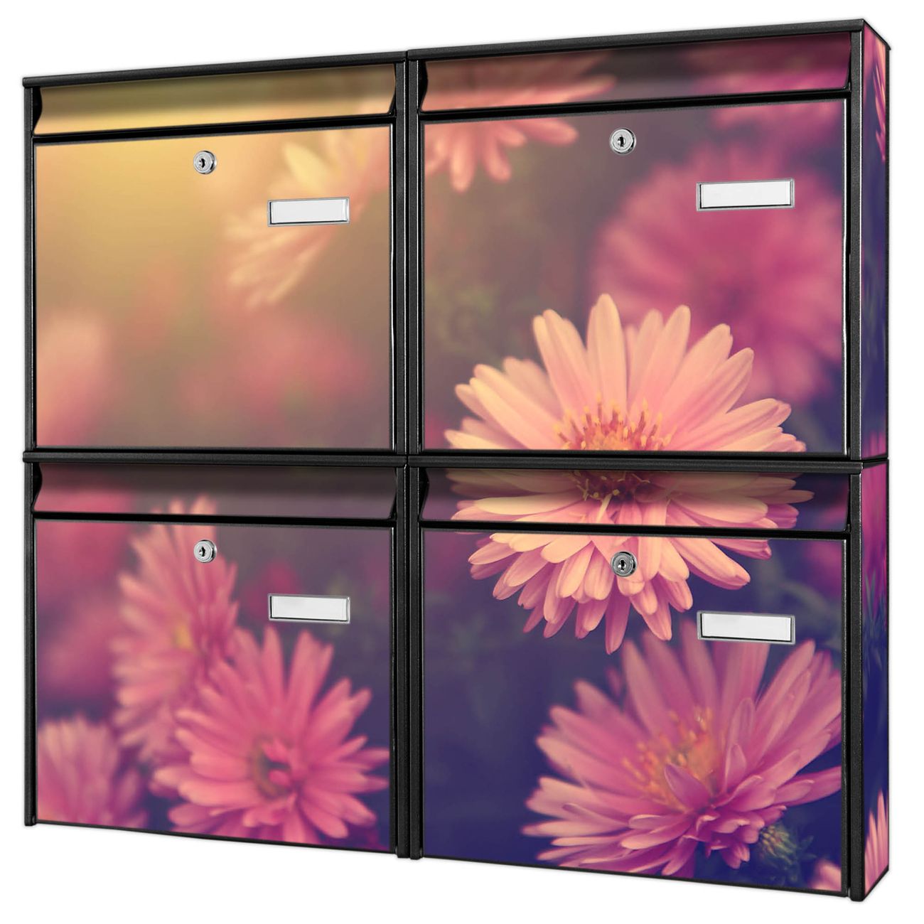 FUNKTION: Die Burg-Wächter Briefkastenanlage mit Motiv Gerbera 2 bietet Ihnen ausreichend Fassungsvermögen um auch A4 und C4 Sendungen zu empfangen. Das integrierte Namensschild lässt sich individuell beschriften. Wählen Sie aus den Grundfarben weiß, silber und schwarz. DESIGN: Die 4 Briefkästen haben ein ansprechendes und zeitloses Design, ohne dabei auf Funktionalität zu verzichten. Das Material ist sehr stabil, wetterfest und rostfrei. Durch das Motiv Gerbera 2 werden die Postkästen zu einem Blickfang. DETAILS: Die Postkästen bestehen aus verzinktem Stahl der zusätzlich mit Klarlack versiegelt wurde. Die Kästen sind gesamt 64,5cm hoch, 72,5cm breit und 10cm tief. Das Motiv besteht aus einer wetter- und UV-festen Folie, die Ihren Briefkasten zusätzlich vor Kratzern schützt. Die Postkästen werden mit Montagematerial, je einem Namensschild und je zwei Schlüsseln geliefert. NUTZEN: Das Briefkastenset eignet sich für die Wandmontage, die Größe bietet genügend Platz für Sendungen aller Art. Das zeitlose Design sowie die stabile Bauart bieten Ihnen einen treuen Begleiter für Ihre Post. BANJADO: