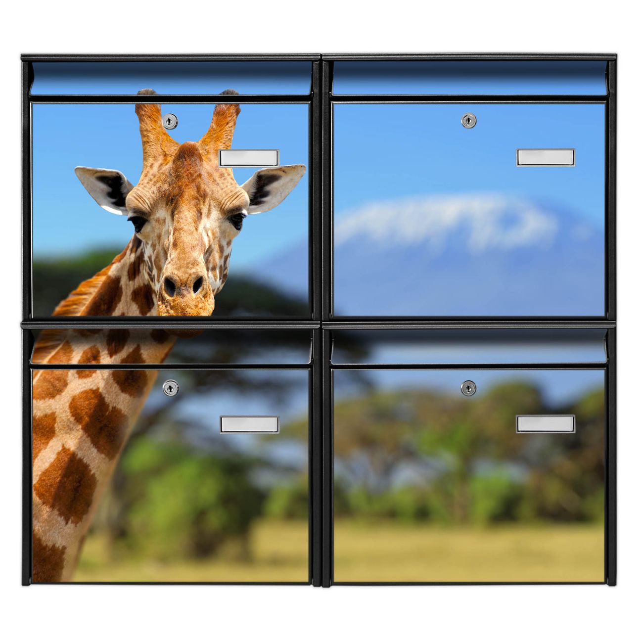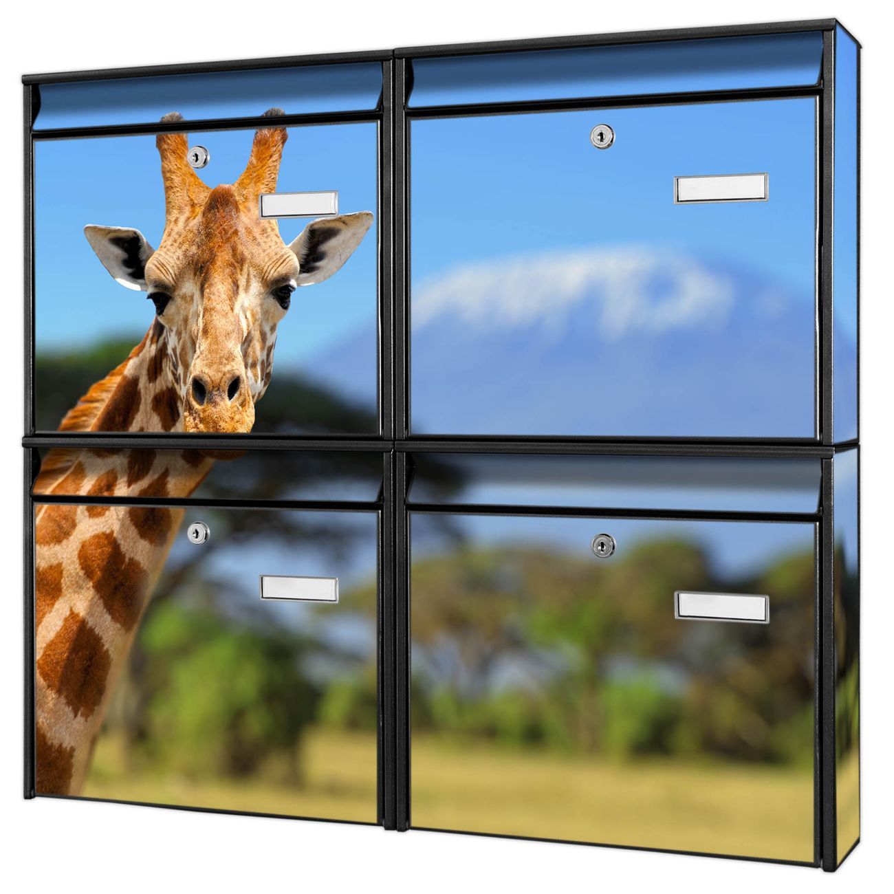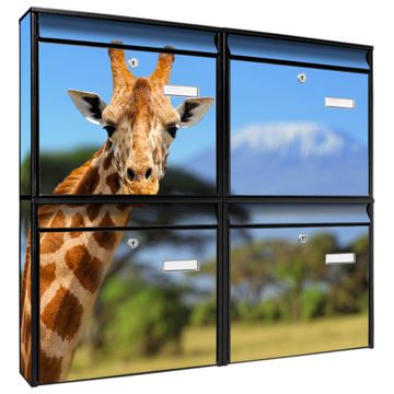 FUNKTION: Die Burg-Wächter Briefkastenanlage mit Motiv Miss Kilimandscharo bietet Ihnen ausreichend Fassungsvermögen um auch A4 und C4 Sendungen zu empfangen. Das integrierte Namensschild lässt sich individuell beschriften. Wählen Sie aus den Grundfarben weiß, silber und schwarz. DESIGN: Die 4 Briefkästen haben ein ansprechendes und zeitloses Design, ohne dabei auf Funktionalität zu verzichten. Das Material ist sehr stabil, wetterfest und rostfrei. Durch das Motiv Miss Kilimandscharo werden die Postkästen zu einem Blickfang. DETAILS: Die Postkästen bestehen aus verzinktem Stahl der zusätzlich mit Klarlack versiegelt wurde. Die Kästen sind gesamt 64,5cm hoch, 72,5cm breit und 10cm tief. Das Motiv besteht aus einer wetter- und UV-festen Folie, die Ihren Briefkasten zusätzlich vor Kratzern schützt. Die Postkästen werden mit Montagematerial, je einem Namensschild und je zwei Schlüsseln geliefert. NUTZEN: Das Briefkastenset eignet sich für die Wandmontage, die Größe bietet genügend Platz für Sendungen aller Art. Das zeitlose Design sowie die stabile Bauart bieten Ihnen einen treuen Begleiter für Ihre Post. BANJADO: