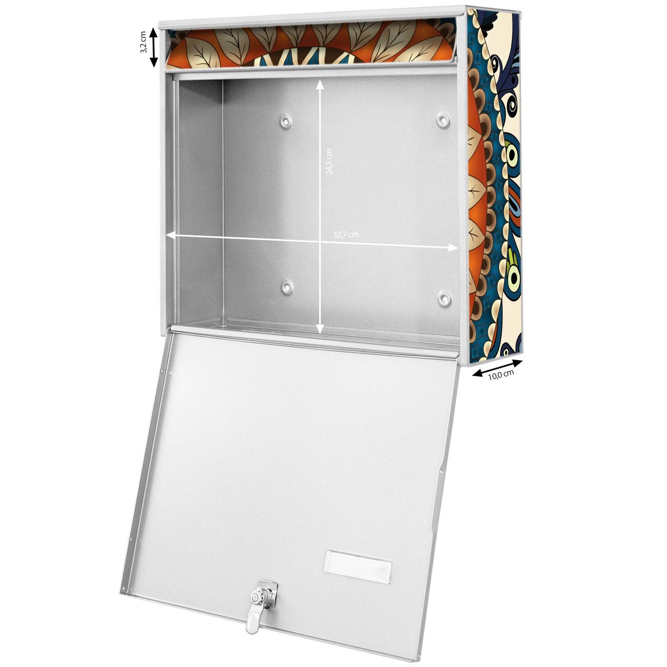 FUNKTION: Die Burg-Wächter Briefkastenanlage mit Motiv Modernes Mandala bietet Ihnen ausreichend Fassungsvermögen um auch A4 und C4 Sendungen zu empfangen. Das integrierte Namensschild lässt sich individuell beschriften. Wählen Sie aus den Grundfarben weiß, silber und schwarz. DESIGN: Die 4 Briefkästen haben ein ansprechendes und zeitloses Design, ohne dabei auf Funktionalität zu verzichten. Das Material ist sehr stabil, wetterfest und rostfrei. Durch das Motiv Modernes Mandala werden die Postkästen zu einem Blickfang. DETAILS: Die Postkästen bestehen aus verzinktem Stahl der zusätzlich mit Klarlack versiegelt wurde. Die Kästen sind gesamt 64,5cm hoch, 72,5cm breit und 10cm tief. Das Motiv besteht aus einer wetter- und UV-festen Folie, die Ihren Briefkasten zusätzlich vor Kratzern schützt. Die Postkästen werden mit Montagematerial, je einem Namensschild und je zwei Schlüsseln geliefert. NUTZEN: Das Briefkastenset eignet sich für die Wandmontage, die Größe bietet genügend Platz für Sendungen aller Art. Das zeitlose Design sowie die stabile Bauart bieten Ihnen einen treuen Begleiter für Ihre Post. BANJADO: