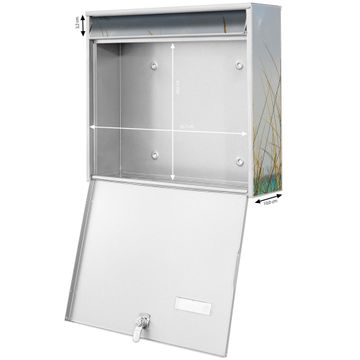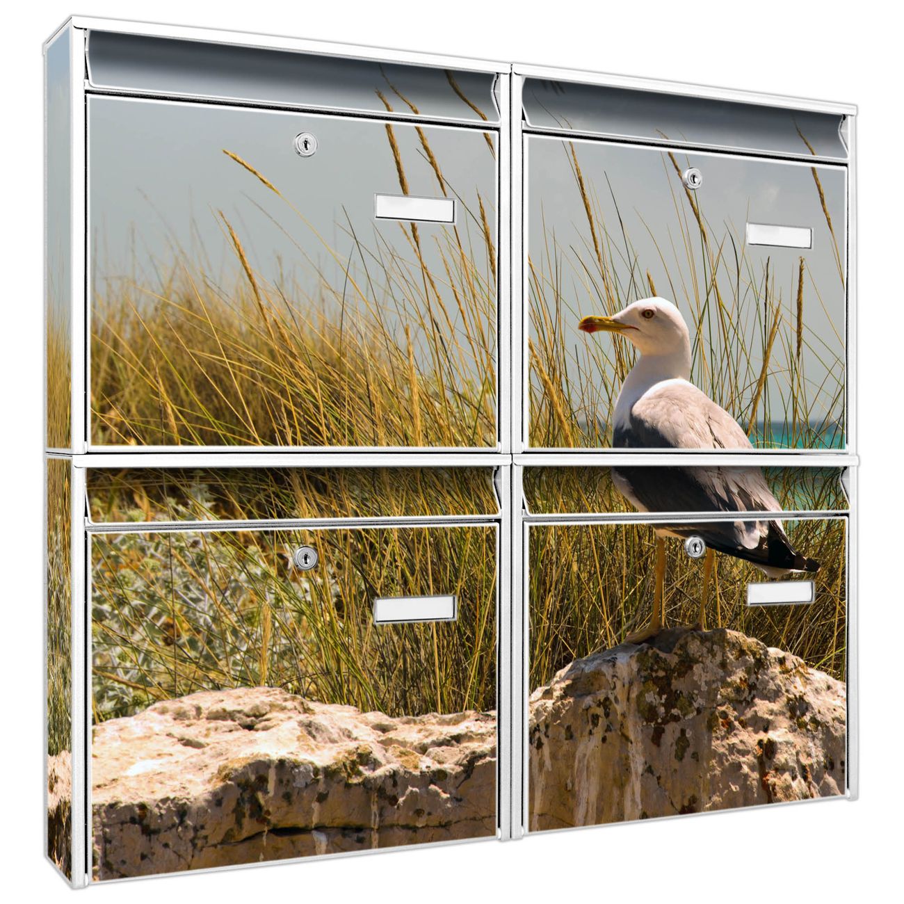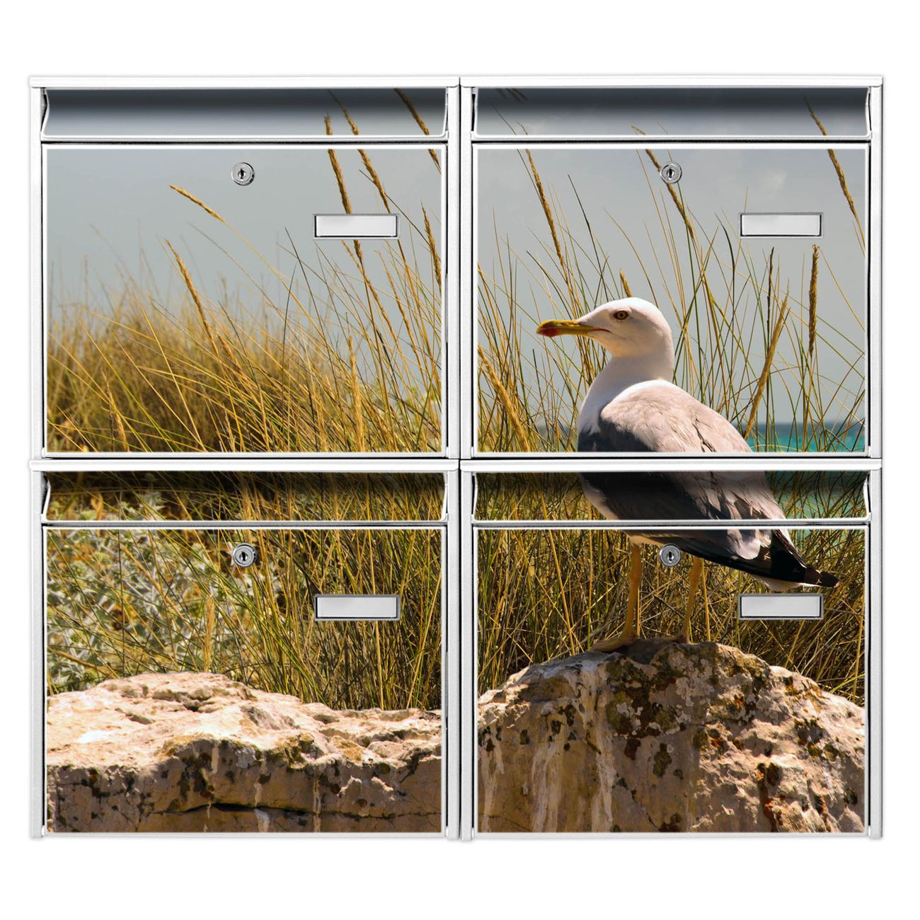 FUNKTION: Die Burg-Wächter Briefkastenanlage mit Motiv Möwen bietet Ihnen ausreichend Fassungsvermögen um auch A4 und C4 Sendungen zu empfangen. Das integrierte Namensschild lässt sich individuell beschriften. Wählen Sie aus den Grundfarben weiß, silber und schwarz. DESIGN: Die 4 Briefkästen haben ein ansprechendes und zeitloses Design, ohne dabei auf Funktionalität zu verzichten. Das Material ist sehr stabil, wetterfest und rostfrei. Durch das Motiv Möwen werden die Postkästen zu einem Blickfang. DETAILS: Die Postkästen bestehen aus verzinktem Stahl der zusätzlich mit Klarlack versiegelt wurde. Die Kästen sind gesamt 64,5cm hoch, 72,5cm breit und 10cm tief. Das Motiv besteht aus einer wetter- und UV-festen Folie, die Ihren Briefkasten zusätzlich vor Kratzern schützt. Die Postkästen werden mit Montagematerial, je einem Namensschild und je zwei Schlüsseln geliefert. NUTZEN: Das Briefkastenset eignet sich für die Wandmontage, die Größe bietet genügend Platz für Sendungen aller Art. Das zeitlose Design sowie die stabile Bauart bieten Ihnen einen treuen Begleiter für Ihre Post. BANJADO: