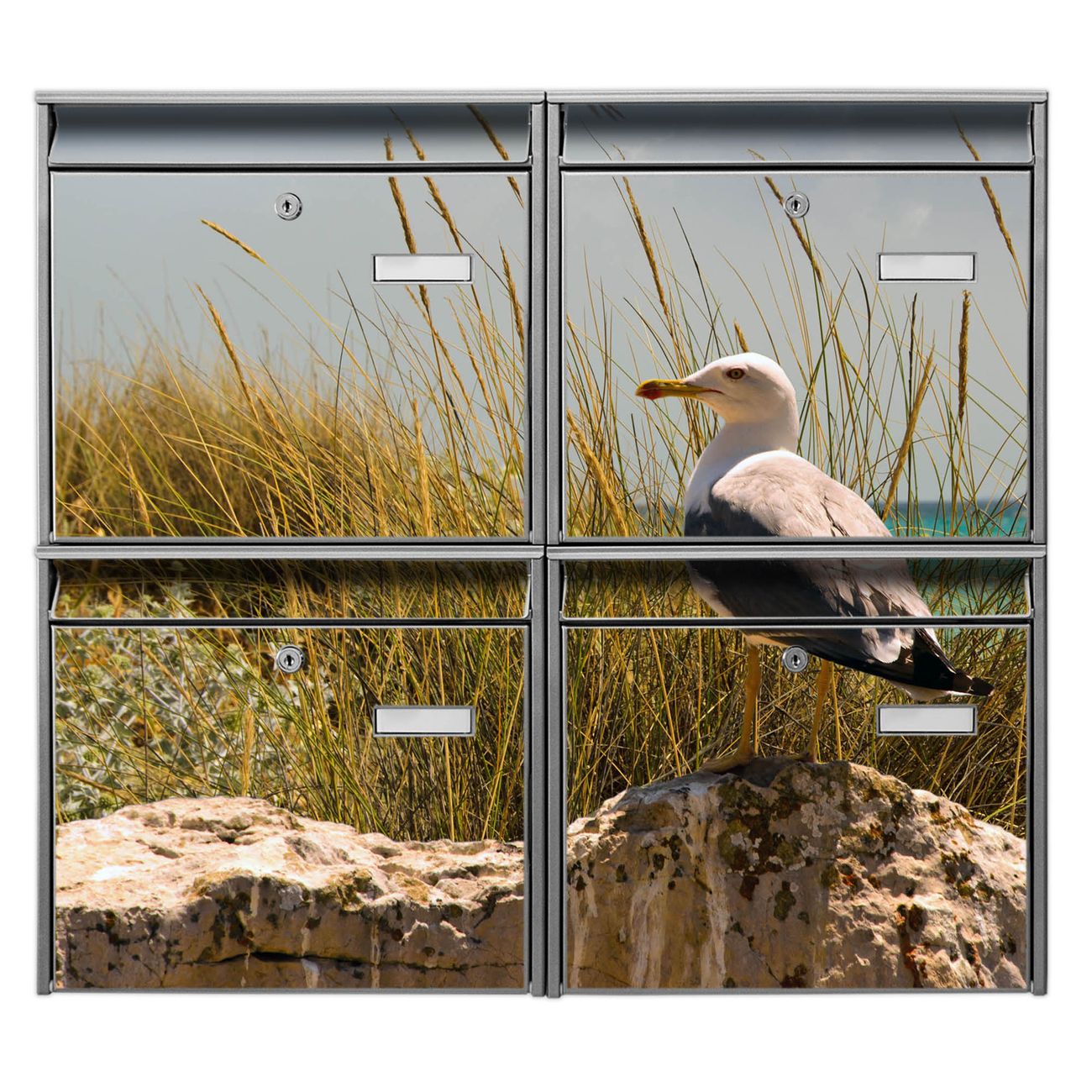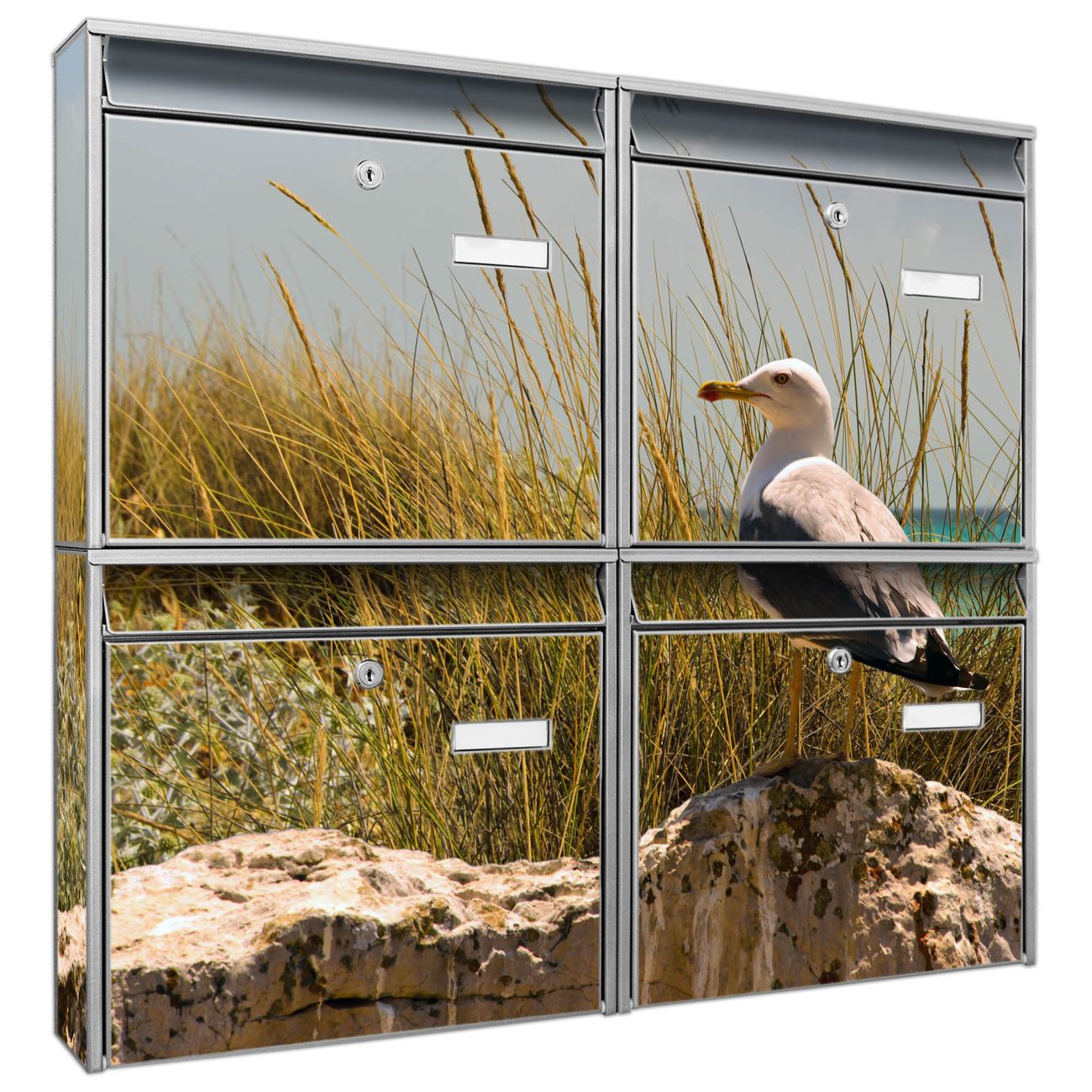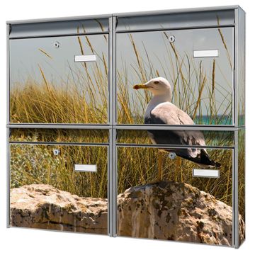 FUNKTION: Die Burg-Wächter Briefkastenanlage mit Motiv Möwen bietet Ihnen ausreichend Fassungsvermögen um auch A4 und C4 Sendungen zu empfangen. Das integrierte Namensschild lässt sich individuell beschriften. Wählen Sie aus den Grundfarben weiß, silber und schwarz. DESIGN: Die 4 Briefkästen haben ein ansprechendes und zeitloses Design, ohne dabei auf Funktionalität zu verzichten. Das Material ist sehr stabil, wetterfest und rostfrei. Durch das Motiv Möwen werden die Postkästen zu einem Blickfang. DETAILS: Die Postkästen bestehen aus verzinktem Stahl der zusätzlich mit Klarlack versiegelt wurde. Die Kästen sind gesamt 64,5cm hoch, 72,5cm breit und 10cm tief. Das Motiv besteht aus einer wetter- und UV-festen Folie, die Ihren Briefkasten zusätzlich vor Kratzern schützt. Die Postkästen werden mit Montagematerial, je einem Namensschild und je zwei Schlüsseln geliefert. NUTZEN: Das Briefkastenset eignet sich für die Wandmontage, die Größe bietet genügend Platz für Sendungen aller Art. Das zeitlose Design sowie die stabile Bauart bieten Ihnen einen treuen Begleiter für Ihre Post. BANJADO:
