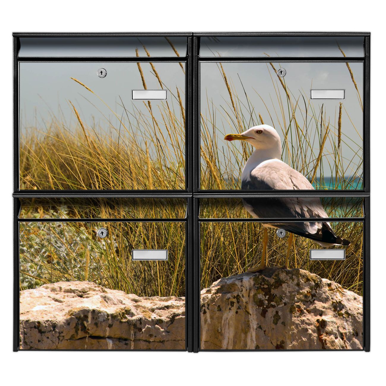 FUNKTION: Die Burg-Wächter Briefkastenanlage mit Motiv Möwen bietet Ihnen ausreichend Fassungsvermögen um auch A4 und C4 Sendungen zu empfangen. Das integrierte Namensschild lässt sich individuell beschriften. Wählen Sie aus den Grundfarben weiß, silber und schwarz. DESIGN: Die 4 Briefkästen haben ein ansprechendes und zeitloses Design, ohne dabei auf Funktionalität zu verzichten. Das Material ist sehr stabil, wetterfest und rostfrei. Durch das Motiv Möwen werden die Postkästen zu einem Blickfang. DETAILS: Die Postkästen bestehen aus verzinktem Stahl der zusätzlich mit Klarlack versiegelt wurde. Die Kästen sind gesamt 64,5cm hoch, 72,5cm breit und 10cm tief. Das Motiv besteht aus einer wetter- und UV-festen Folie, die Ihren Briefkasten zusätzlich vor Kratzern schützt. Die Postkästen werden mit Montagematerial, je einem Namensschild und je zwei Schlüsseln geliefert. NUTZEN: Das Briefkastenset eignet sich für die Wandmontage, die Größe bietet genügend Platz für Sendungen aller Art. Das zeitlose Design sowie die stabile Bauart bieten Ihnen einen treuen Begleiter für Ihre Post. BANJADO: