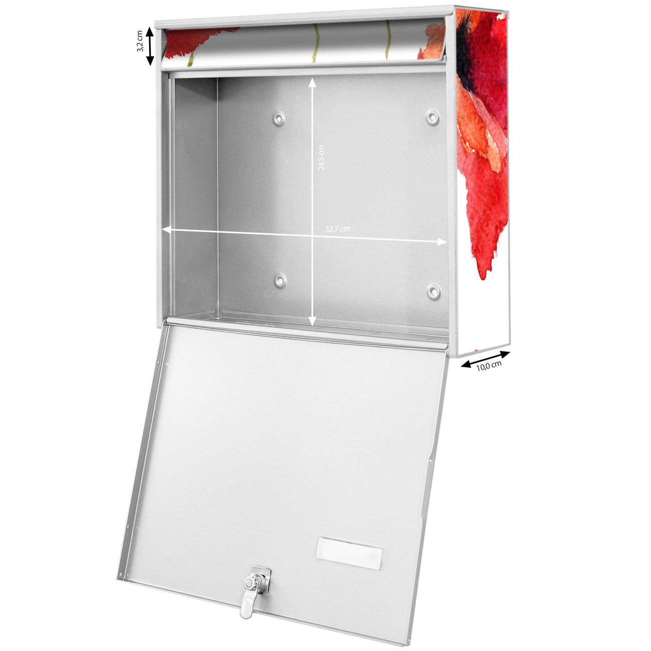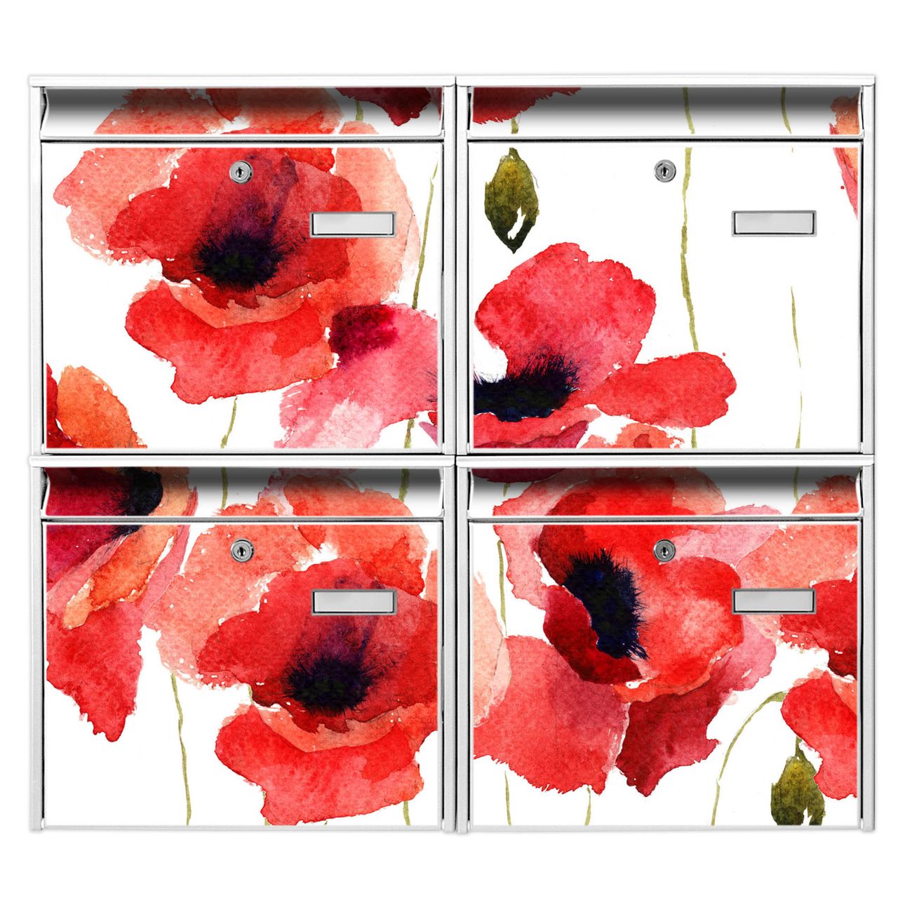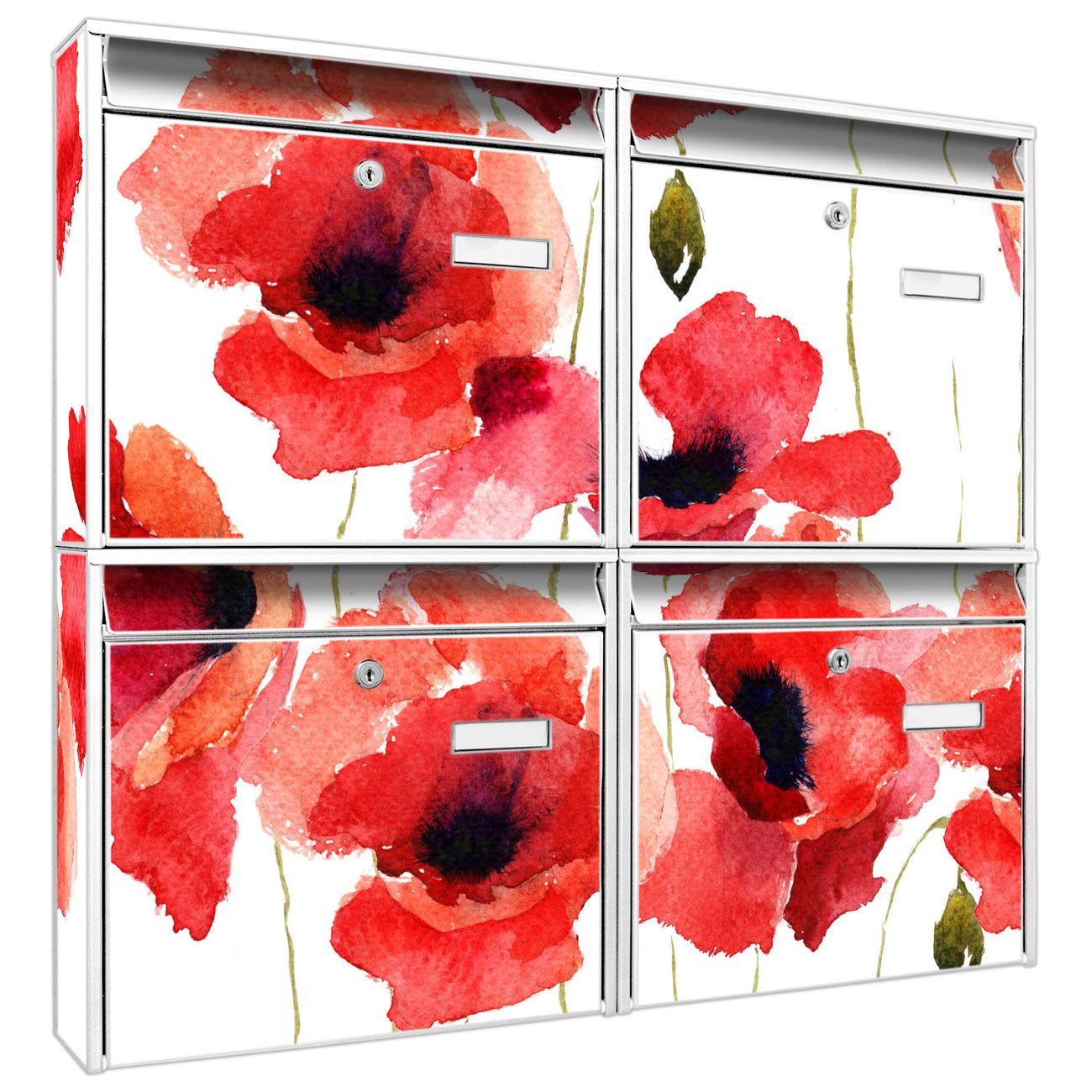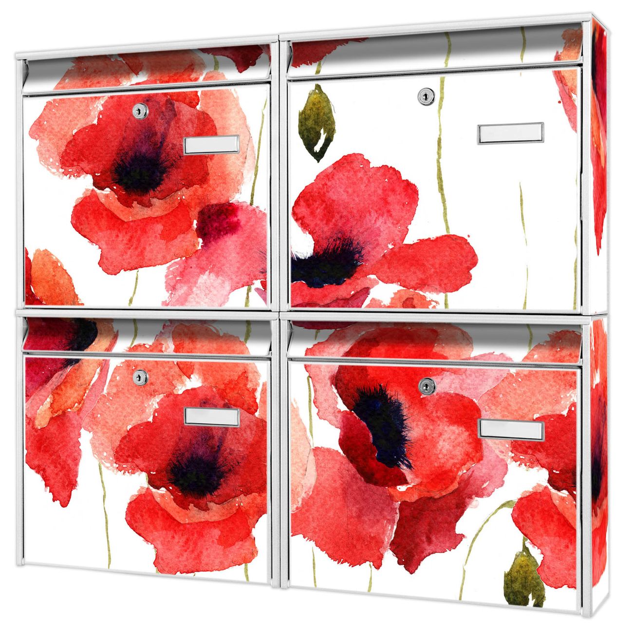FUNKTION: Die Burg-Wächter Briefkastenanlage mit Motiv Mohn Aquarell bietet Ihnen ausreichend Fassungsvermögen um auch A4 und C4 Sendungen zu empfangen. Das integrierte Namensschild lässt sich individuell beschriften. Wählen Sie aus den Grundfarben weiß, silber und schwarz. DESIGN: Die 4 Briefkästen haben ein ansprechendes und zeitloses Design, ohne dabei auf Funktionalität zu verzichten. Das Material ist sehr stabil, wetterfest und rostfrei. Durch das Motiv Mohn Aquarell werden die Postkästen zu einem Blickfang. DETAILS: Die Postkästen bestehen aus verzinktem Stahl der zusätzlich mit Klarlack versiegelt wurde. Die Kästen sind gesamt 64,5cm hoch, 72,5cm breit und 10cm tief. Das Motiv besteht aus einer wetter- und UV-festen Folie, die Ihren Briefkasten zusätzlich vor Kratzern schützt. Die Postkästen werden mit Montagematerial, je einem Namensschild und je zwei Schlüsseln geliefert. NUTZEN: Das Briefkastenset eignet sich für die Wandmontage, die Größe bietet genügend Platz für Sendungen aller Art. Das zeitlose Design sowie die stabile Bauart bieten Ihnen einen treuen Begleiter für Ihre Post. BANJADO: