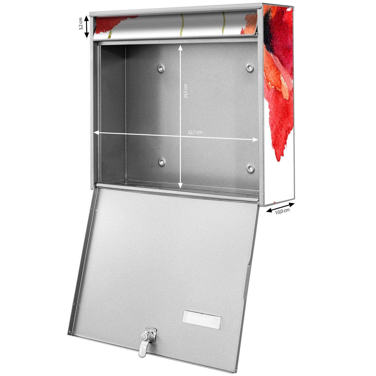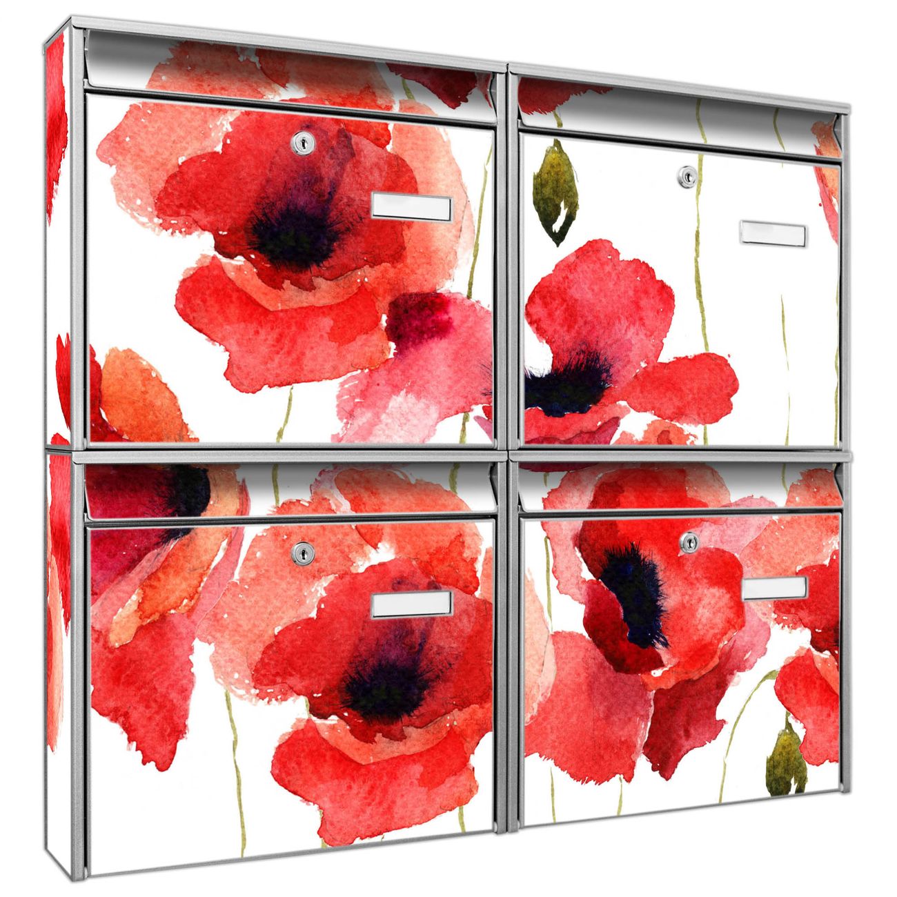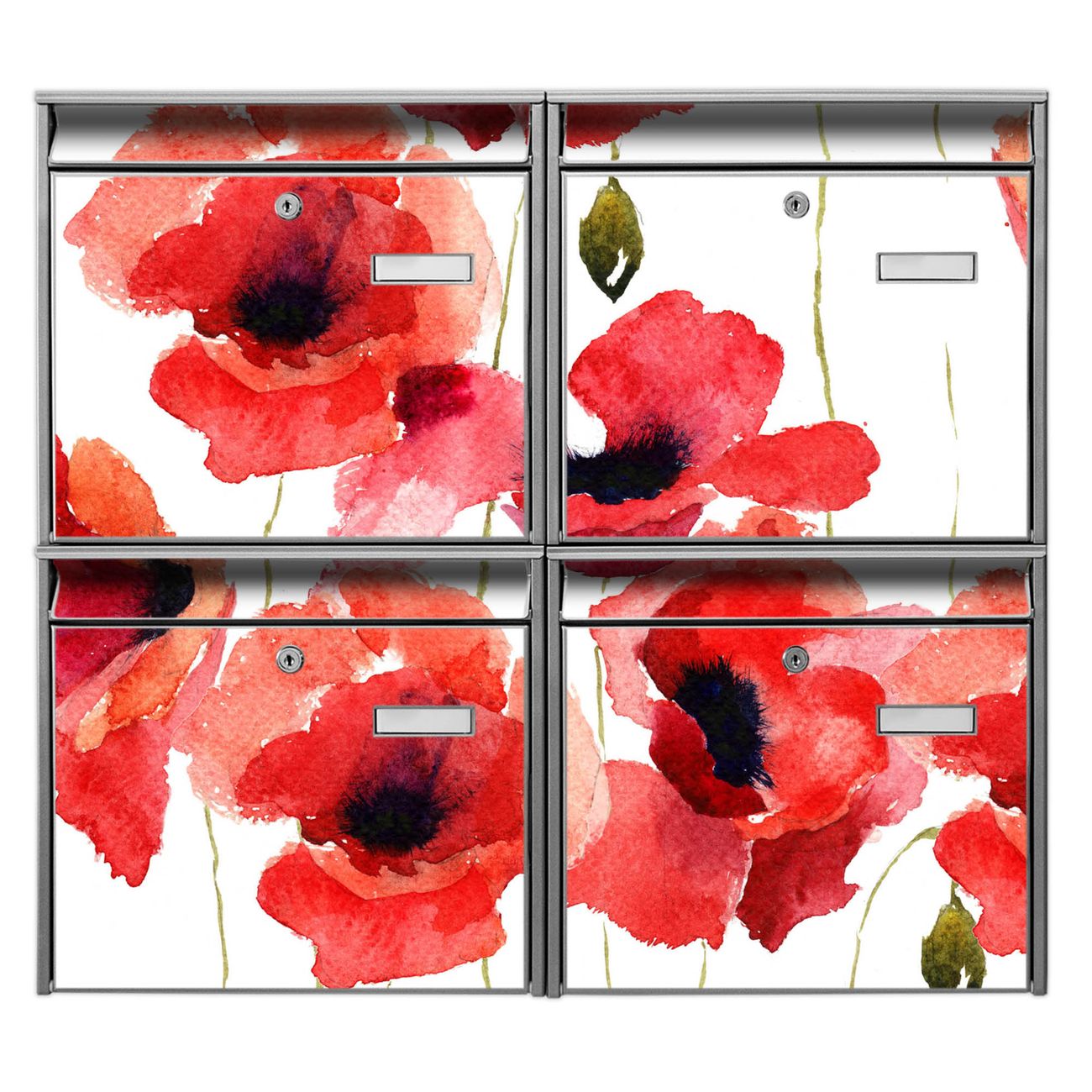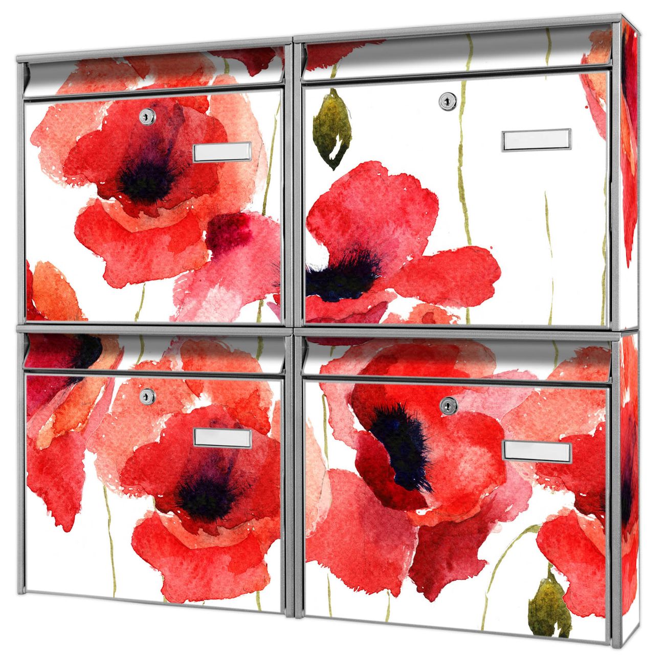 FUNKTION: Die Burg-Wächter Briefkastenanlage mit Motiv Mohn Aquarell bietet Ihnen ausreichend Fassungsvermögen um auch A4 und C4 Sendungen zu empfangen. Das integrierte Namensschild lässt sich individuell beschriften. Wählen Sie aus den Grundfarben weiß, silber und schwarz. DESIGN: Die 4 Briefkästen haben ein ansprechendes und zeitloses Design, ohne dabei auf Funktionalität zu verzichten. Das Material ist sehr stabil, wetterfest und rostfrei. Durch das Motiv Mohn Aquarell werden die Postkästen zu einem Blickfang. DETAILS: Die Postkästen bestehen aus verzinktem Stahl der zusätzlich mit Klarlack versiegelt wurde. Die Kästen sind gesamt 64,5cm hoch, 72,5cm breit und 10cm tief. Das Motiv besteht aus einer wetter- und UV-festen Folie, die Ihren Briefkasten zusätzlich vor Kratzern schützt. Die Postkästen werden mit Montagematerial, je einem Namensschild und je zwei Schlüsseln geliefert. NUTZEN: Das Briefkastenset eignet sich für die Wandmontage, die Größe bietet genügend Platz für Sendungen aller Art. Das zeitlose Design sowie die stabile Bauart bieten Ihnen einen treuen Begleiter für Ihre Post. BANJADO: