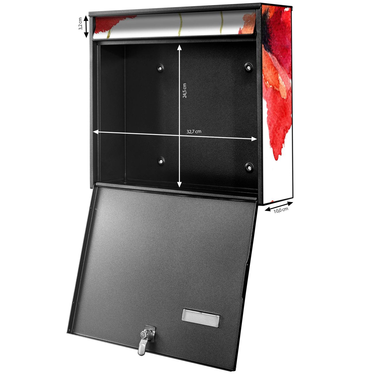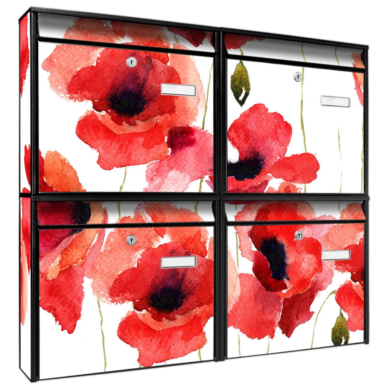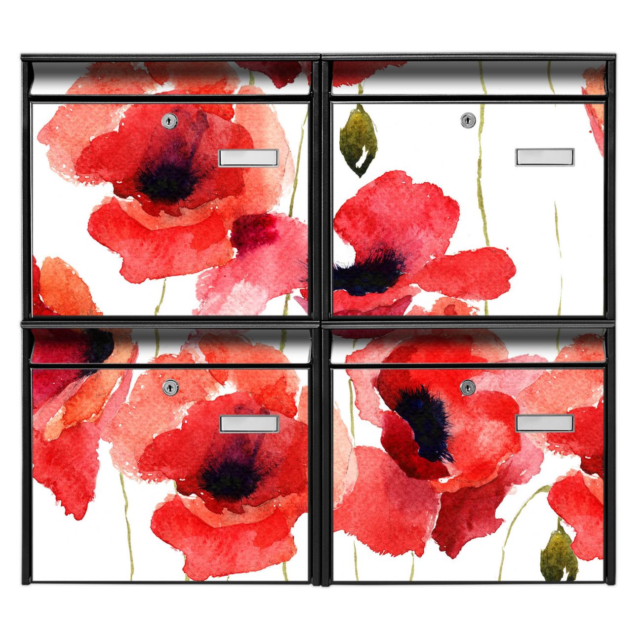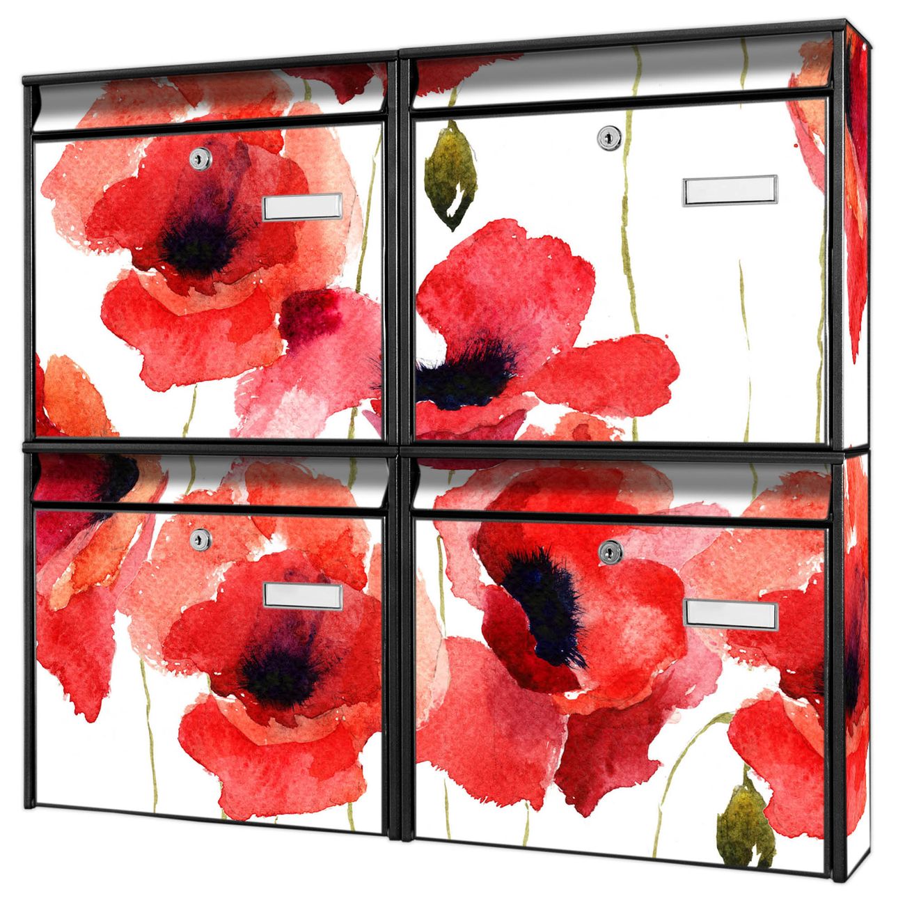 FUNKTION: Die Burg-Wächter Briefkastenanlage mit Motiv Mohn Aquarell bietet Ihnen ausreichend Fassungsvermögen um auch A4 und C4 Sendungen zu empfangen. Das integrierte Namensschild lässt sich individuell beschriften. Wählen Sie aus den Grundfarben weiß, silber und schwarz. DESIGN: Die 4 Briefkästen haben ein ansprechendes und zeitloses Design, ohne dabei auf Funktionalität zu verzichten. Das Material ist sehr stabil, wetterfest und rostfrei. Durch das Motiv Mohn Aquarell werden die Postkästen zu einem Blickfang. DETAILS: Die Postkästen bestehen aus verzinktem Stahl der zusätzlich mit Klarlack versiegelt wurde. Die Kästen sind gesamt 64,5cm hoch, 72,5cm breit und 10cm tief. Das Motiv besteht aus einer wetter- und UV-festen Folie, die Ihren Briefkasten zusätzlich vor Kratzern schützt. Die Postkästen werden mit Montagematerial, je einem Namensschild und je zwei Schlüsseln geliefert. NUTZEN: Das Briefkastenset eignet sich für die Wandmontage, die Größe bietet genügend Platz für Sendungen aller Art. Das zeitlose Design sowie die stabile Bauart bieten Ihnen einen treuen Begleiter für Ihre Post. BANJADO: