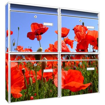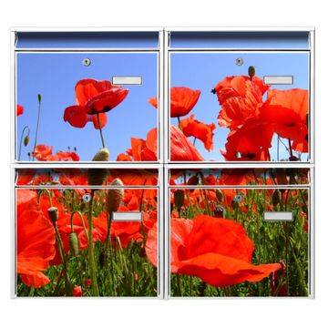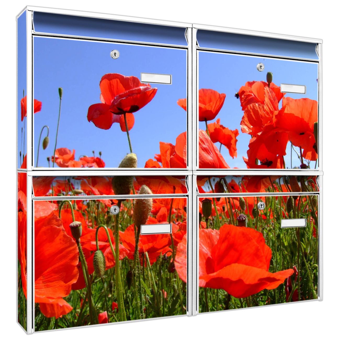 FUNKTION: Die Burg-Wächter Briefkastenanlage mit Motiv Mohnblumen bietet Ihnen ausreichend Fassungsvermögen um auch A4 und C4 Sendungen zu empfangen. Das integrierte Namensschild lässt sich individuell beschriften. Wählen Sie aus den Grundfarben weiß, silber und schwarz. DESIGN: Die 4 Briefkästen haben ein ansprechendes und zeitloses Design, ohne dabei auf Funktionalität zu verzichten. Das Material ist sehr stabil, wetterfest und rostfrei. Durch das Motiv Mohnblumen werden die Postkästen zu einem Blickfang. DETAILS: Die Postkästen bestehen aus verzinktem Stahl der zusätzlich mit Klarlack versiegelt wurde. Die Kästen sind gesamt 64,5cm hoch, 72,5cm breit und 10cm tief. Das Motiv besteht aus einer wetter- und UV-festen Folie, die Ihren Briefkasten zusätzlich vor Kratzern schützt. Die Postkästen werden mit Montagematerial, je einem Namensschild und je zwei Schlüsseln geliefert. NUTZEN: Das Briefkastenset eignet sich für die Wandmontage, die Größe bietet genügend Platz für Sendungen aller Art. Das zeitlose Design sowie die stabile Bauart bieten Ihnen einen treuen Begleiter für Ihre Post. BANJADO: