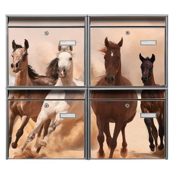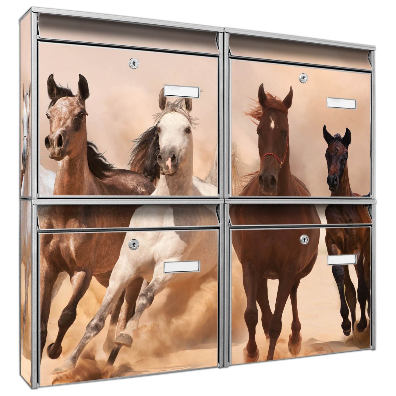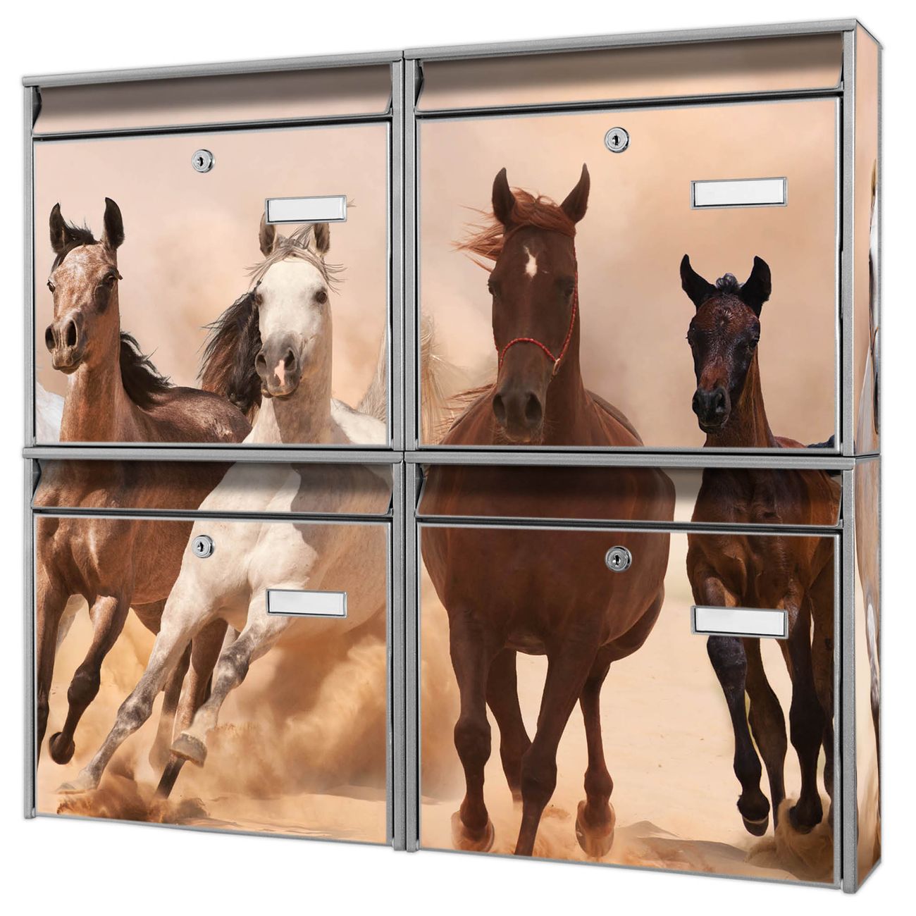 FUNKTION: Die Burg-Wächter Briefkastenanlage mit Motiv Mongolische Stimmung bietet Ihnen ausreichend Fassungsvermögen um auch A4 und C4 Sendungen zu empfangen. Das integrierte Namensschild lässt sich individuell beschriften. Wählen Sie aus den Grundfarben weiß, silber und schwarz. DESIGN: Die 4 Briefkästen haben ein ansprechendes und zeitloses Design, ohne dabei auf Funktionalität zu verzichten. Das Material ist sehr stabil, wetterfest und rostfrei. Durch das Motiv Mongolische Stimmung werden die Postkästen zu einem Blickfang. DETAILS: Die Postkästen bestehen aus verzinktem Stahl der zusätzlich mit Klarlack versiegelt wurde. Die Kästen sind gesamt 64,5cm hoch, 72,5cm breit und 10cm tief. Das Motiv besteht aus einer wetter- und UV-festen Folie, die Ihren Briefkasten zusätzlich vor Kratzern schützt. Die Postkästen werden mit Montagematerial, je einem Namensschild und je zwei Schlüsseln geliefert. NUTZEN: Das Briefkastenset eignet sich für die Wandmontage, die Größe bietet genügend Platz für Sendungen aller Art. Das zeitlose Design sowie die stabile Bauart bieten Ihnen einen treuen Begleiter für Ihre Post. BANJADO: