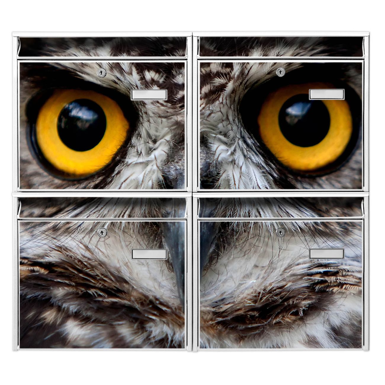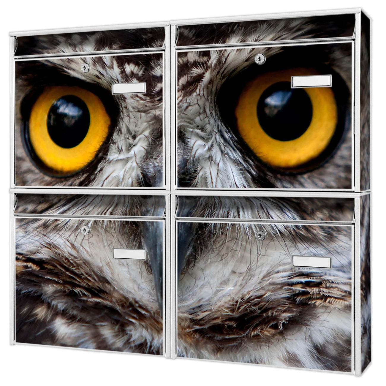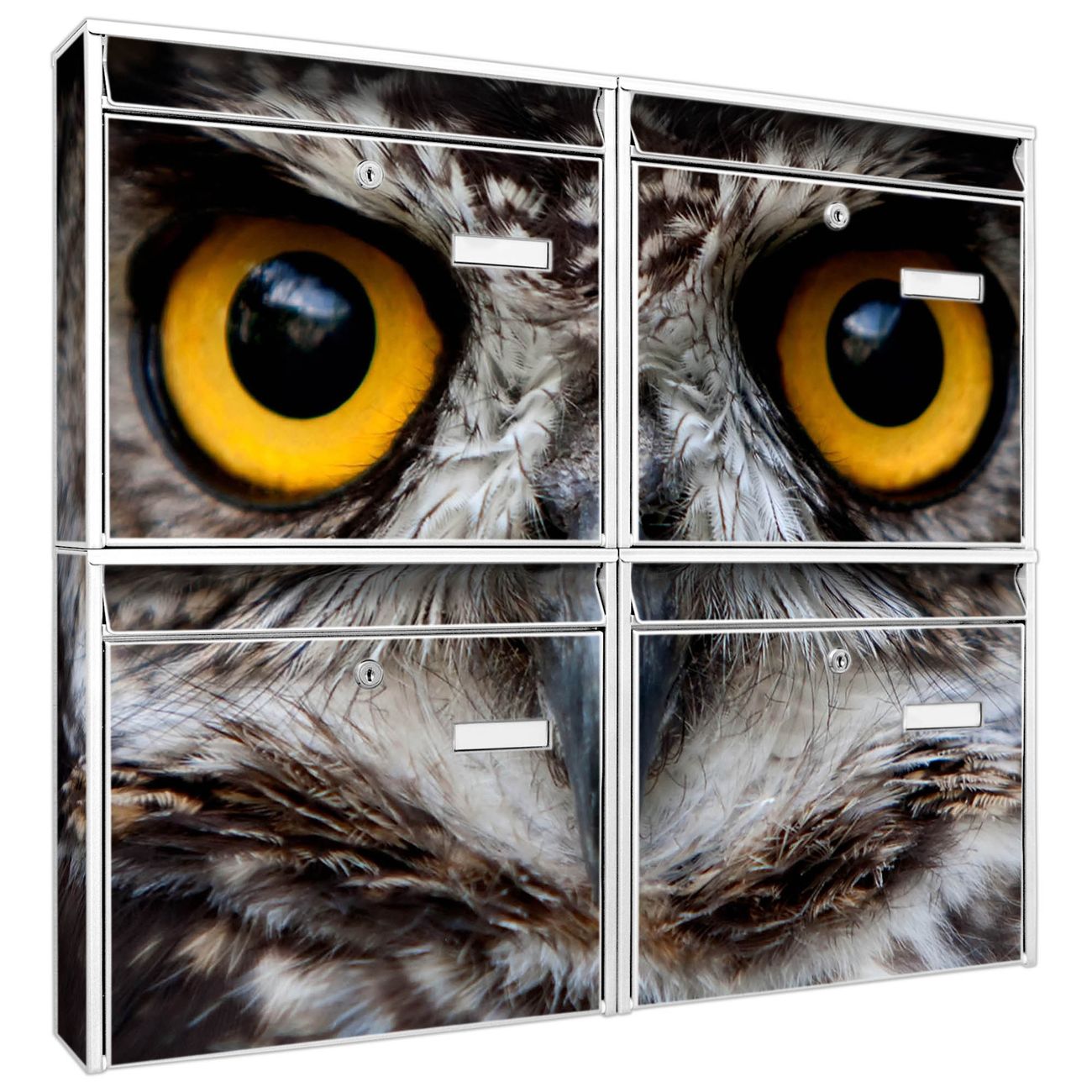 FUNKTION: Die Burg-Wächter Briefkastenanlage mit Motiv Monique bietet Ihnen ausreichend Fassungsvermögen um auch A4 und C4 Sendungen zu empfangen. Das integrierte Namensschild lässt sich individuell beschriften. Wählen Sie aus den Grundfarben weiß, silber und schwarz. DESIGN: Die 4 Briefkästen haben ein ansprechendes und zeitloses Design, ohne dabei auf Funktionalität zu verzichten. Das Material ist sehr stabil, wetterfest und rostfrei. Durch das Motiv Monique werden die Postkästen zu einem Blickfang. DETAILS: Die Postkästen bestehen aus verzinktem Stahl der zusätzlich mit Klarlack versiegelt wurde. Die Kästen sind gesamt 64,5cm hoch, 72,5cm breit und 10cm tief. Das Motiv besteht aus einer wetter- und UV-festen Folie, die Ihren Briefkasten zusätzlich vor Kratzern schützt. Die Postkästen werden mit Montagematerial, je einem Namensschild und je zwei Schlüsseln geliefert. NUTZEN: Das Briefkastenset eignet sich für die Wandmontage, die Größe bietet genügend Platz für Sendungen aller Art. Das zeitlose Design sowie die stabile Bauart bieten Ihnen einen treuen Begleiter für Ihre Post. BANJADO: