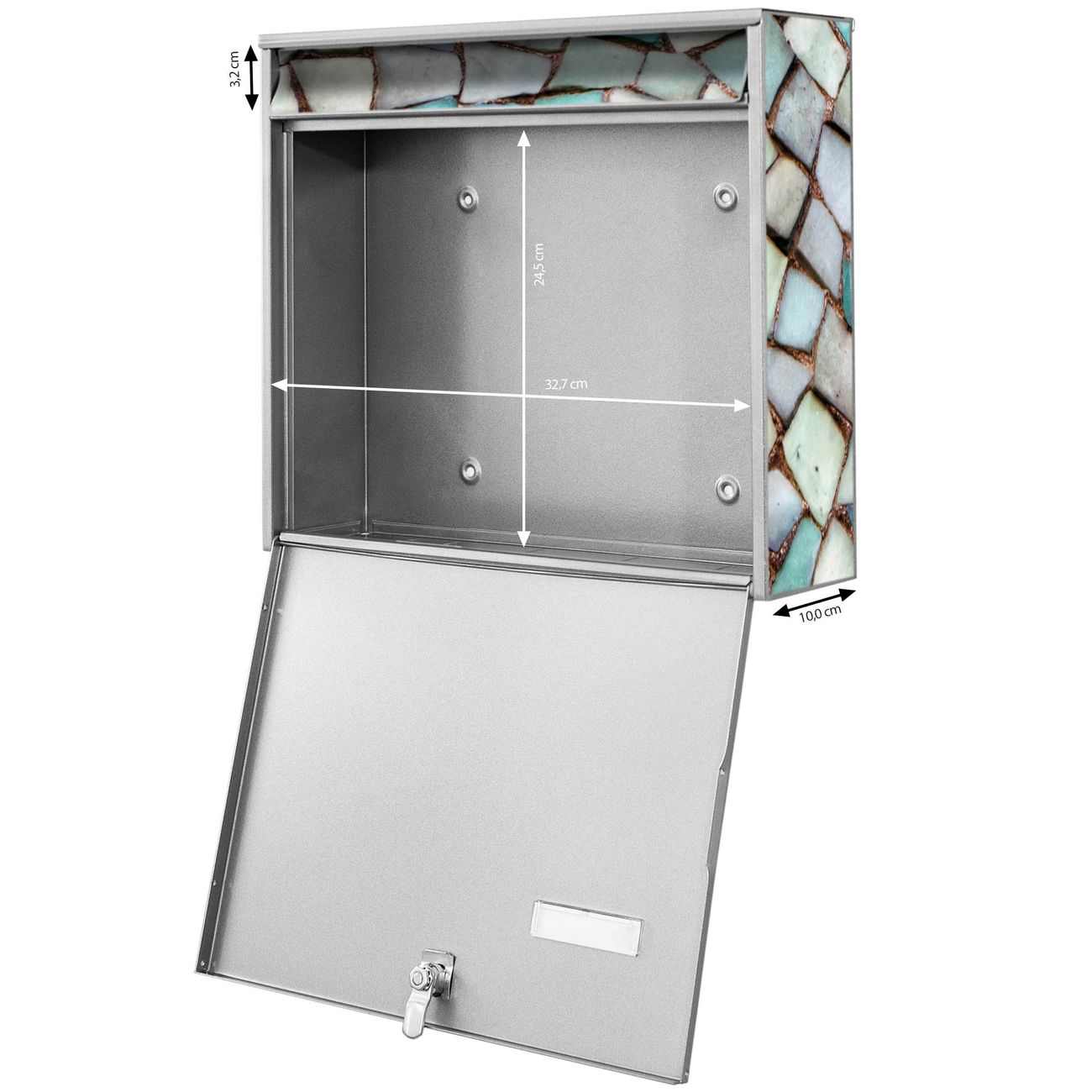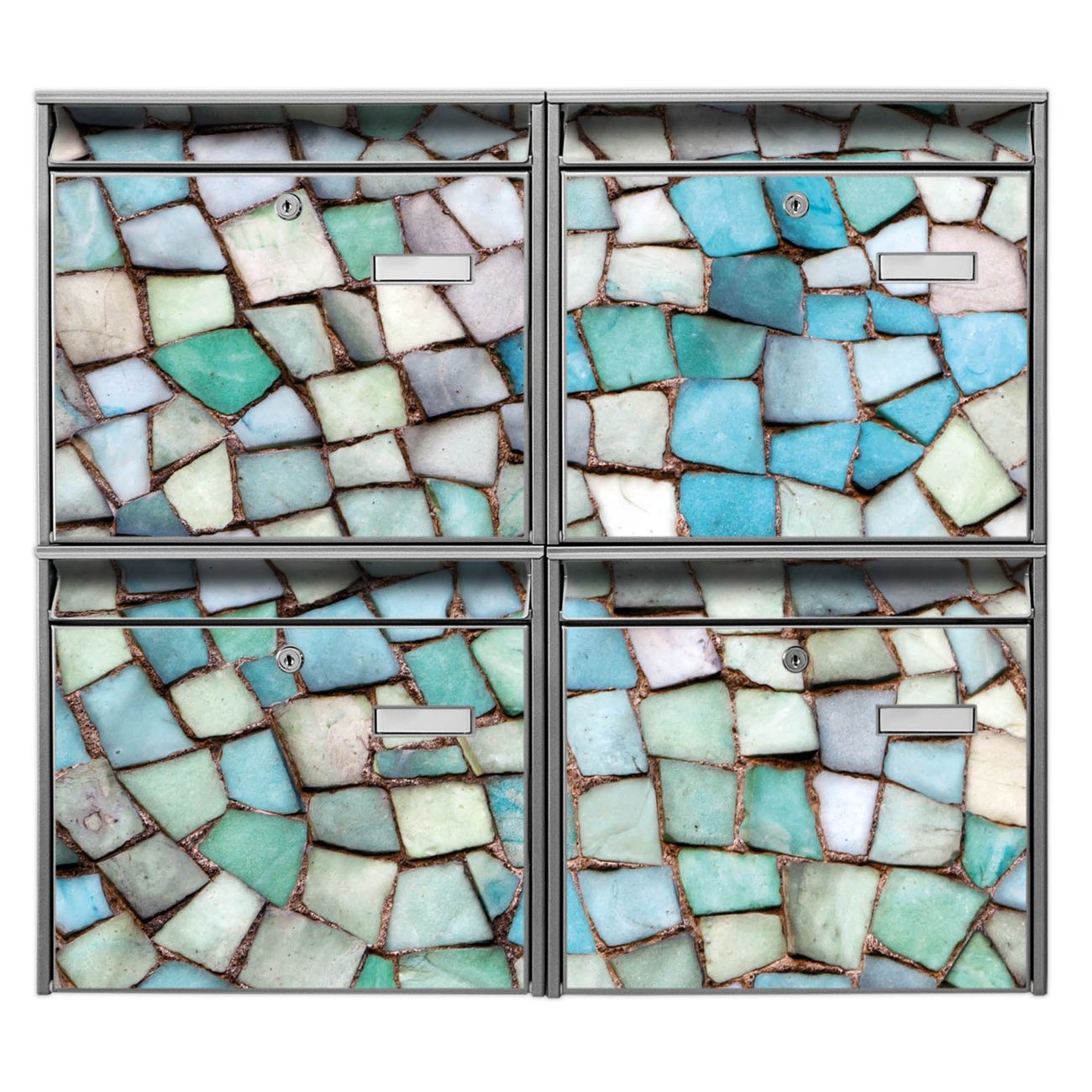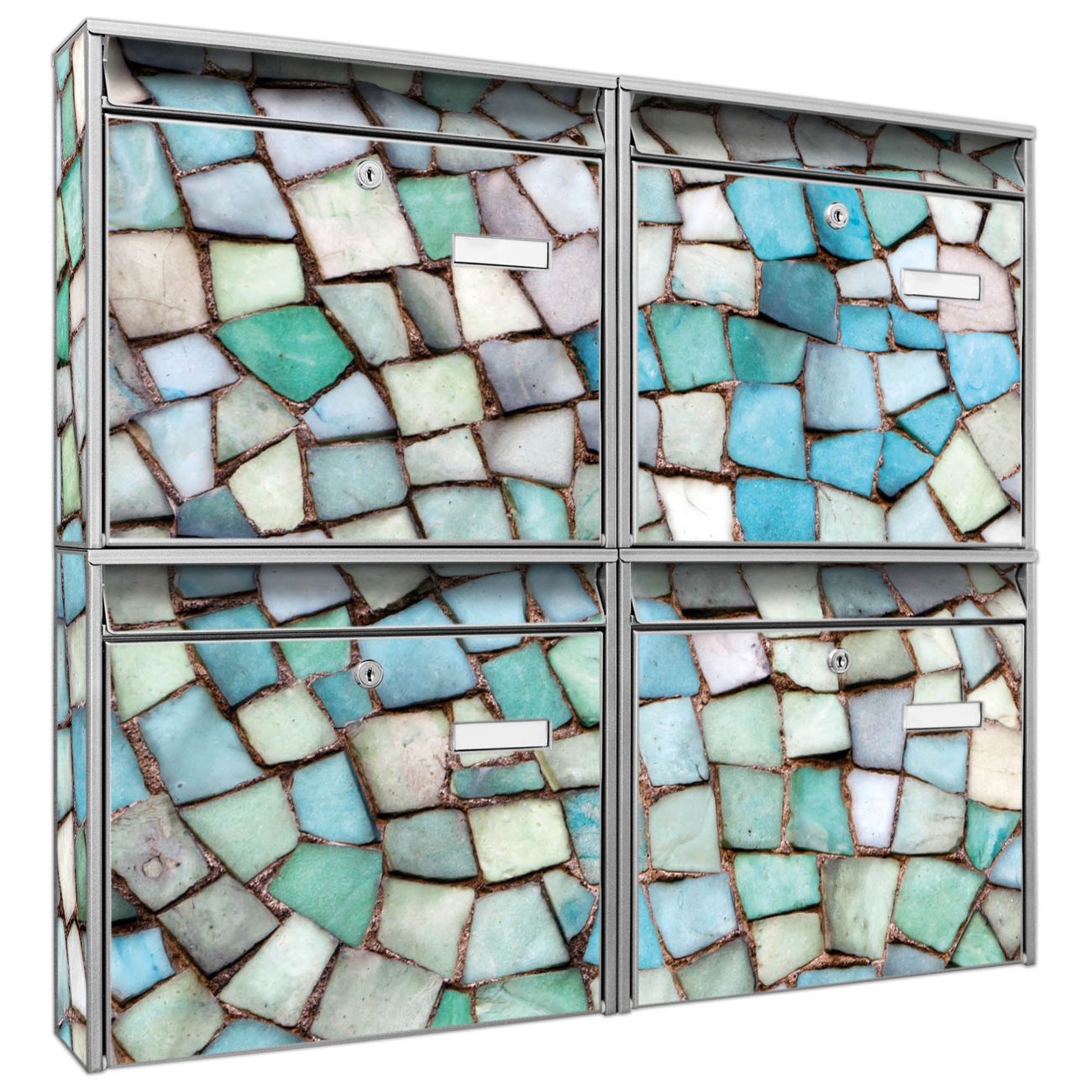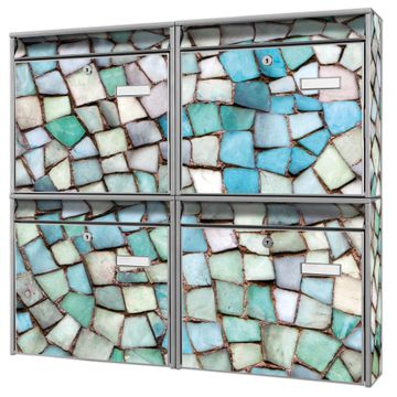 FUNKTION: Die Burg-Wächter Briefkastenanlage mit Motiv Mosaik Blau bietet Ihnen ausreichend Fassungsvermögen um auch A4 und C4 Sendungen zu empfangen. Das integrierte Namensschild lässt sich individuell beschriften. Wählen Sie aus den Grundfarben weiß, silber und schwarz. DESIGN: Die 4 Briefkästen haben ein ansprechendes und zeitloses Design, ohne dabei auf Funktionalität zu verzichten. Das Material ist sehr stabil, wetterfest und rostfrei. Durch das Motiv Mosaik Blau werden die Postkästen zu einem Blickfang. DETAILS: Die Postkästen bestehen aus verzinktem Stahl der zusätzlich mit Klarlack versiegelt wurde. Die Kästen sind gesamt 64,5cm hoch, 72,5cm breit und 10cm tief. Das Motiv besteht aus einer wetter- und UV-festen Folie, die Ihren Briefkasten zusätzlich vor Kratzern schützt. Die Postkästen werden mit Montagematerial, je einem Namensschild und je zwei Schlüsseln geliefert. NUTZEN: Das Briefkastenset eignet sich für die Wandmontage, die Größe bietet genügend Platz für Sendungen aller Art. Das zeitlose Design sowie die stabile Bauart bieten Ihnen einen treuen Begleiter für Ihre Post. BANJADO: