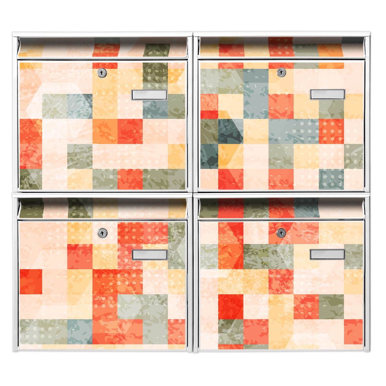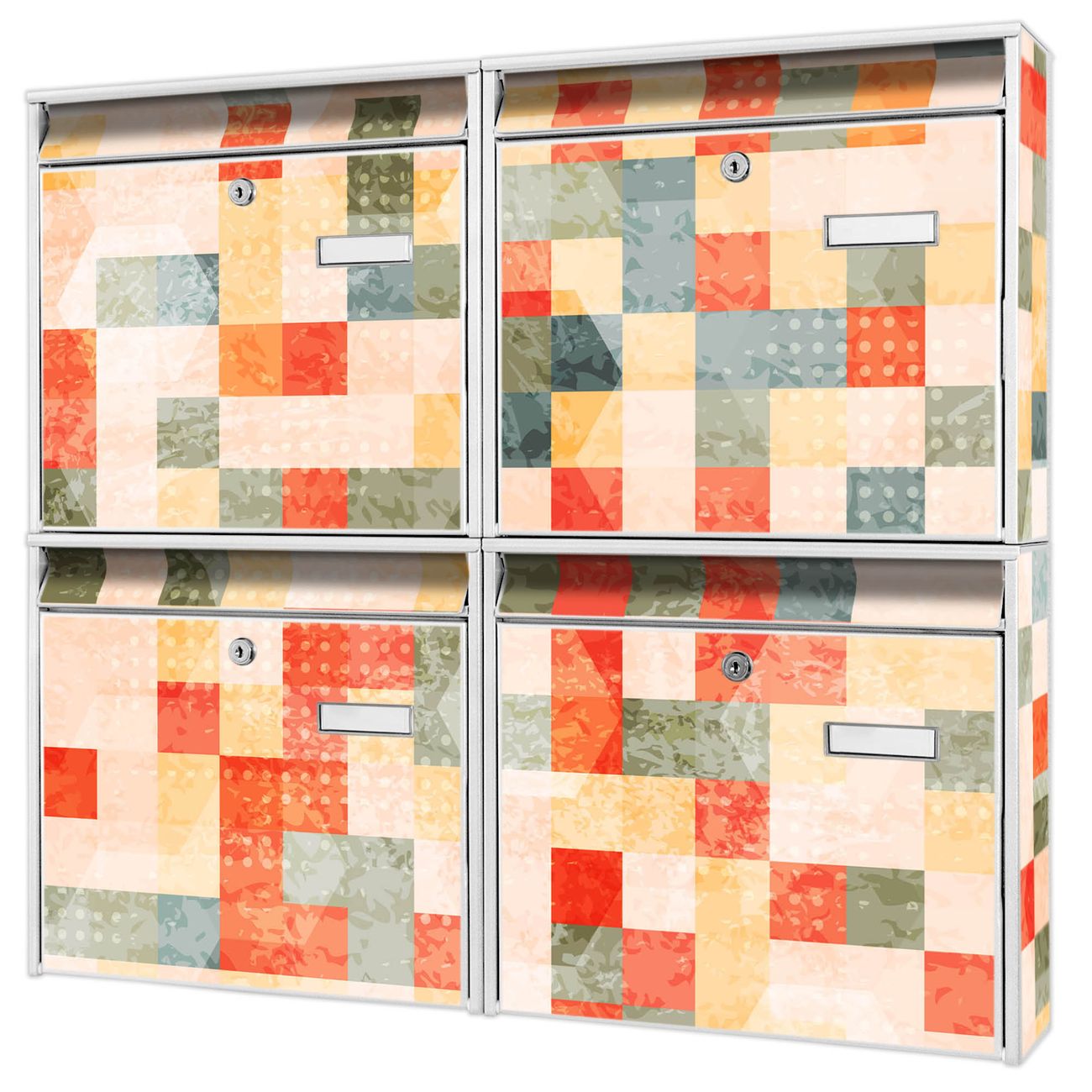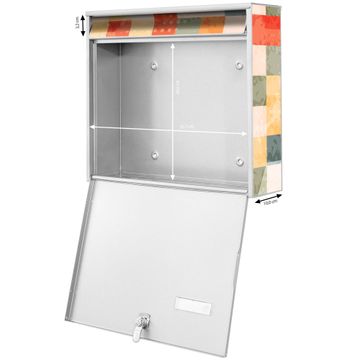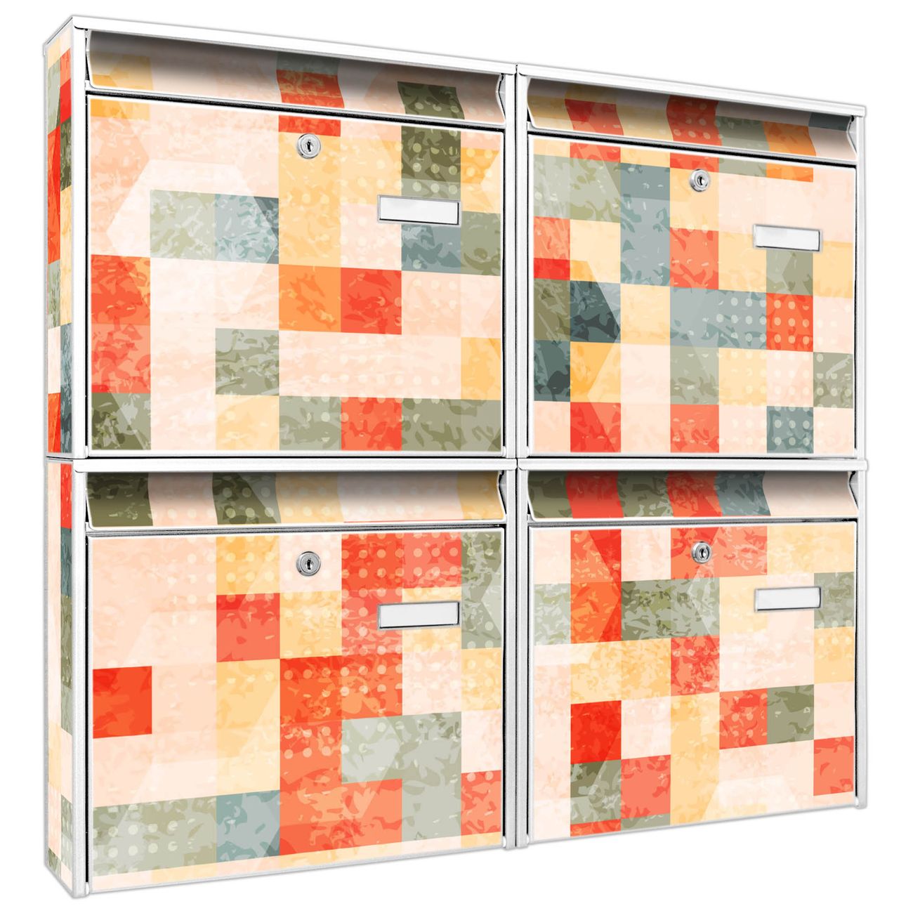 FUNKTION: Die Burg-Wächter Briefkastenanlage mit Motiv Mosaik Rot bietet Ihnen ausreichend Fassungsvermögen um auch A4 und C4 Sendungen zu empfangen. Das integrierte Namensschild lässt sich individuell beschriften. Wählen Sie aus den Grundfarben weiß, silber und schwarz. DESIGN: Die 4 Briefkästen haben ein ansprechendes und zeitloses Design, ohne dabei auf Funktionalität zu verzichten. Das Material ist sehr stabil, wetterfest und rostfrei. Durch das Motiv Mosaik Rot werden die Postkästen zu einem Blickfang. DETAILS: Die Postkästen bestehen aus verzinktem Stahl der zusätzlich mit Klarlack versiegelt wurde. Die Kästen sind gesamt 64,5cm hoch, 72,5cm breit und 10cm tief. Das Motiv besteht aus einer wetter- und UV-festen Folie, die Ihren Briefkasten zusätzlich vor Kratzern schützt. Die Postkästen werden mit Montagematerial, je einem Namensschild und je zwei Schlüsseln geliefert. NUTZEN: Das Briefkastenset eignet sich für die Wandmontage, die Größe bietet genügend Platz für Sendungen aller Art. Das zeitlose Design sowie die stabile Bauart bieten Ihnen einen treuen Begleiter für Ihre Post. BANJADO: