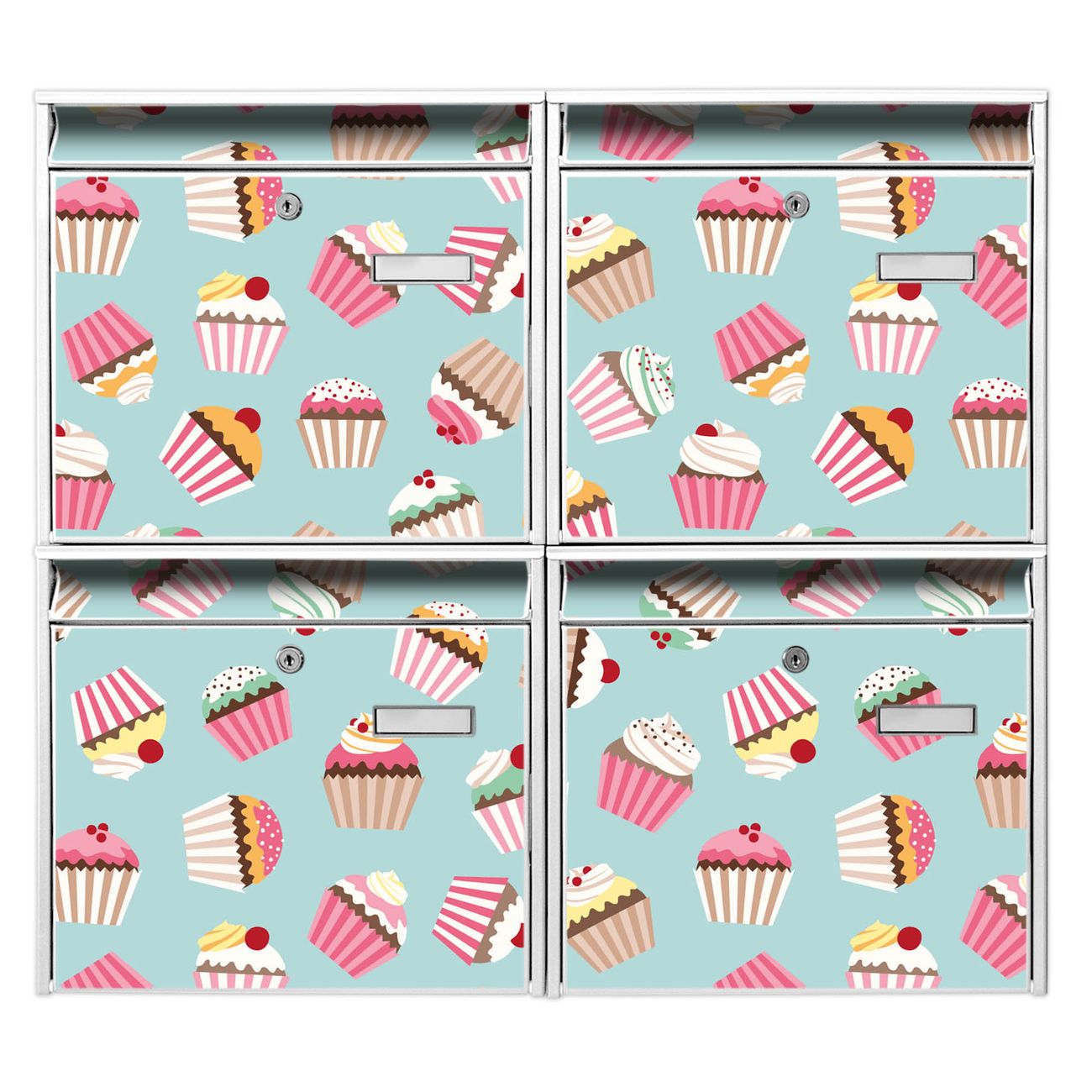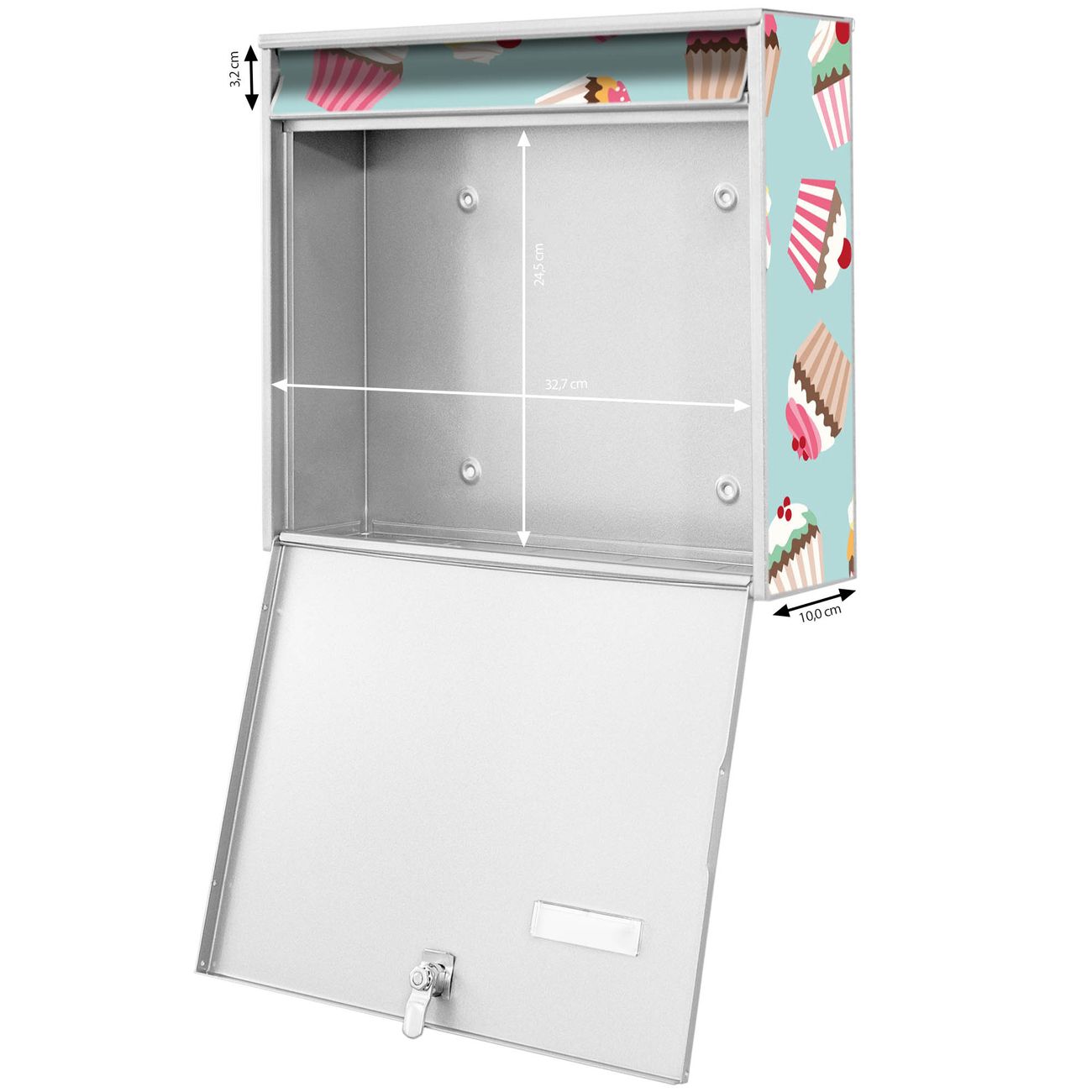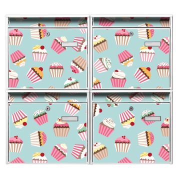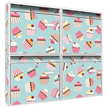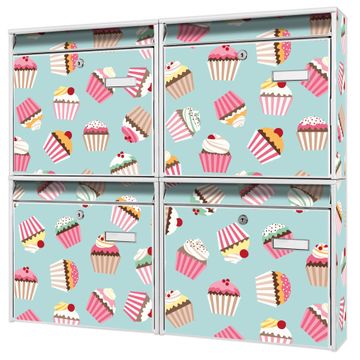 FUNKTION: Die Burg-Wächter Briefkastenanlage mit Motiv Muffins bietet Ihnen ausreichend Fassungsvermögen um auch A4 und C4 Sendungen zu empfangen. Das integrierte Namensschild lässt sich individuell beschriften. Wählen Sie aus den Grundfarben weiß, silber und schwarz. DESIGN: Die 4 Briefkästen haben ein ansprechendes und zeitloses Design, ohne dabei auf Funktionalität zu verzichten. Das Material ist sehr stabil, wetterfest und rostfrei. Durch das Motiv Muffins werden die Postkästen zu einem Blickfang. DETAILS: Die Postkästen bestehen aus verzinktem Stahl der zusätzlich mit Klarlack versiegelt wurde. Die Kästen sind gesamt 64,5cm hoch, 72,5cm breit und 10cm tief. Das Motiv besteht aus einer wetter- und UV-festen Folie, die Ihren Briefkasten zusätzlich vor Kratzern schützt. Die Postkästen werden mit Montagematerial, je einem Namensschild und je zwei Schlüsseln geliefert. NUTZEN: Das Briefkastenset eignet sich für die Wandmontage, die Größe bietet genügend Platz für Sendungen aller Art. Das zeitlose Design sowie die stabile Bauart bieten Ihnen einen treuen Begleiter für Ihre Post. BANJADO: