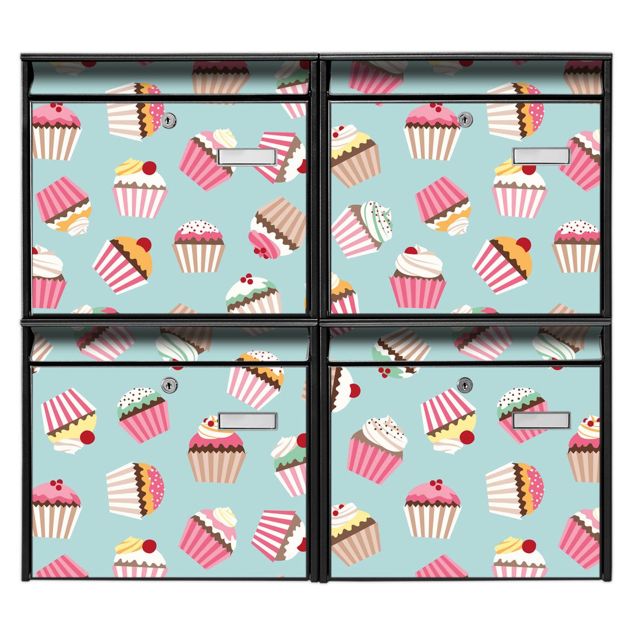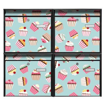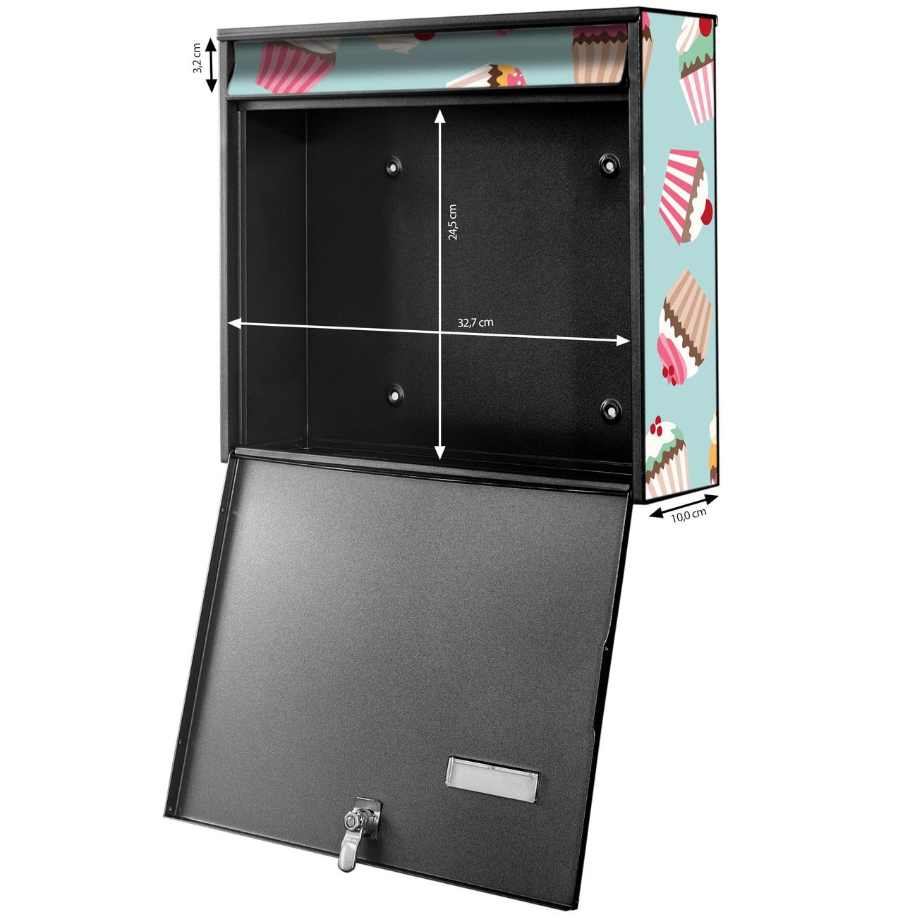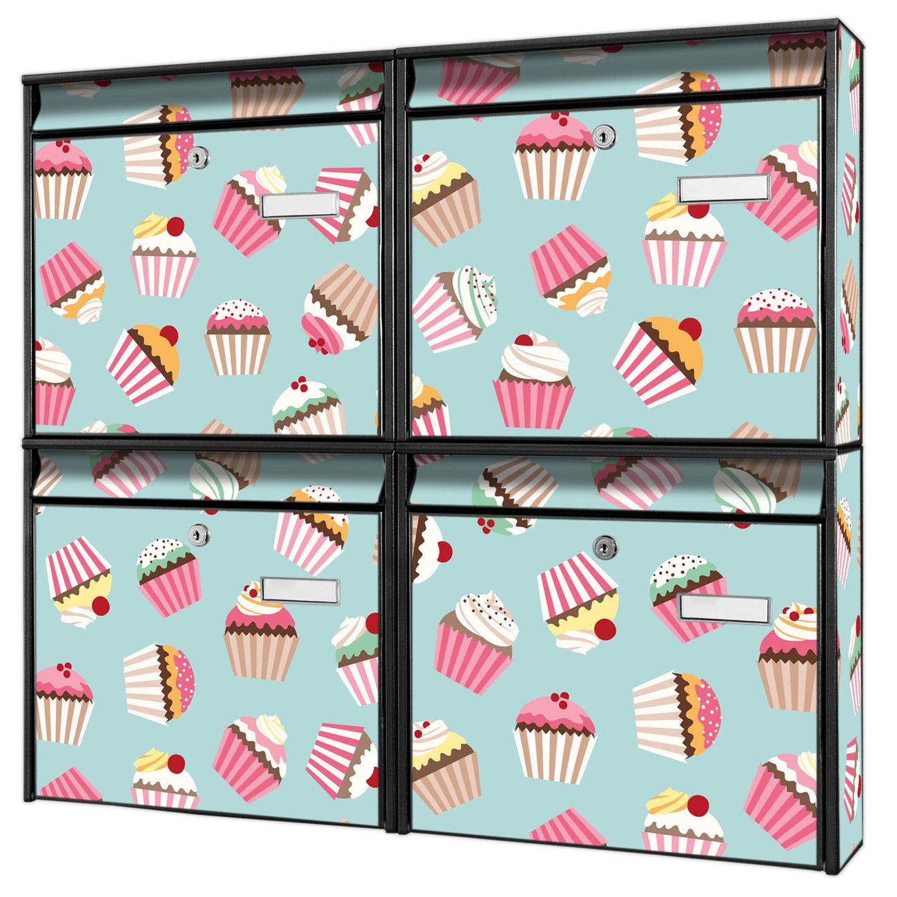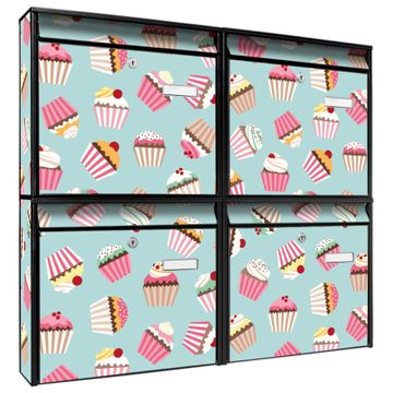 FUNKTION: Die Burg-Wächter Briefkastenanlage mit Motiv Muffins bietet Ihnen ausreichend Fassungsvermögen um auch A4 und C4 Sendungen zu empfangen. Das integrierte Namensschild lässt sich individuell beschriften. Wählen Sie aus den Grundfarben weiß, silber und schwarz. DESIGN: Die 4 Briefkästen haben ein ansprechendes und zeitloses Design, ohne dabei auf Funktionalität zu verzichten. Das Material ist sehr stabil, wetterfest und rostfrei. Durch das Motiv Muffins werden die Postkästen zu einem Blickfang. DETAILS: Die Postkästen bestehen aus verzinktem Stahl der zusätzlich mit Klarlack versiegelt wurde. Die Kästen sind gesamt 64,5cm hoch, 72,5cm breit und 10cm tief. Das Motiv besteht aus einer wetter- und UV-festen Folie, die Ihren Briefkasten zusätzlich vor Kratzern schützt. Die Postkästen werden mit Montagematerial, je einem Namensschild und je zwei Schlüsseln geliefert. NUTZEN: Das Briefkastenset eignet sich für die Wandmontage, die Größe bietet genügend Platz für Sendungen aller Art. Das zeitlose Design sowie die stabile Bauart bieten Ihnen einen treuen Begleiter für Ihre Post. BANJADO: