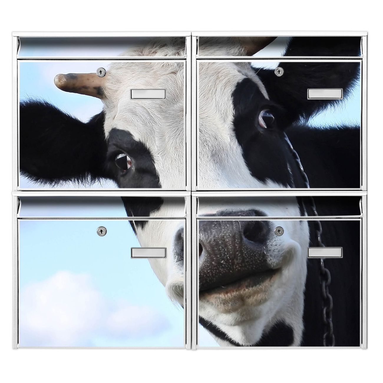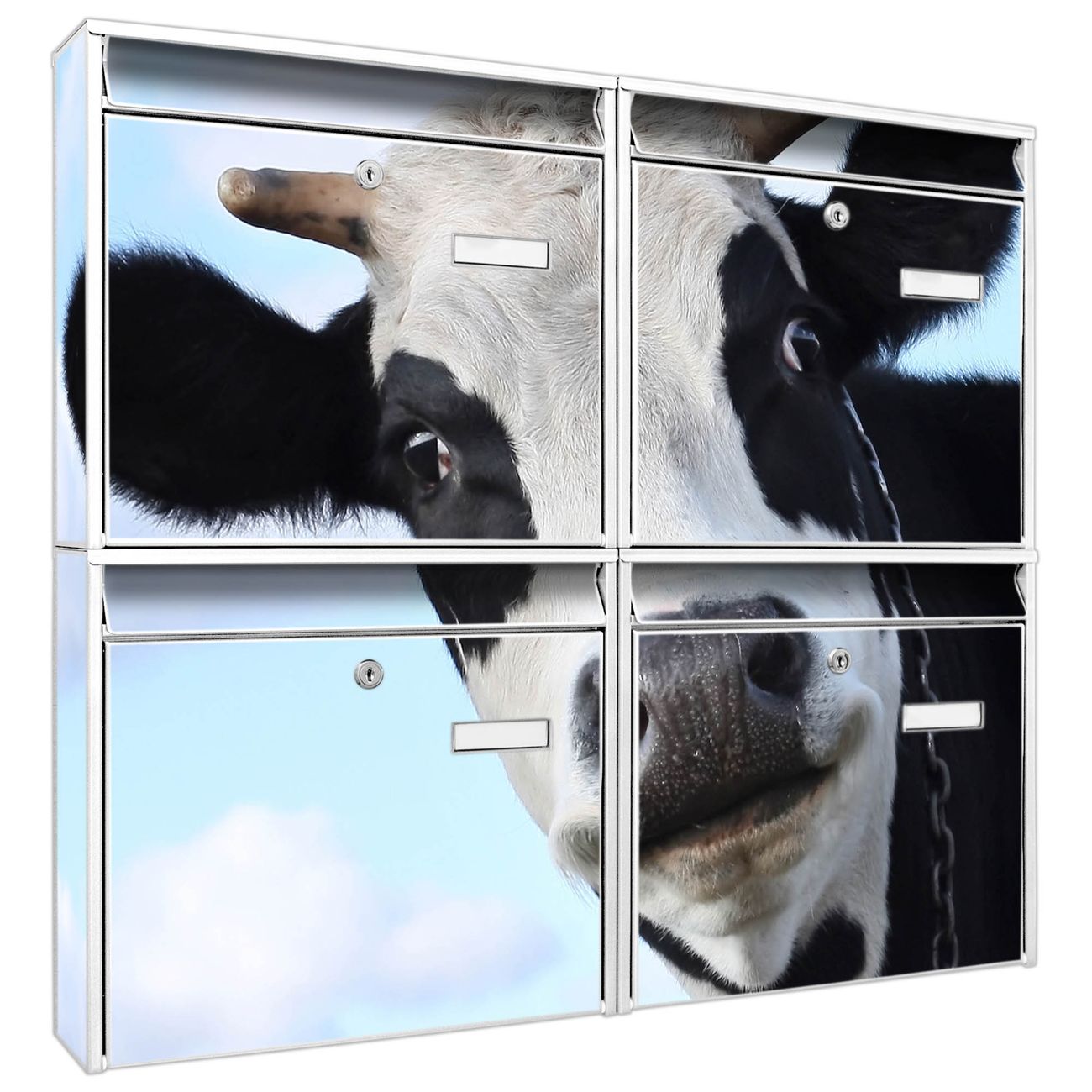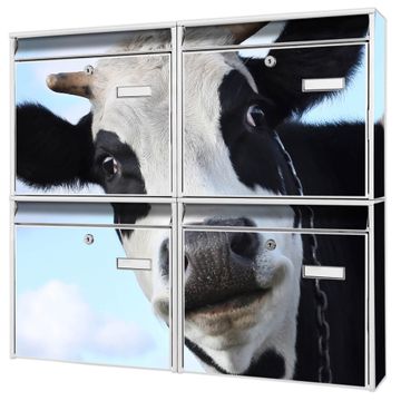 FUNKTION: Die Burg-Wächter Briefkastenanlage mit Motiv Muh bietet Ihnen ausreichend Fassungsvermögen um auch A4 und C4 Sendungen zu empfangen. Das integrierte Namensschild lässt sich individuell beschriften. Wählen Sie aus den Grundfarben weiß, silber und schwarz. DESIGN: Die 4 Briefkästen haben ein ansprechendes und zeitloses Design, ohne dabei auf Funktionalität zu verzichten. Das Material ist sehr stabil, wetterfest und rostfrei. Durch das Motiv Muh werden die Postkästen zu einem Blickfang. DETAILS: Die Postkästen bestehen aus verzinktem Stahl der zusätzlich mit Klarlack versiegelt wurde. Die Kästen sind gesamt 64,5cm hoch, 72,5cm breit und 10cm tief. Das Motiv besteht aus einer wetter- und UV-festen Folie, die Ihren Briefkasten zusätzlich vor Kratzern schützt. Die Postkästen werden mit Montagematerial, je einem Namensschild und je zwei Schlüsseln geliefert. NUTZEN: Das Briefkastenset eignet sich für die Wandmontage, die Größe bietet genügend Platz für Sendungen aller Art. Das zeitlose Design sowie die stabile Bauart bieten Ihnen einen treuen Begleiter für Ihre Post. BANJADO: