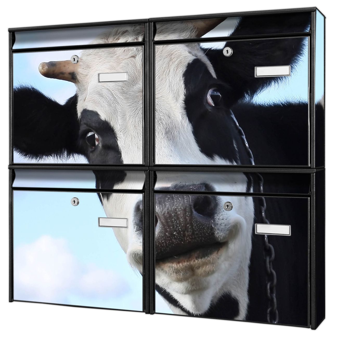 FUNKTION: Die Burg-Wächter Briefkastenanlage mit Motiv Muh bietet Ihnen ausreichend Fassungsvermögen um auch A4 und C4 Sendungen zu empfangen. Das integrierte Namensschild lässt sich individuell beschriften. Wählen Sie aus den Grundfarben weiß, silber und schwarz. DESIGN: Die 4 Briefkästen haben ein ansprechendes und zeitloses Design, ohne dabei auf Funktionalität zu verzichten. Das Material ist sehr stabil, wetterfest und rostfrei. Durch das Motiv Muh werden die Postkästen zu einem Blickfang. DETAILS: Die Postkästen bestehen aus verzinktem Stahl der zusätzlich mit Klarlack versiegelt wurde. Die Kästen sind gesamt 64,5cm hoch, 72,5cm breit und 10cm tief. Das Motiv besteht aus einer wetter- und UV-festen Folie, die Ihren Briefkasten zusätzlich vor Kratzern schützt. Die Postkästen werden mit Montagematerial, je einem Namensschild und je zwei Schlüsseln geliefert. NUTZEN: Das Briefkastenset eignet sich für die Wandmontage, die Größe bietet genügend Platz für Sendungen aller Art. Das zeitlose Design sowie die stabile Bauart bieten Ihnen einen treuen Begleiter für Ihre Post. BANJADO: