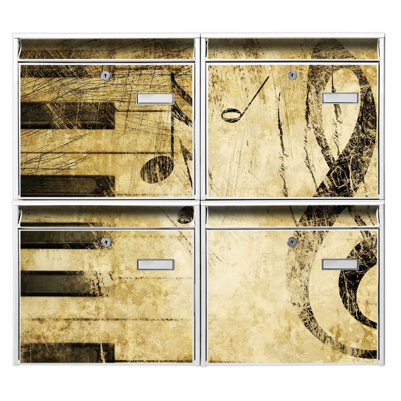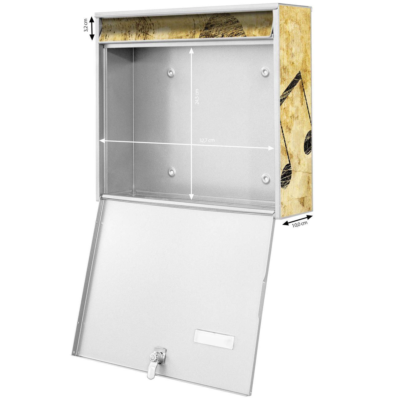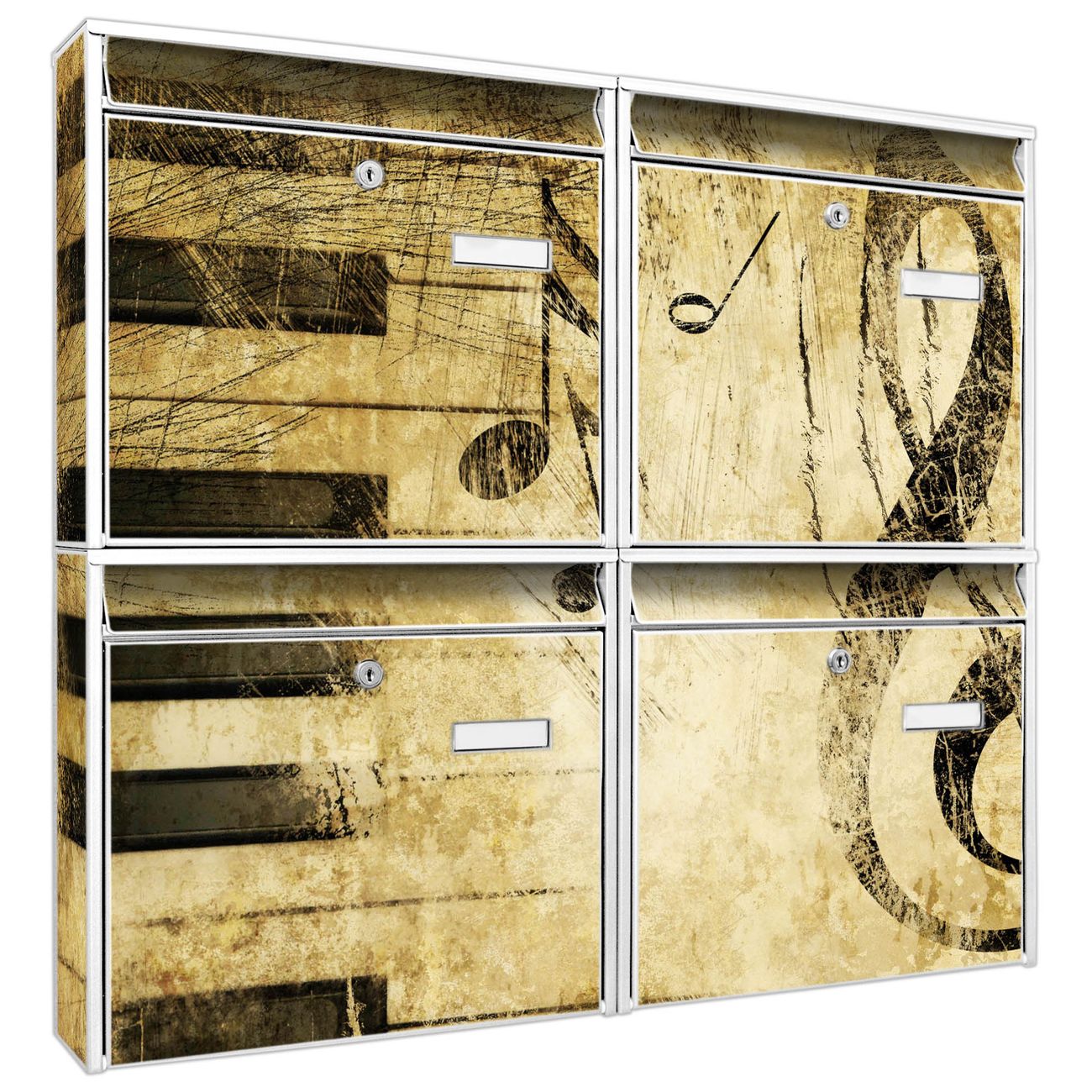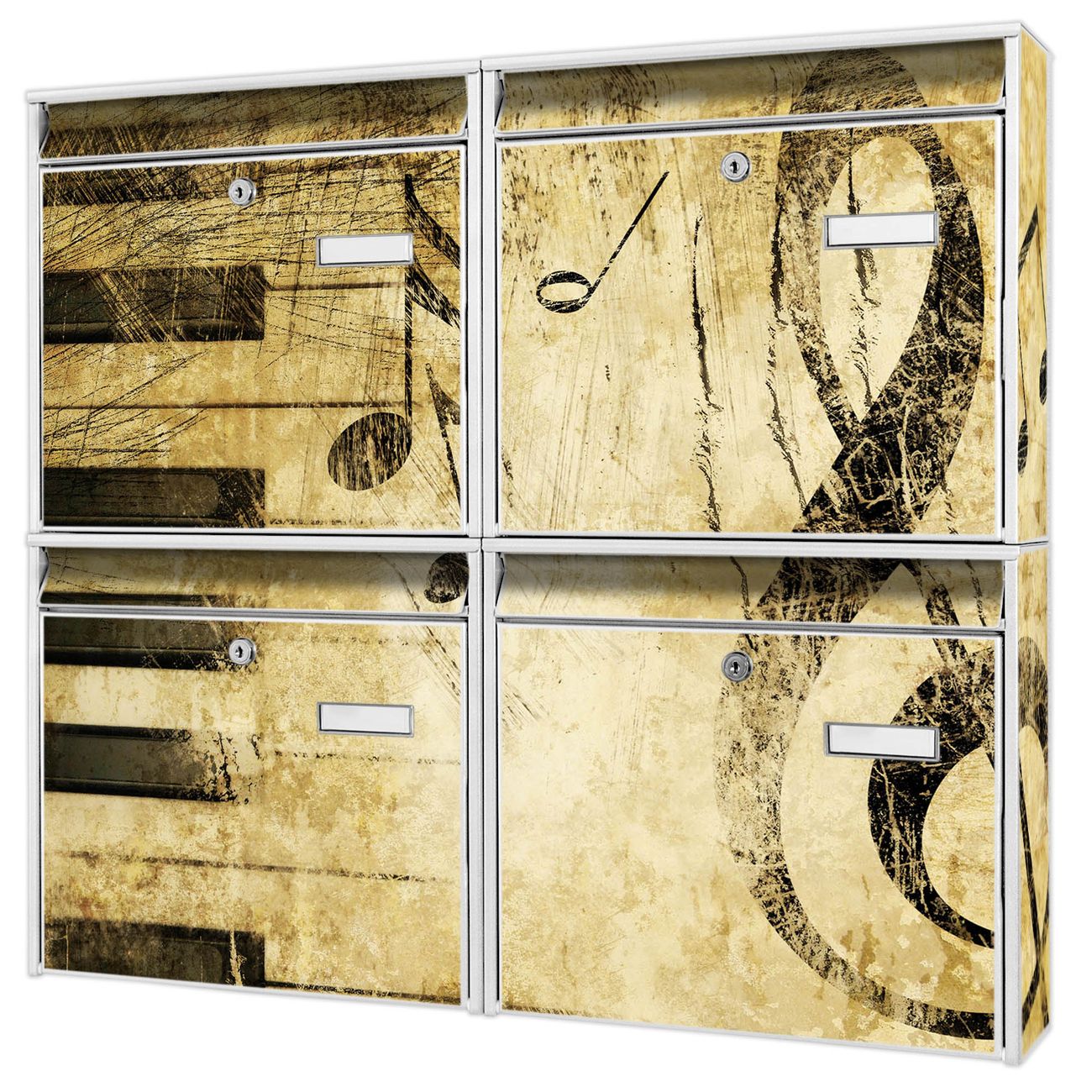 FUNKTION: Die Burg-Wächter Briefkastenanlage mit Motiv Music bietet Ihnen ausreichend Fassungsvermögen um auch A4 und C4 Sendungen zu empfangen. Das integrierte Namensschild lässt sich individuell beschriften. Wählen Sie aus den Grundfarben weiß, silber und schwarz. DESIGN: Die 4 Briefkästen haben ein ansprechendes und zeitloses Design, ohne dabei auf Funktionalität zu verzichten. Das Material ist sehr stabil, wetterfest und rostfrei. Durch das Motiv Music werden die Postkästen zu einem Blickfang. DETAILS: Die Postkästen bestehen aus verzinktem Stahl der zusätzlich mit Klarlack versiegelt wurde. Die Kästen sind gesamt 64,5cm hoch, 72,5cm breit und 10cm tief. Das Motiv besteht aus einer wetter- und UV-festen Folie, die Ihren Briefkasten zusätzlich vor Kratzern schützt. Die Postkästen werden mit Montagematerial, je einem Namensschild und je zwei Schlüsseln geliefert. NUTZEN: Das Briefkastenset eignet sich für die Wandmontage, die Größe bietet genügend Platz für Sendungen aller Art. Das zeitlose Design sowie die stabile Bauart bieten Ihnen einen treuen Begleiter für Ihre Post. BANJADO: