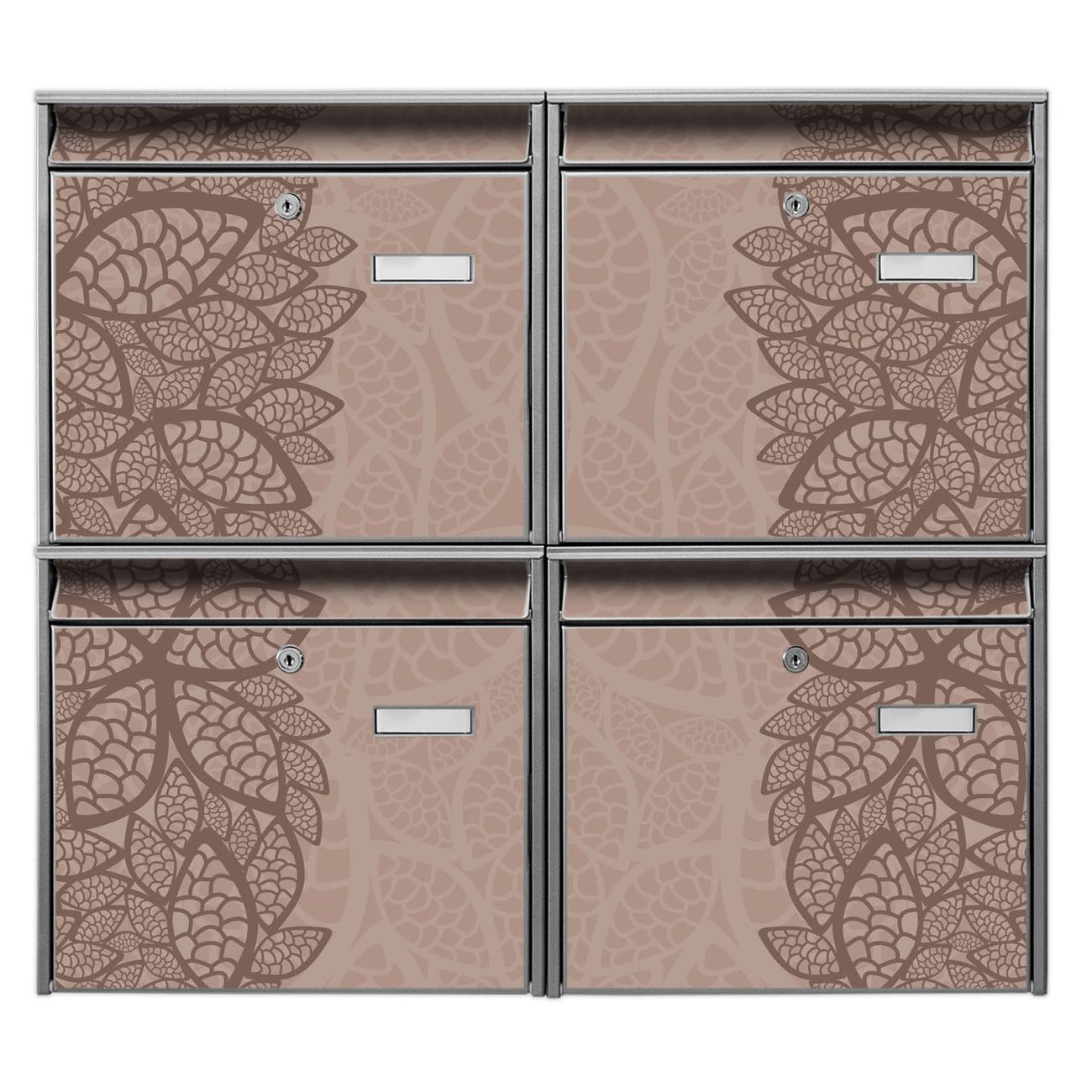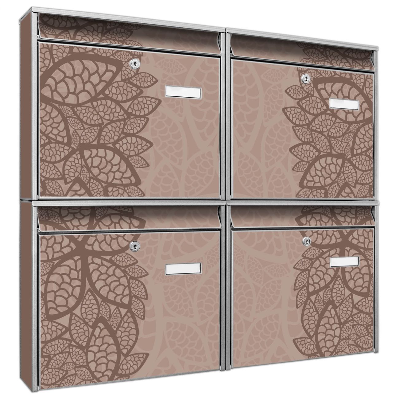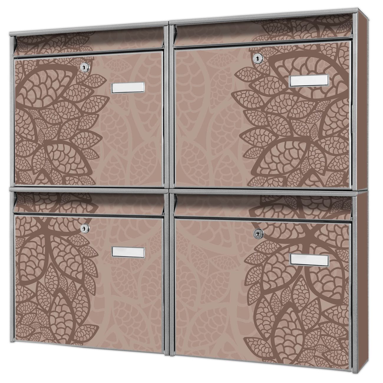 FUNKTION: Die Burg-Wächter Briefkastenanlage mit Motiv Muster Blätter bietet Ihnen ausreichend Fassungsvermögen um auch A4 und C4 Sendungen zu empfangen. Das integrierte Namensschild lässt sich individuell beschriften. Wählen Sie aus den Grundfarben weiß, silber und schwarz. DESIGN: Die 4 Briefkästen haben ein ansprechendes und zeitloses Design, ohne dabei auf Funktionalität zu verzichten. Das Material ist sehr stabil, wetterfest und rostfrei. Durch das Motiv Muster Blätter werden die Postkästen zu einem Blickfang. DETAILS: Die Postkästen bestehen aus verzinktem Stahl der zusätzlich mit Klarlack versiegelt wurde. Die Kästen sind gesamt 64,5cm hoch, 72,5cm breit und 10cm tief. Das Motiv besteht aus einer wetter- und UV-festen Folie, die Ihren Briefkasten zusätzlich vor Kratzern schützt. Die Postkästen werden mit Montagematerial, je einem Namensschild und je zwei Schlüsseln geliefert. NUTZEN: Das Briefkastenset eignet sich für die Wandmontage, die Größe bietet genügend Platz für Sendungen aller Art. Das zeitlose Design sowie die stabile Bauart bieten Ihnen einen treuen Begleiter für Ihre Post. BANJADO: