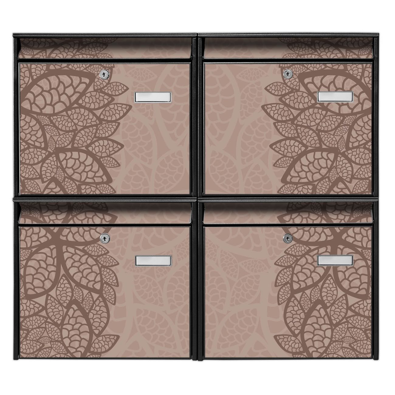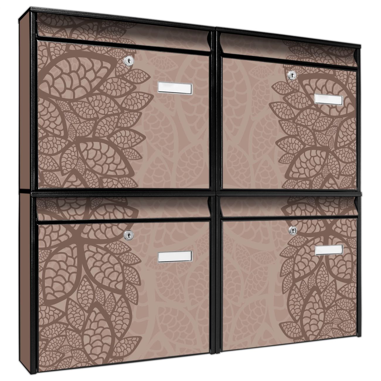 FUNKTION: Die Burg-Wächter Briefkastenanlage mit Motiv Muster Blätter bietet Ihnen ausreichend Fassungsvermögen um auch A4 und C4 Sendungen zu empfangen. Das integrierte Namensschild lässt sich individuell beschriften. Wählen Sie aus den Grundfarben weiß, silber und schwarz. DESIGN: Die 4 Briefkästen haben ein ansprechendes und zeitloses Design, ohne dabei auf Funktionalität zu verzichten. Das Material ist sehr stabil, wetterfest und rostfrei. Durch das Motiv Muster Blätter werden die Postkästen zu einem Blickfang. DETAILS: Die Postkästen bestehen aus verzinktem Stahl der zusätzlich mit Klarlack versiegelt wurde. Die Kästen sind gesamt 64,5cm hoch, 72,5cm breit und 10cm tief. Das Motiv besteht aus einer wetter- und UV-festen Folie, die Ihren Briefkasten zusätzlich vor Kratzern schützt. Die Postkästen werden mit Montagematerial, je einem Namensschild und je zwei Schlüsseln geliefert. NUTZEN: Das Briefkastenset eignet sich für die Wandmontage, die Größe bietet genügend Platz für Sendungen aller Art. Das zeitlose Design sowie die stabile Bauart bieten Ihnen einen treuen Begleiter für Ihre Post. BANJADO:
