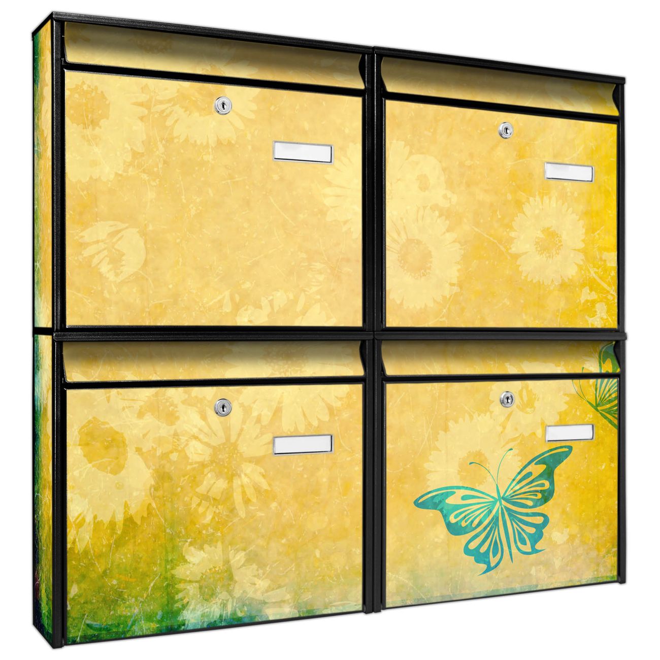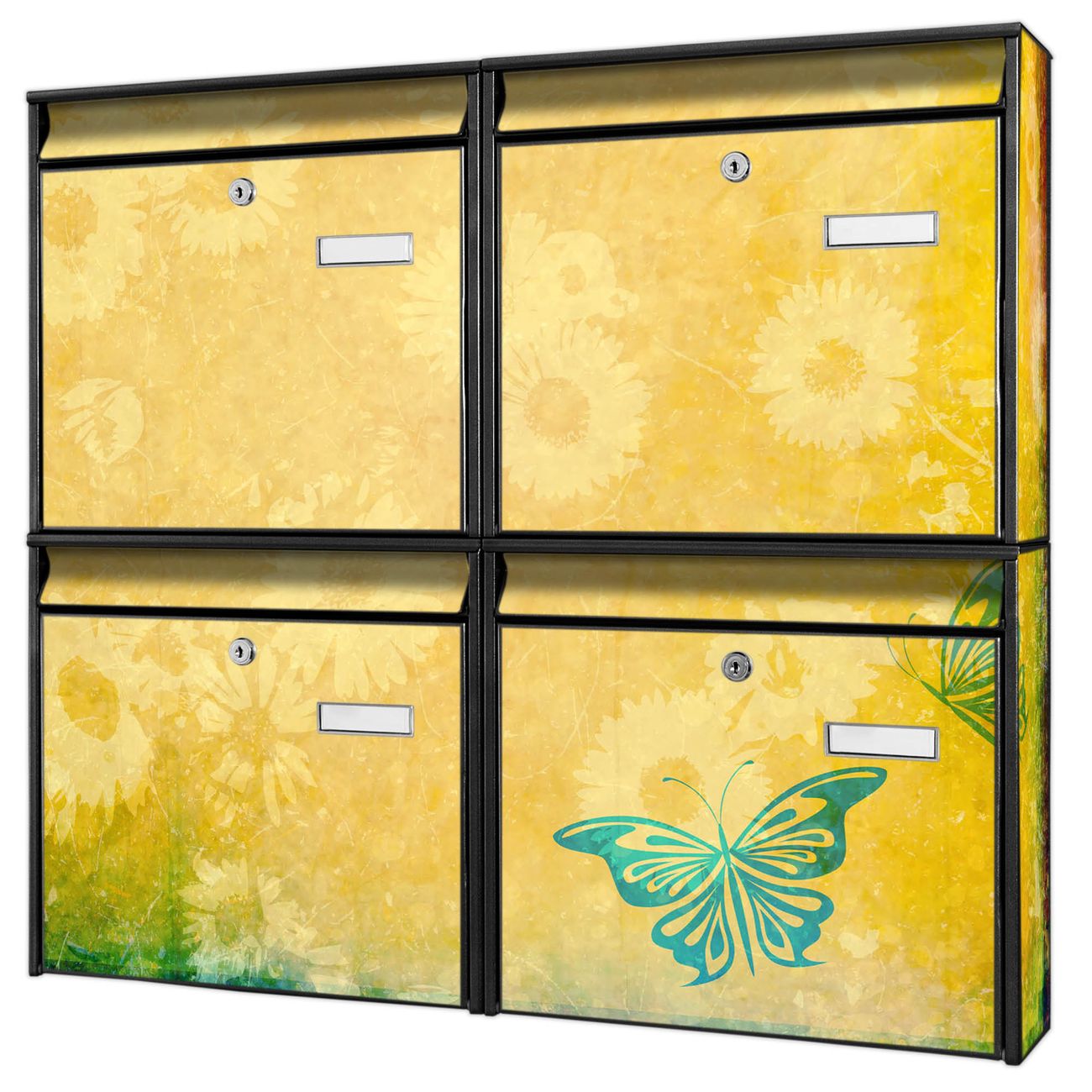 FUNKTION: Die Burg-Wächter Briefkastenanlage mit Motiv Muster Sommer bietet Ihnen ausreichend Fassungsvermögen um auch A4 und C4 Sendungen zu empfangen. Das integrierte Namensschild lässt sich individuell beschriften. Wählen Sie aus den Grundfarben weiß, silber und schwarz. DESIGN: Die 4 Briefkästen haben ein ansprechendes und zeitloses Design, ohne dabei auf Funktionalität zu verzichten. Das Material ist sehr stabil, wetterfest und rostfrei. Durch das Motiv Muster Sommer werden die Postkästen zu einem Blickfang. DETAILS: Die Postkästen bestehen aus verzinktem Stahl der zusätzlich mit Klarlack versiegelt wurde. Die Kästen sind gesamt 64,5cm hoch, 72,5cm breit und 10cm tief. Das Motiv besteht aus einer wetter- und UV-festen Folie, die Ihren Briefkasten zusätzlich vor Kratzern schützt. Die Postkästen werden mit Montagematerial, je einem Namensschild und je zwei Schlüsseln geliefert. NUTZEN: Das Briefkastenset eignet sich für die Wandmontage, die Größe bietet genügend Platz für Sendungen aller Art. Das zeitlose Design sowie die stabile Bauart bieten Ihnen einen treuen Begleiter für Ihre Post. BANJADO: