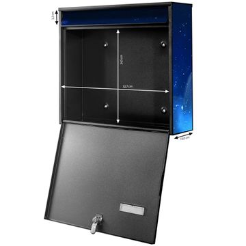 FUNKTION: Die Burg-Wächter Briefkastenanlage mit Motiv Nachthimmel 1 bietet Ihnen ausreichend Fassungsvermögen um auch A4 und C4 Sendungen zu empfangen. Das integrierte Namensschild lässt sich individuell beschriften. Wählen Sie aus den Grundfarben weiß, silber und schwarz. DESIGN: Die 4 Briefkästen haben ein ansprechendes und zeitloses Design, ohne dabei auf Funktionalität zu verzichten. Das Material ist sehr stabil, wetterfest und rostfrei. Durch das Motiv Nachthimmel 1 werden die Postkästen zu einem Blickfang. DETAILS: Die Postkästen bestehen aus verzinktem Stahl der zusätzlich mit Klarlack versiegelt wurde. Die Kästen sind gesamt 64,5cm hoch, 72,5cm breit und 10cm tief. Das Motiv besteht aus einer wetter- und UV-festen Folie, die Ihren Briefkasten zusätzlich vor Kratzern schützt. Die Postkästen werden mit Montagematerial, je einem Namensschild und je zwei Schlüsseln geliefert. NUTZEN: Das Briefkastenset eignet sich für die Wandmontage, die Größe bietet genügend Platz für Sendungen aller Art. Das zeitlose Design sowie die stabile Bauart bieten Ihnen einen treuen Begleiter für Ihre Post. BANJADO: