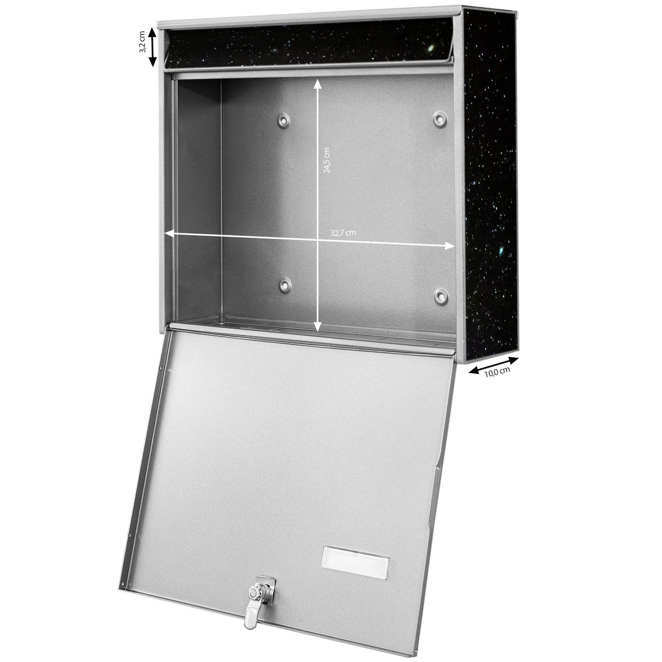 FUNKTION: Die Burg-Wächter Briefkastenanlage mit Motiv Nachthimmel bietet Ihnen ausreichend Fassungsvermögen um auch A4 und C4 Sendungen zu empfangen. Das integrierte Namensschild lässt sich individuell beschriften. Wählen Sie aus den Grundfarben weiß, silber und schwarz. DESIGN: Die 4 Briefkästen haben ein ansprechendes und zeitloses Design, ohne dabei auf Funktionalität zu verzichten. Das Material ist sehr stabil, wetterfest und rostfrei. Durch das Motiv Nachthimmel werden die Postkästen zu einem Blickfang. DETAILS: Die Postkästen bestehen aus verzinktem Stahl der zusätzlich mit Klarlack versiegelt wurde. Die Kästen sind gesamt 64,5cm hoch, 72,5cm breit und 10cm tief. Das Motiv besteht aus einer wetter- und UV-festen Folie, die Ihren Briefkasten zusätzlich vor Kratzern schützt. Die Postkästen werden mit Montagematerial, je einem Namensschild und je zwei Schlüsseln geliefert. NUTZEN: Das Briefkastenset eignet sich für die Wandmontage, die Größe bietet genügend Platz für Sendungen aller Art. Das zeitlose Design sowie die stabile Bauart bieten Ihnen einen treuen Begleiter für Ihre Post. BANJADO:
