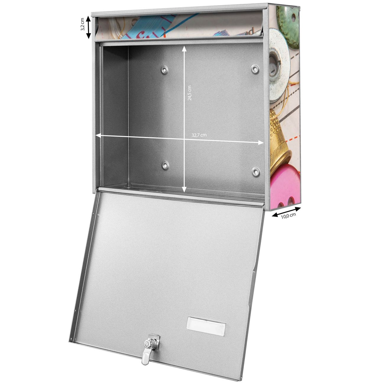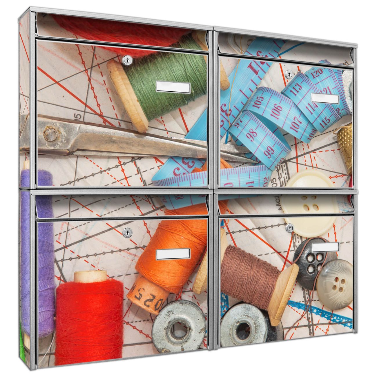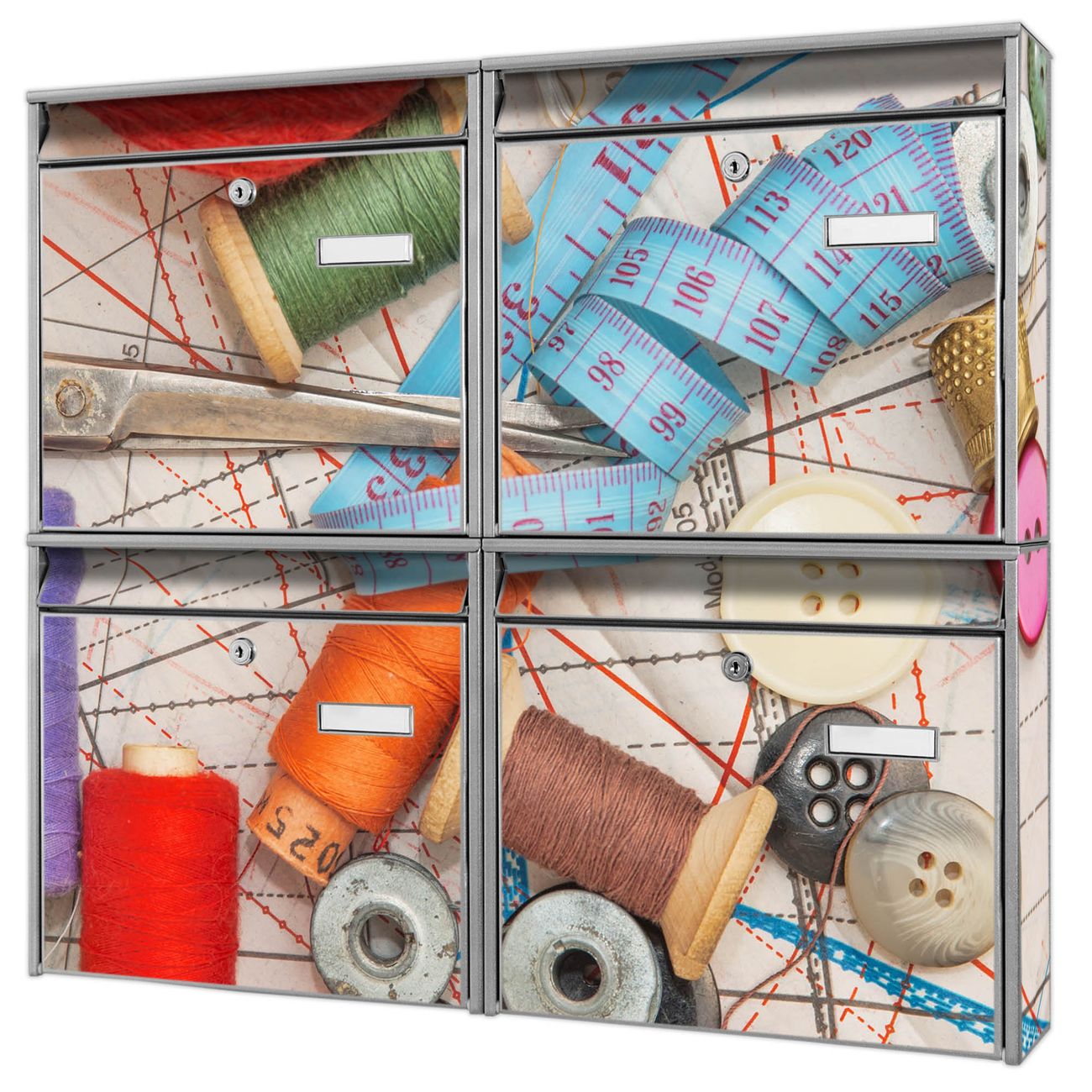 FUNKTION: Die Burg-Wächter Briefkastenanlage mit Motiv Nähen bietet Ihnen ausreichend Fassungsvermögen um auch A4 und C4 Sendungen zu empfangen. Das integrierte Namensschild lässt sich individuell beschriften. Wählen Sie aus den Grundfarben weiß, silber und schwarz. DESIGN: Die 4 Briefkästen haben ein ansprechendes und zeitloses Design, ohne dabei auf Funktionalität zu verzichten. Das Material ist sehr stabil, wetterfest und rostfrei. Durch das Motiv Nähen werden die Postkästen zu einem Blickfang. DETAILS: Die Postkästen bestehen aus verzinktem Stahl der zusätzlich mit Klarlack versiegelt wurde. Die Kästen sind gesamt 64,5cm hoch, 72,5cm breit und 10cm tief. Das Motiv besteht aus einer wetter- und UV-festen Folie, die Ihren Briefkasten zusätzlich vor Kratzern schützt. Die Postkästen werden mit Montagematerial, je einem Namensschild und je zwei Schlüsseln geliefert. NUTZEN: Das Briefkastenset eignet sich für die Wandmontage, die Größe bietet genügend Platz für Sendungen aller Art. Das zeitlose Design sowie die stabile Bauart bieten Ihnen einen treuen Begleiter für Ihre Post. BANJADO: