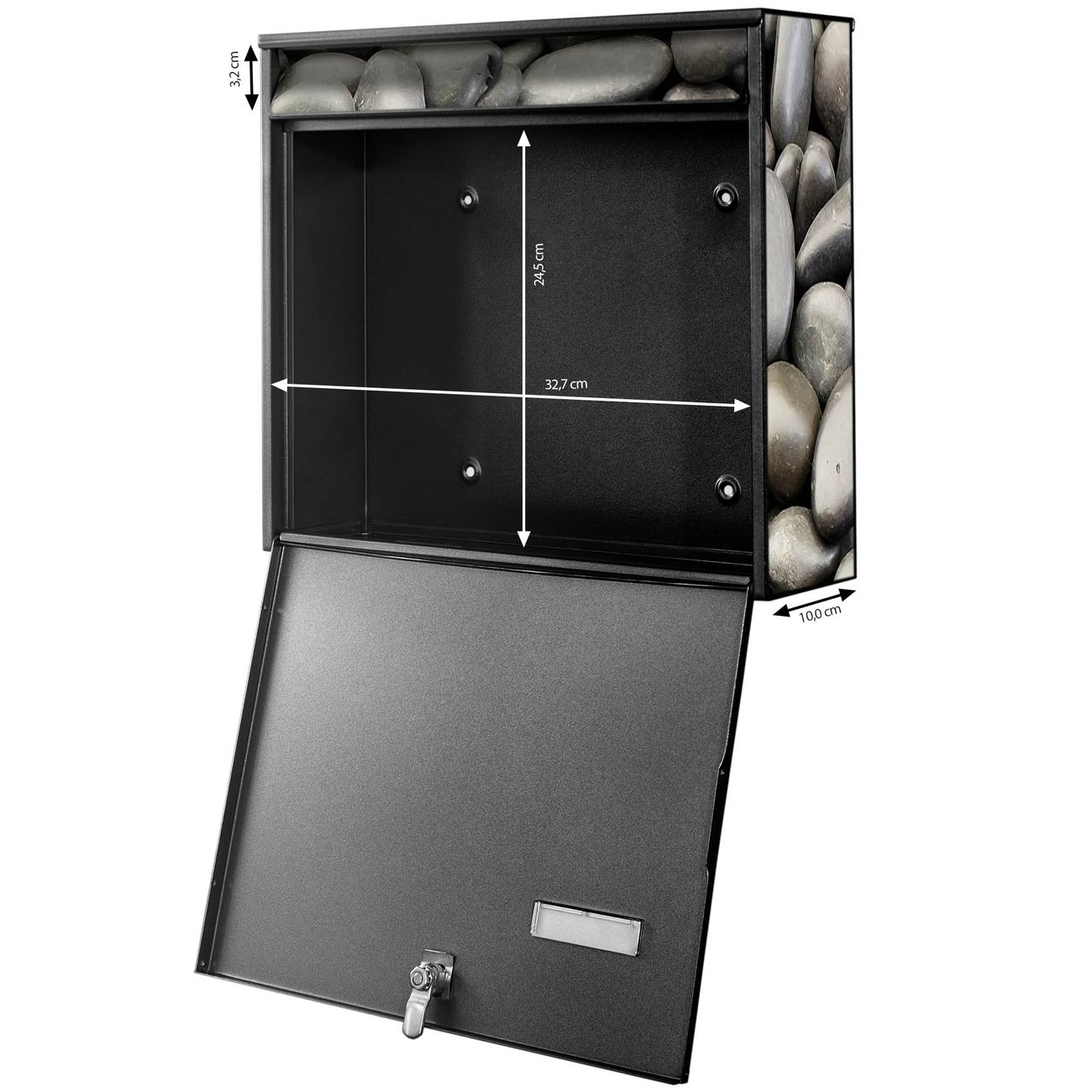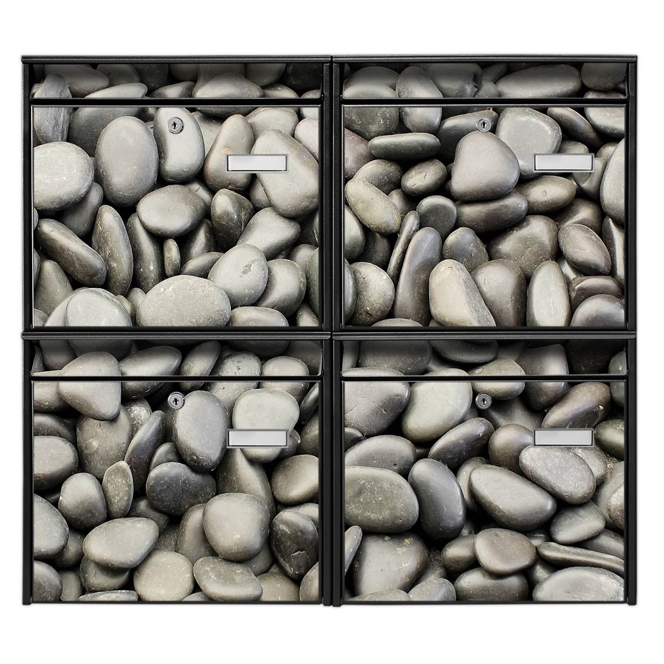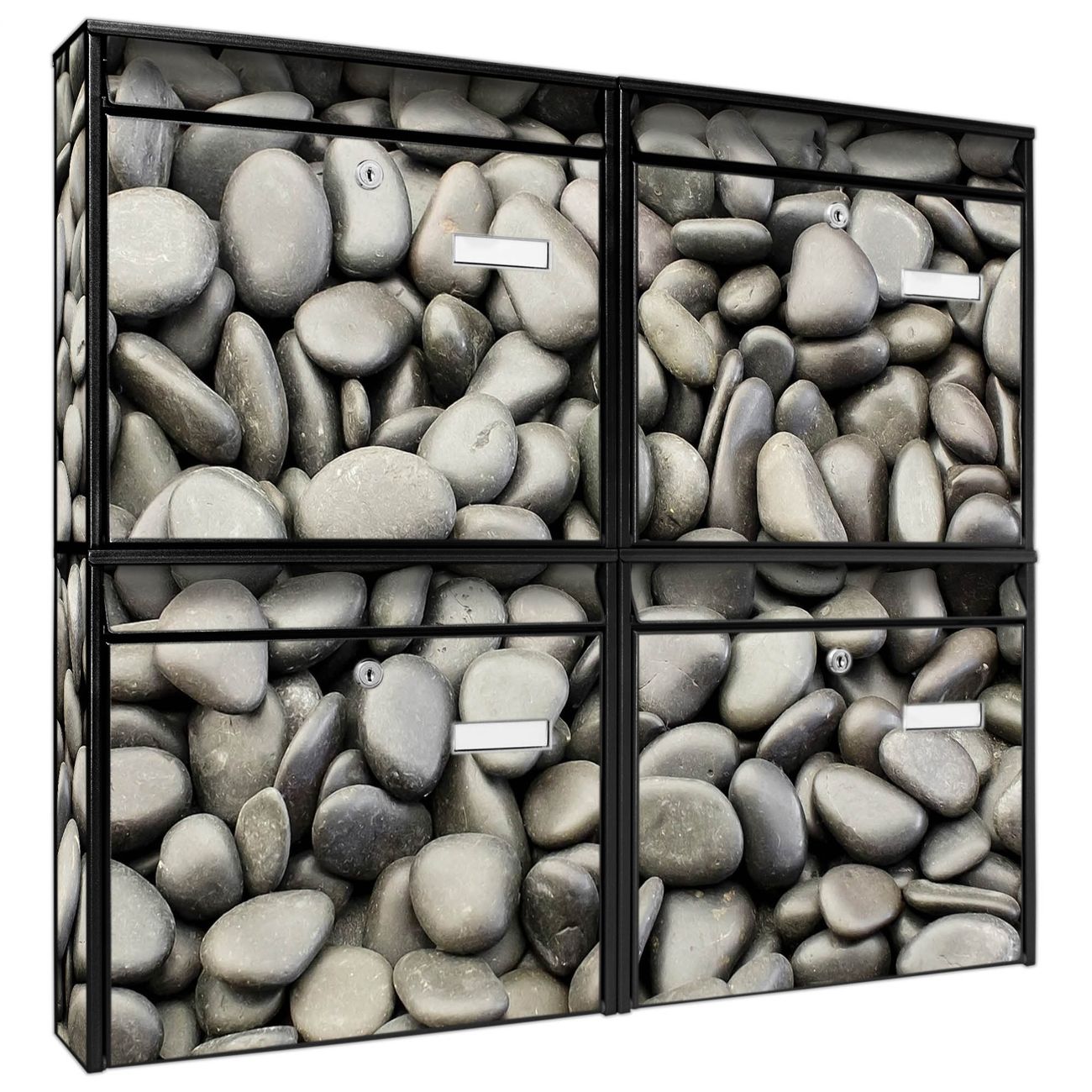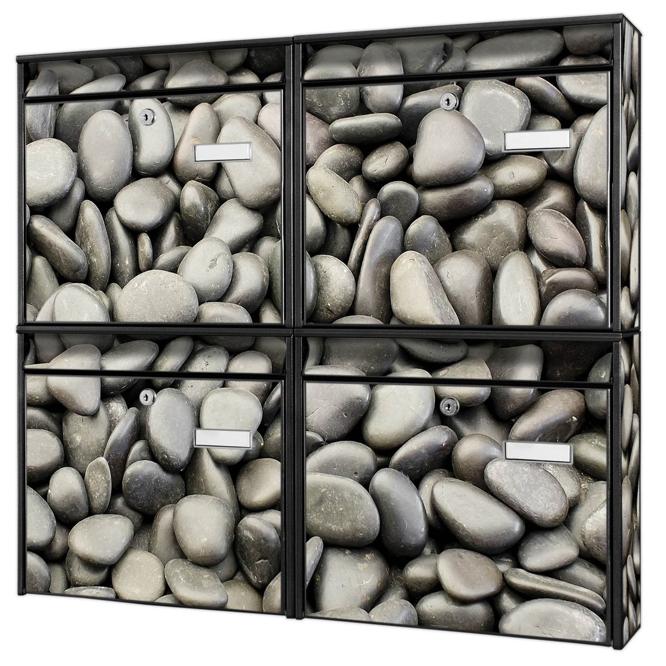 FUNKTION: Die Burg-Wächter Briefkastenanlage mit Motiv Nasse Kiesel bietet Ihnen ausreichend Fassungsvermögen um auch A4 und C4 Sendungen zu empfangen. Das integrierte Namensschild lässt sich individuell beschriften. Wählen Sie aus den Grundfarben weiß, silber und schwarz. DESIGN: Die 4 Briefkästen haben ein ansprechendes und zeitloses Design, ohne dabei auf Funktionalität zu verzichten. Das Material ist sehr stabil, wetterfest und rostfrei. Durch das Motiv Nasse Kiesel werden die Postkästen zu einem Blickfang. DETAILS: Die Postkästen bestehen aus verzinktem Stahl der zusätzlich mit Klarlack versiegelt wurde. Die Kästen sind gesamt 64,5cm hoch, 72,5cm breit und 10cm tief. Das Motiv besteht aus einer wetter- und UV-festen Folie, die Ihren Briefkasten zusätzlich vor Kratzern schützt. Die Postkästen werden mit Montagematerial, je einem Namensschild und je zwei Schlüsseln geliefert. NUTZEN: Das Briefkastenset eignet sich für die Wandmontage, die Größe bietet genügend Platz für Sendungen aller Art. Das zeitlose Design sowie die stabile Bauart bieten Ihnen einen treuen Begleiter für Ihre Post. BANJADO: