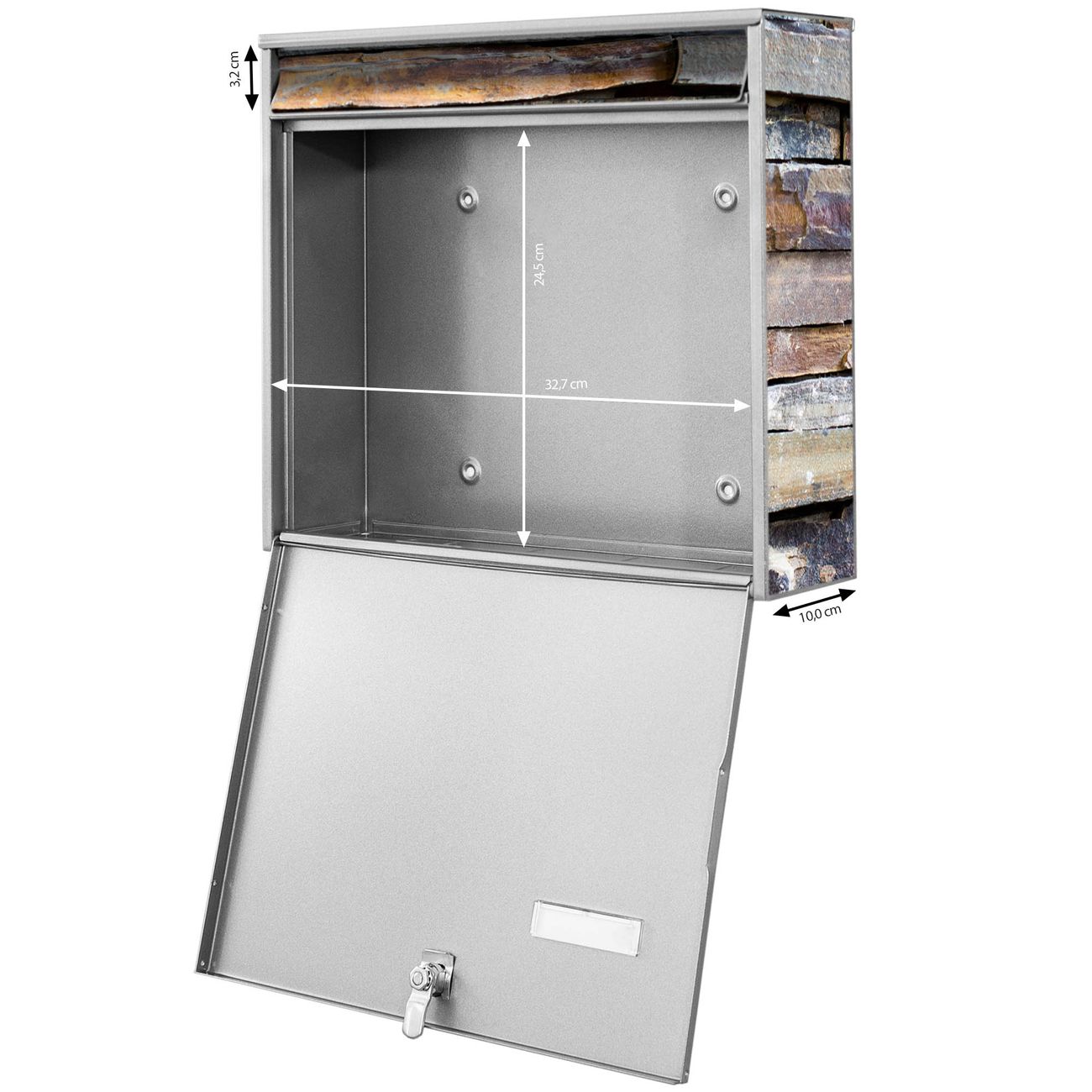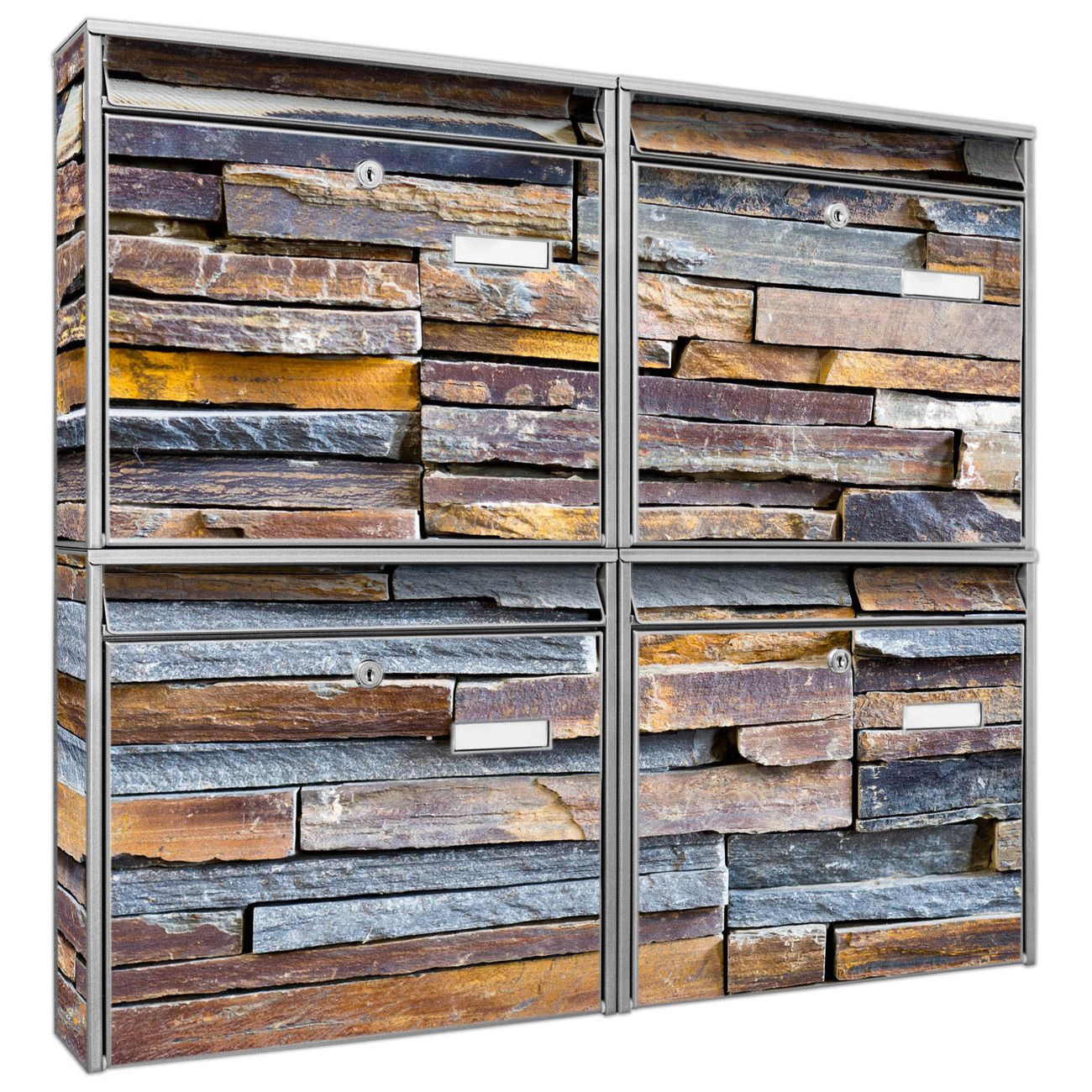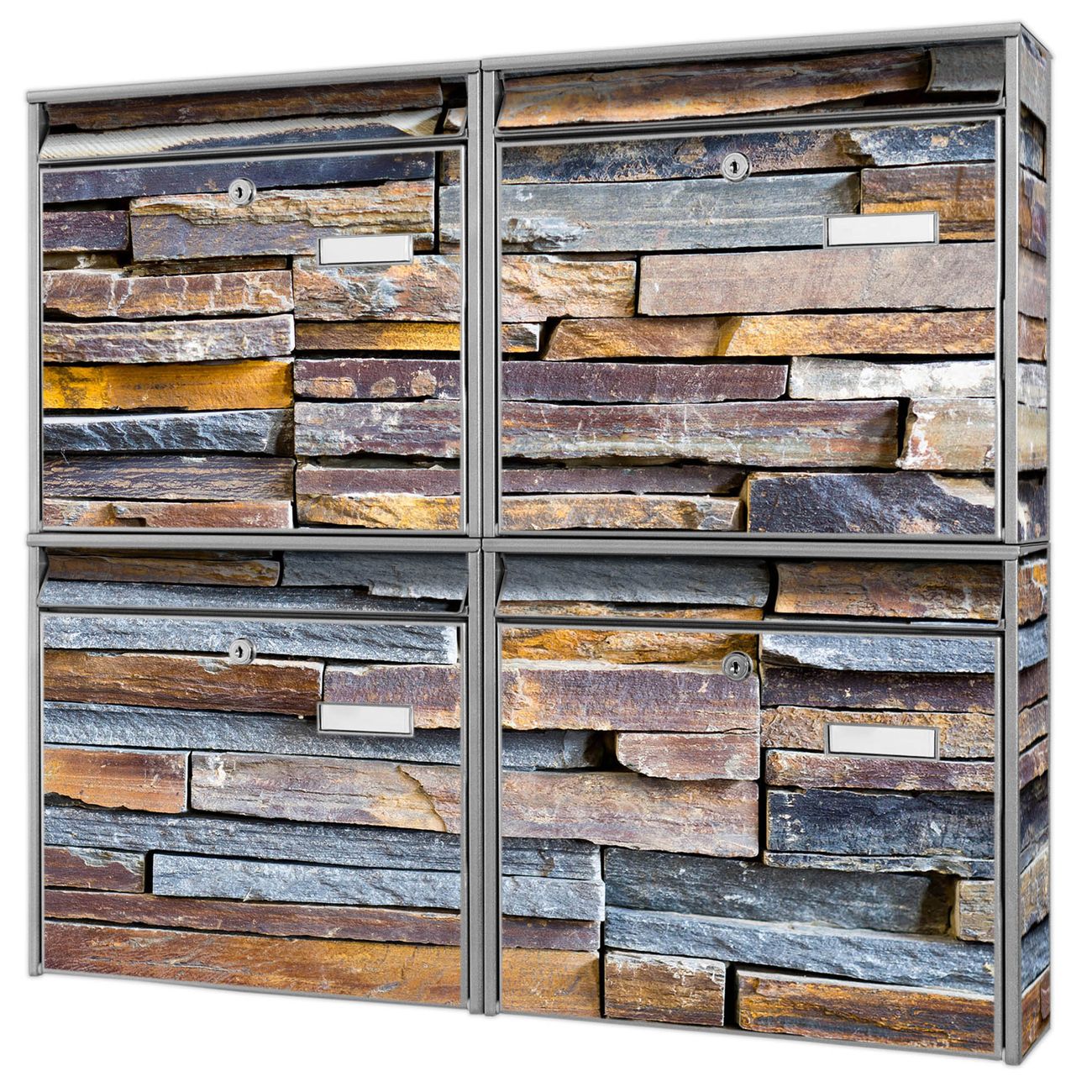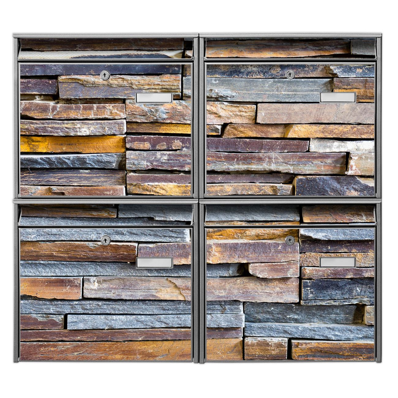 FUNKTION: Die Burg-Wächter Briefkastenanlage mit Motiv Naturstein bietet Ihnen ausreichend Fassungsvermögen um auch A4 und C4 Sendungen zu empfangen. Das integrierte Namensschild lässt sich individuell beschriften. Wählen Sie aus den Grundfarben weiß, silber und schwarz. DESIGN: Die 4 Briefkästen haben ein ansprechendes und zeitloses Design, ohne dabei auf Funktionalität zu verzichten. Das Material ist sehr stabil, wetterfest und rostfrei. Durch das Motiv Naturstein werden die Postkästen zu einem Blickfang. DETAILS: Die Postkästen bestehen aus verzinktem Stahl der zusätzlich mit Klarlack versiegelt wurde. Die Kästen sind gesamt 64,5cm hoch, 72,5cm breit und 10cm tief. Das Motiv besteht aus einer wetter- und UV-festen Folie, die Ihren Briefkasten zusätzlich vor Kratzern schützt. Die Postkästen werden mit Montagematerial, je einem Namensschild und je zwei Schlüsseln geliefert. NUTZEN: Das Briefkastenset eignet sich für die Wandmontage, die Größe bietet genügend Platz für Sendungen aller Art. Das zeitlose Design sowie die stabile Bauart bieten Ihnen einen treuen Begleiter für Ihre Post. BANJADO: