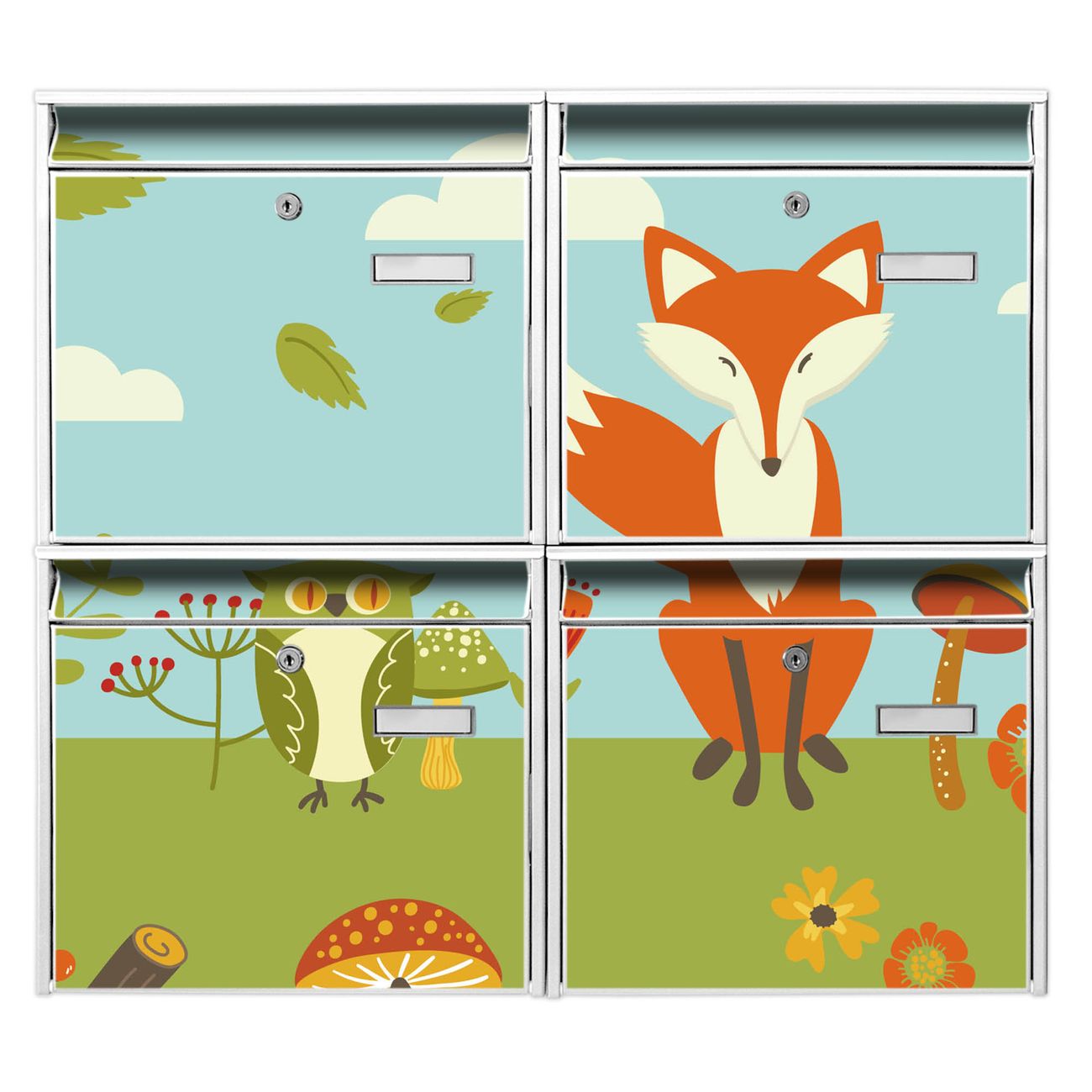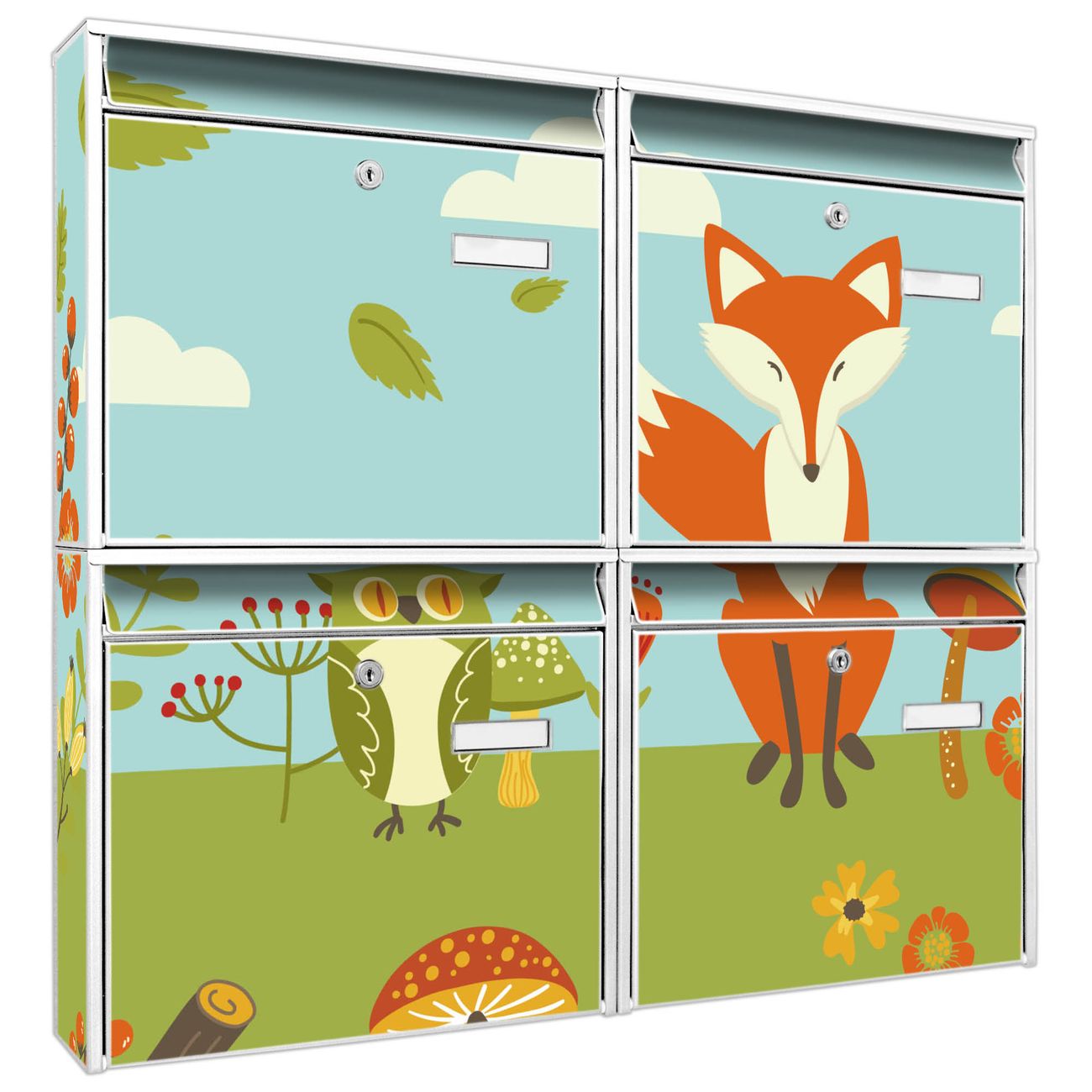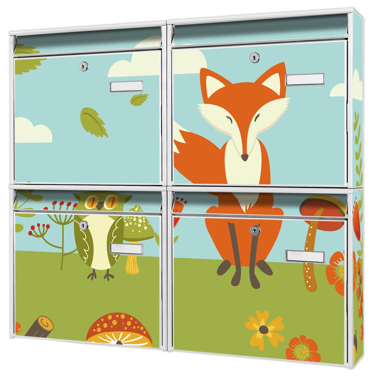 FUNKTION: Die Burg-Wächter Briefkastenanlage mit Motiv Neulich Im Wald bietet Ihnen ausreichend Fassungsvermögen um auch A4 und C4 Sendungen zu empfangen. Das integrierte Namensschild lässt sich individuell beschriften. Wählen Sie aus den Grundfarben weiß, silber und schwarz. DESIGN: Die 4 Briefkästen haben ein ansprechendes und zeitloses Design, ohne dabei auf Funktionalität zu verzichten. Das Material ist sehr stabil, wetterfest und rostfrei. Durch das Motiv Neulich Im Wald werden die Postkästen zu einem Blickfang. DETAILS: Die Postkästen bestehen aus verzinktem Stahl der zusätzlich mit Klarlack versiegelt wurde. Die Kästen sind gesamt 64,5cm hoch, 72,5cm breit und 10cm tief. Das Motiv besteht aus einer wetter- und UV-festen Folie, die Ihren Briefkasten zusätzlich vor Kratzern schützt. Die Postkästen werden mit Montagematerial, je einem Namensschild und je zwei Schlüsseln geliefert. NUTZEN: Das Briefkastenset eignet sich für die Wandmontage, die Größe bietet genügend Platz für Sendungen aller Art. Das zeitlose Design sowie die stabile Bauart bieten Ihnen einen treuen Begleiter für Ihre Post. BANJADO: