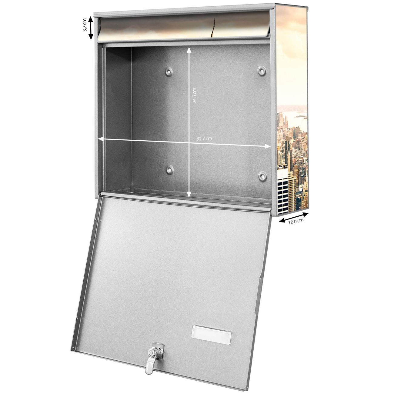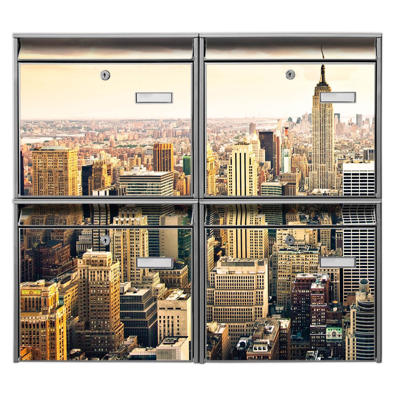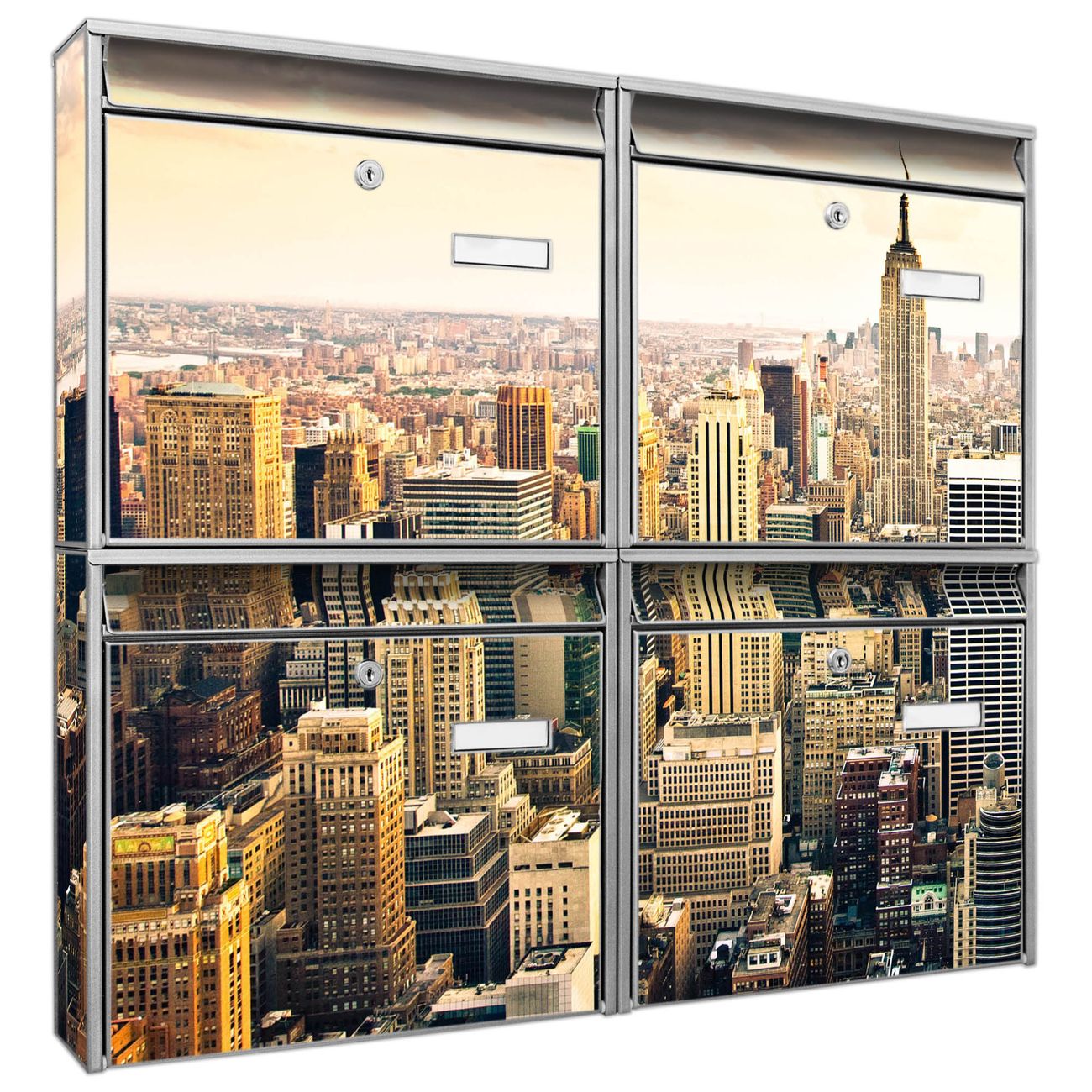 FUNKTION: Die Burg-Wächter Briefkastenanlage mit Motiv New York City bietet Ihnen ausreichend Fassungsvermögen um auch A4 und C4 Sendungen zu empfangen. Das integrierte Namensschild lässt sich individuell beschriften. Wählen Sie aus den Grundfarben weiß, silber und schwarz. DESIGN: Die 4 Briefkästen haben ein ansprechendes und zeitloses Design, ohne dabei auf Funktionalität zu verzichten. Das Material ist sehr stabil, wetterfest und rostfrei. Durch das Motiv New York City werden die Postkästen zu einem Blickfang. DETAILS: Die Postkästen bestehen aus verzinktem Stahl der zusätzlich mit Klarlack versiegelt wurde. Die Kästen sind gesamt 64,5cm hoch, 72,5cm breit und 10cm tief. Das Motiv besteht aus einer wetter- und UV-festen Folie, die Ihren Briefkasten zusätzlich vor Kratzern schützt. Die Postkästen werden mit Montagematerial, je einem Namensschild und je zwei Schlüsseln geliefert. NUTZEN: Das Briefkastenset eignet sich für die Wandmontage, die Größe bietet genügend Platz für Sendungen aller Art. Das zeitlose Design sowie die stabile Bauart bieten Ihnen einen treuen Begleiter für Ihre Post. BANJADO: