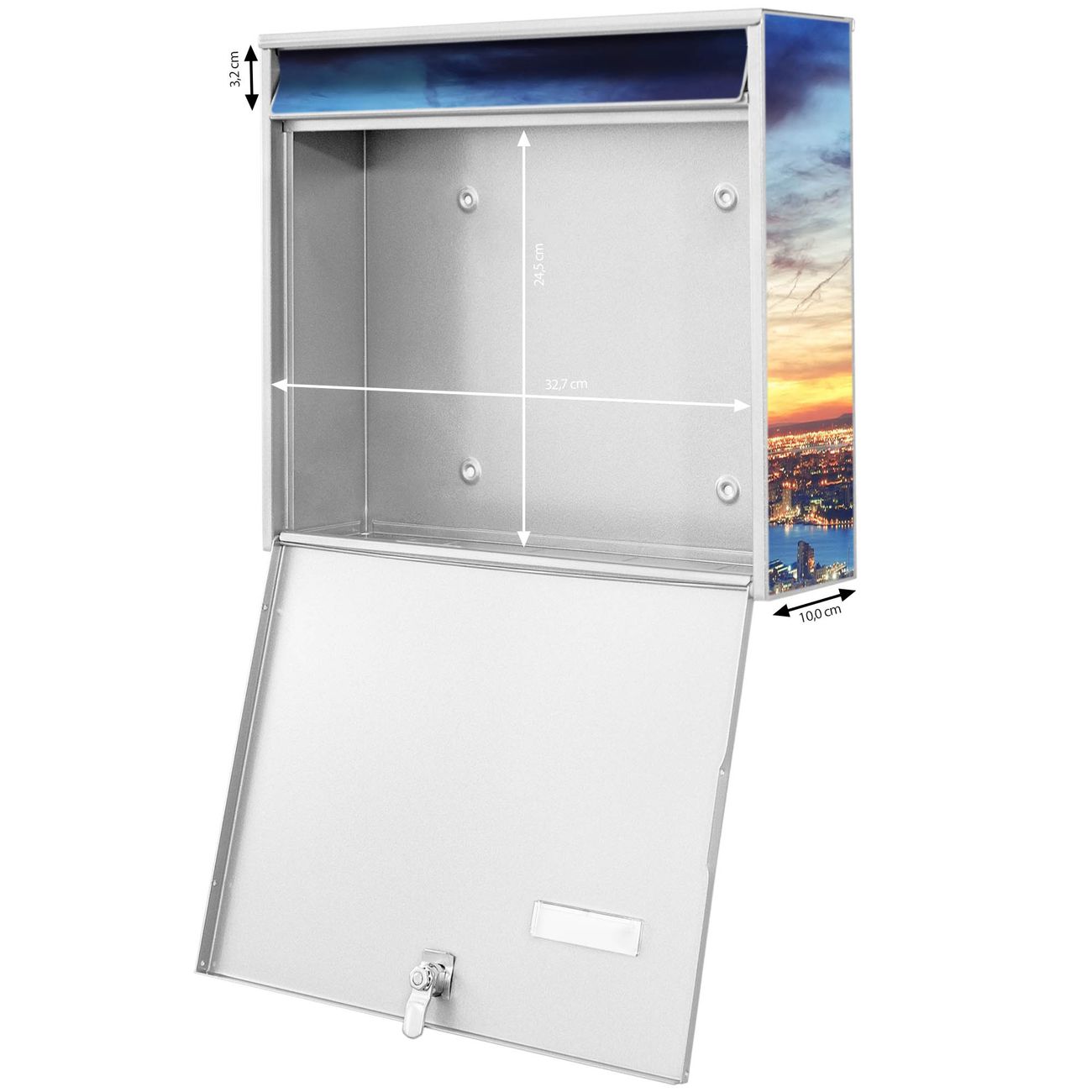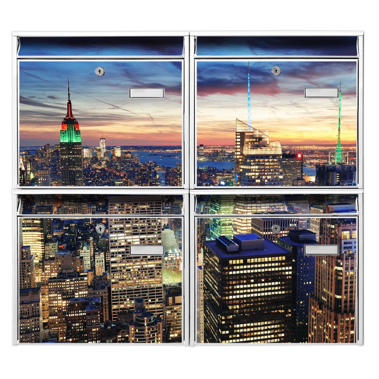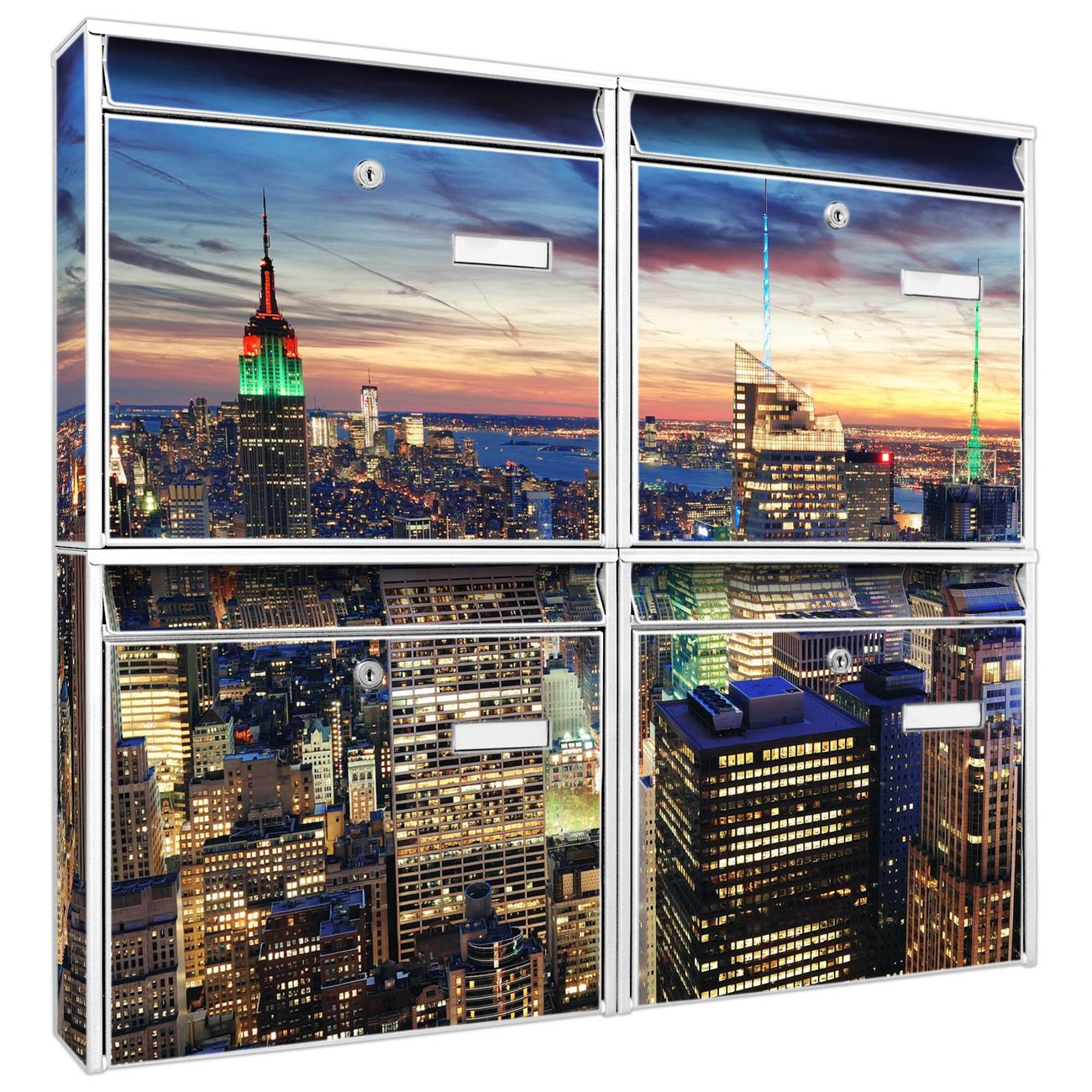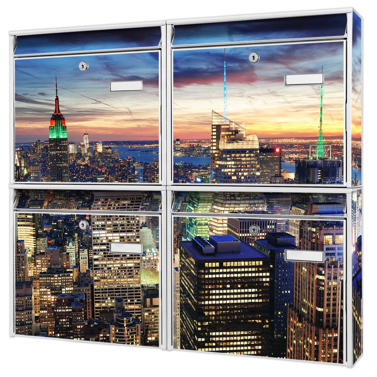 FUNKTION: Die Burg-Wächter Briefkastenanlage mit Motiv New York Sunset bietet Ihnen ausreichend Fassungsvermögen um auch A4 und C4 Sendungen zu empfangen. Das integrierte Namensschild lässt sich individuell beschriften. Wählen Sie aus den Grundfarben weiß, silber und schwarz. DESIGN: Die 4 Briefkästen haben ein ansprechendes und zeitloses Design, ohne dabei auf Funktionalität zu verzichten. Das Material ist sehr stabil, wetterfest und rostfrei. Durch das Motiv New York Sunset werden die Postkästen zu einem Blickfang. DETAILS: Die Postkästen bestehen aus verzinktem Stahl der zusätzlich mit Klarlack versiegelt wurde. Die Kästen sind gesamt 64,5cm hoch, 72,5cm breit und 10cm tief. Das Motiv besteht aus einer wetter- und UV-festen Folie, die Ihren Briefkasten zusätzlich vor Kratzern schützt. Die Postkästen werden mit Montagematerial, je einem Namensschild und je zwei Schlüsseln geliefert. NUTZEN: Das Briefkastenset eignet sich für die Wandmontage, die Größe bietet genügend Platz für Sendungen aller Art. Das zeitlose Design sowie die stabile Bauart bieten Ihnen einen treuen Begleiter für Ihre Post. BANJADO: