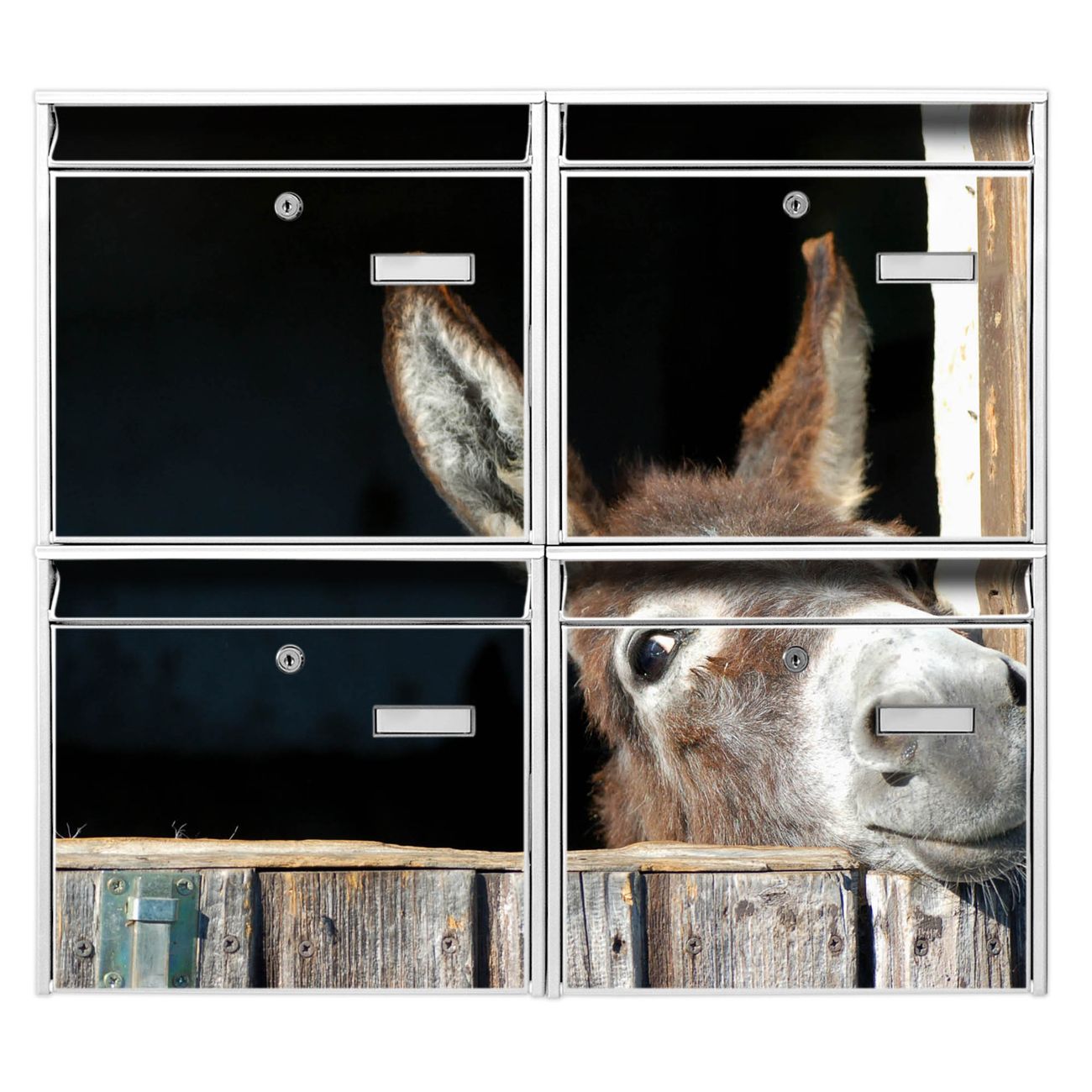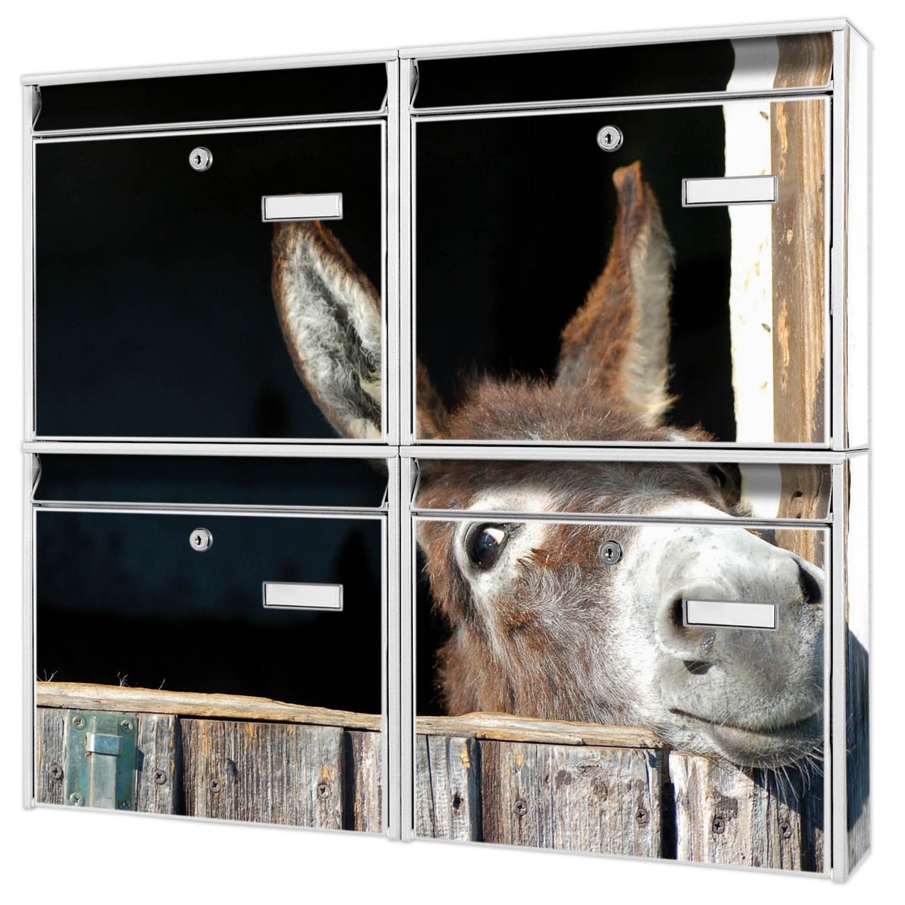 FUNKTION: Die Burg-Wächter Briefkastenanlage mit Motiv Nicki bietet Ihnen ausreichend Fassungsvermögen um auch A4 und C4 Sendungen zu empfangen. Das integrierte Namensschild lässt sich individuell beschriften. Wählen Sie aus den Grundfarben weiß, silber und schwarz. DESIGN: Die 4 Briefkästen haben ein ansprechendes und zeitloses Design, ohne dabei auf Funktionalität zu verzichten. Das Material ist sehr stabil, wetterfest und rostfrei. Durch das Motiv Nicki werden die Postkästen zu einem Blickfang. DETAILS: Die Postkästen bestehen aus verzinktem Stahl der zusätzlich mit Klarlack versiegelt wurde. Die Kästen sind gesamt 64,5cm hoch, 72,5cm breit und 10cm tief. Das Motiv besteht aus einer wetter- und UV-festen Folie, die Ihren Briefkasten zusätzlich vor Kratzern schützt. Die Postkästen werden mit Montagematerial, je einem Namensschild und je zwei Schlüsseln geliefert. NUTZEN: Das Briefkastenset eignet sich für die Wandmontage, die Größe bietet genügend Platz für Sendungen aller Art. Das zeitlose Design sowie die stabile Bauart bieten Ihnen einen treuen Begleiter für Ihre Post. BANJADO: