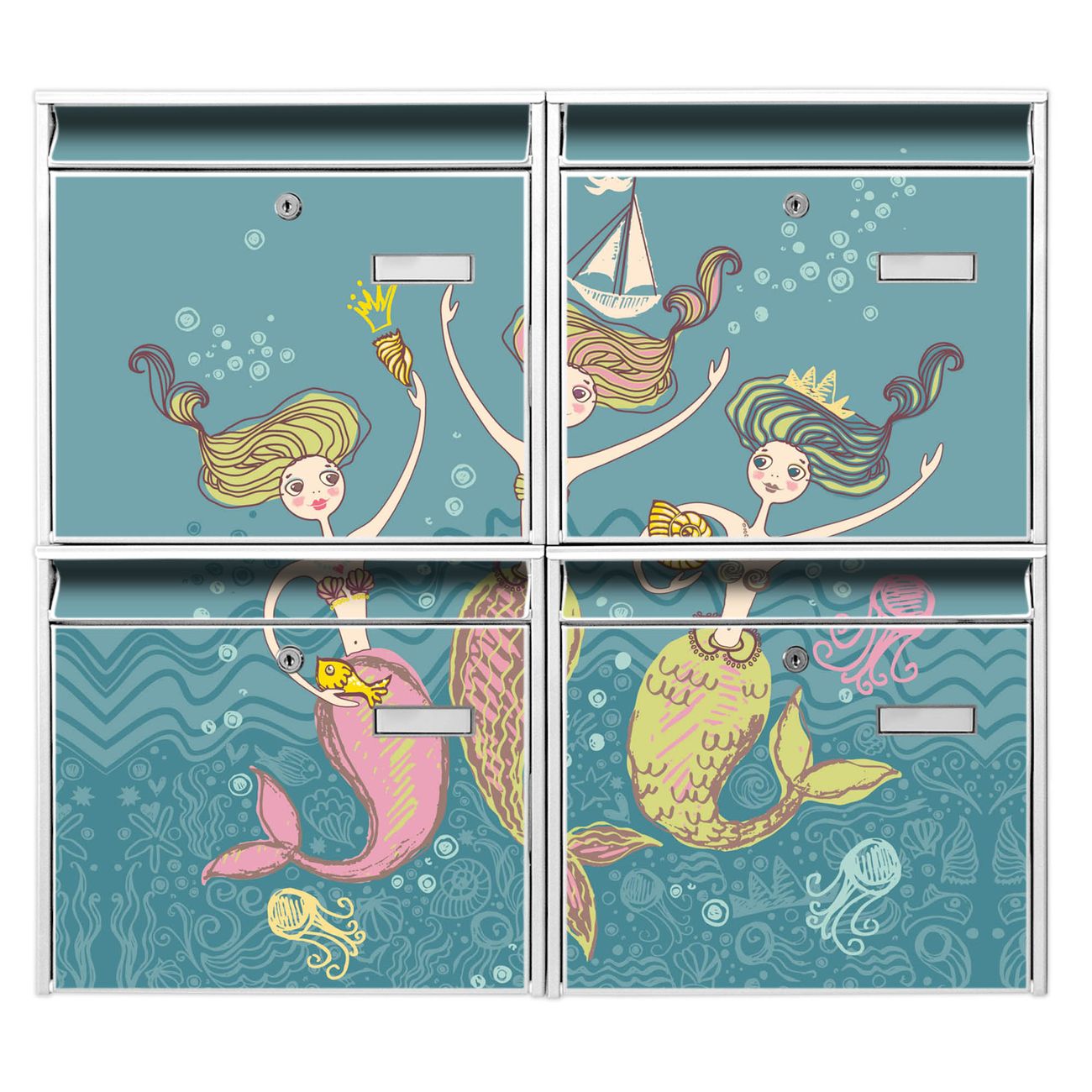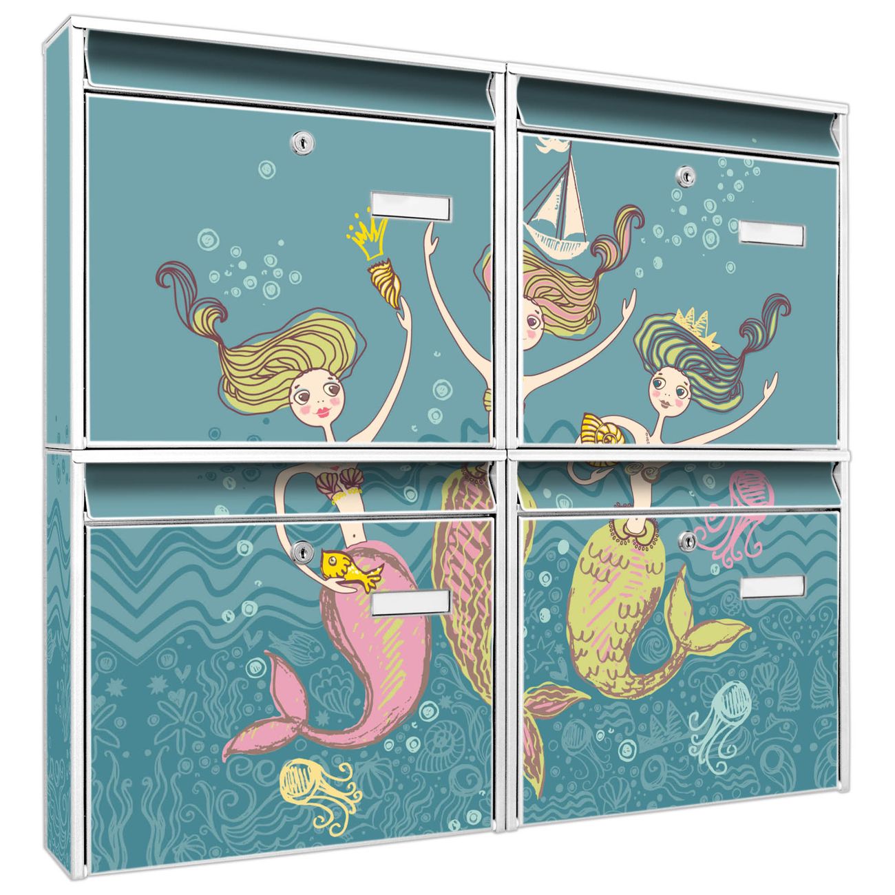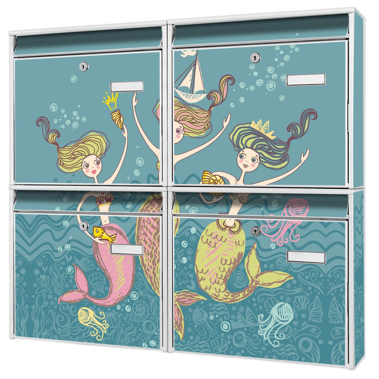 FUNKTION: Die Burg-Wächter Briefkastenanlage mit Motiv Nixen bietet Ihnen ausreichend Fassungsvermögen um auch A4 und C4 Sendungen zu empfangen. Das integrierte Namensschild lässt sich individuell beschriften. Wählen Sie aus den Grundfarben weiß, silber und schwarz. DESIGN: Die 4 Briefkästen haben ein ansprechendes und zeitloses Design, ohne dabei auf Funktionalität zu verzichten. Das Material ist sehr stabil, wetterfest und rostfrei. Durch das Motiv Nixen werden die Postkästen zu einem Blickfang. DETAILS: Die Postkästen bestehen aus verzinktem Stahl der zusätzlich mit Klarlack versiegelt wurde. Die Kästen sind gesamt 64,5cm hoch, 72,5cm breit und 10cm tief. Das Motiv besteht aus einer wetter- und UV-festen Folie, die Ihren Briefkasten zusätzlich vor Kratzern schützt. Die Postkästen werden mit Montagematerial, je einem Namensschild und je zwei Schlüsseln geliefert. NUTZEN: Das Briefkastenset eignet sich für die Wandmontage, die Größe bietet genügend Platz für Sendungen aller Art. Das zeitlose Design sowie die stabile Bauart bieten Ihnen einen treuen Begleiter für Ihre Post. BANJADO:
