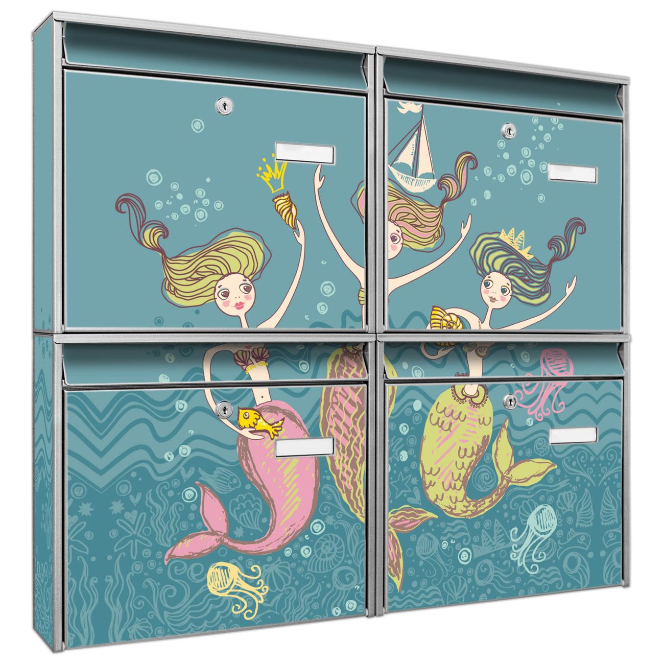 FUNKTION: Die Burg-Wächter Briefkastenanlage mit Motiv Nixen bietet Ihnen ausreichend Fassungsvermögen um auch A4 und C4 Sendungen zu empfangen. Das integrierte Namensschild lässt sich individuell beschriften. Wählen Sie aus den Grundfarben weiß, silber und schwarz. DESIGN: Die 4 Briefkästen haben ein ansprechendes und zeitloses Design, ohne dabei auf Funktionalität zu verzichten. Das Material ist sehr stabil, wetterfest und rostfrei. Durch das Motiv Nixen werden die Postkästen zu einem Blickfang. DETAILS: Die Postkästen bestehen aus verzinktem Stahl der zusätzlich mit Klarlack versiegelt wurde. Die Kästen sind gesamt 64,5cm hoch, 72,5cm breit und 10cm tief. Das Motiv besteht aus einer wetter- und UV-festen Folie, die Ihren Briefkasten zusätzlich vor Kratzern schützt. Die Postkästen werden mit Montagematerial, je einem Namensschild und je zwei Schlüsseln geliefert. NUTZEN: Das Briefkastenset eignet sich für die Wandmontage, die Größe bietet genügend Platz für Sendungen aller Art. Das zeitlose Design sowie die stabile Bauart bieten Ihnen einen treuen Begleiter für Ihre Post. BANJADO: