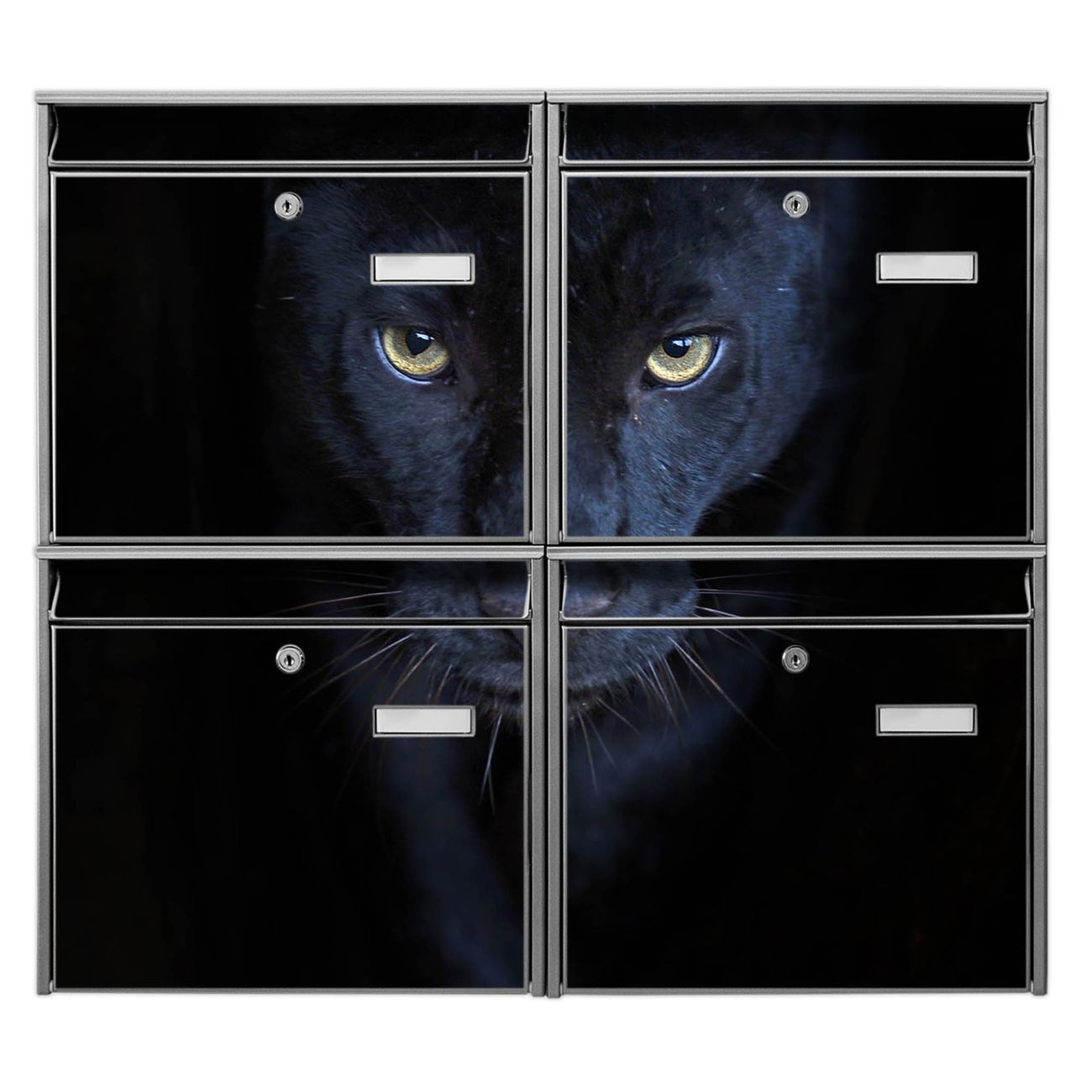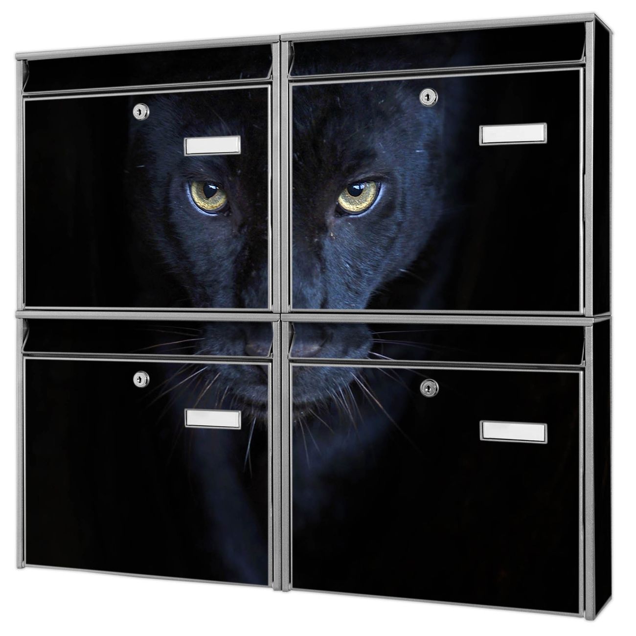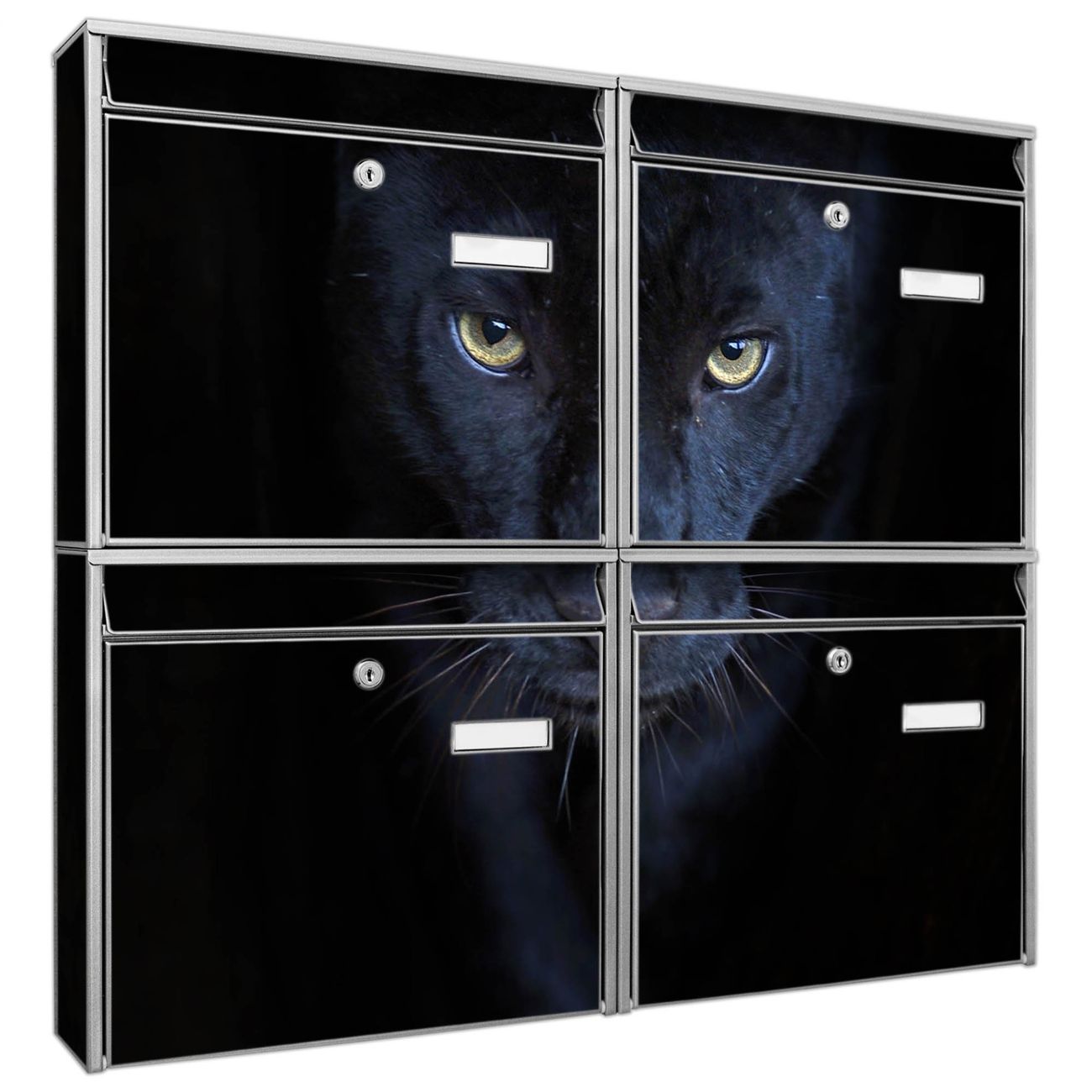FUNKTION: Die Burg-Wächter Briefkastenanlage mit Motiv Nora bietet Ihnen ausreichend Fassungsvermögen um auch A4 und C4 Sendungen zu empfangen. Das integrierte Namensschild lässt sich individuell beschriften. Wählen Sie aus den Grundfarben weiß, silber und schwarz. DESIGN: Die 4 Briefkästen haben ein ansprechendes und zeitloses Design, ohne dabei auf Funktionalität zu verzichten. Das Material ist sehr stabil, wetterfest und rostfrei. Durch das Motiv Nora werden die Postkästen zu einem Blickfang. DETAILS: Die Postkästen bestehen aus verzinktem Stahl der zusätzlich mit Klarlack versiegelt wurde. Die Kästen sind gesamt 64,5cm hoch, 72,5cm breit und 10cm tief. Das Motiv besteht aus einer wetter- und UV-festen Folie, die Ihren Briefkasten zusätzlich vor Kratzern schützt. Die Postkästen werden mit Montagematerial, je einem Namensschild und je zwei Schlüsseln geliefert. NUTZEN: Das Briefkastenset eignet sich für die Wandmontage, die Größe bietet genügend Platz für Sendungen aller Art. Das zeitlose Design sowie die stabile Bauart bieten Ihnen einen treuen Begleiter für Ihre Post. BANJADO: