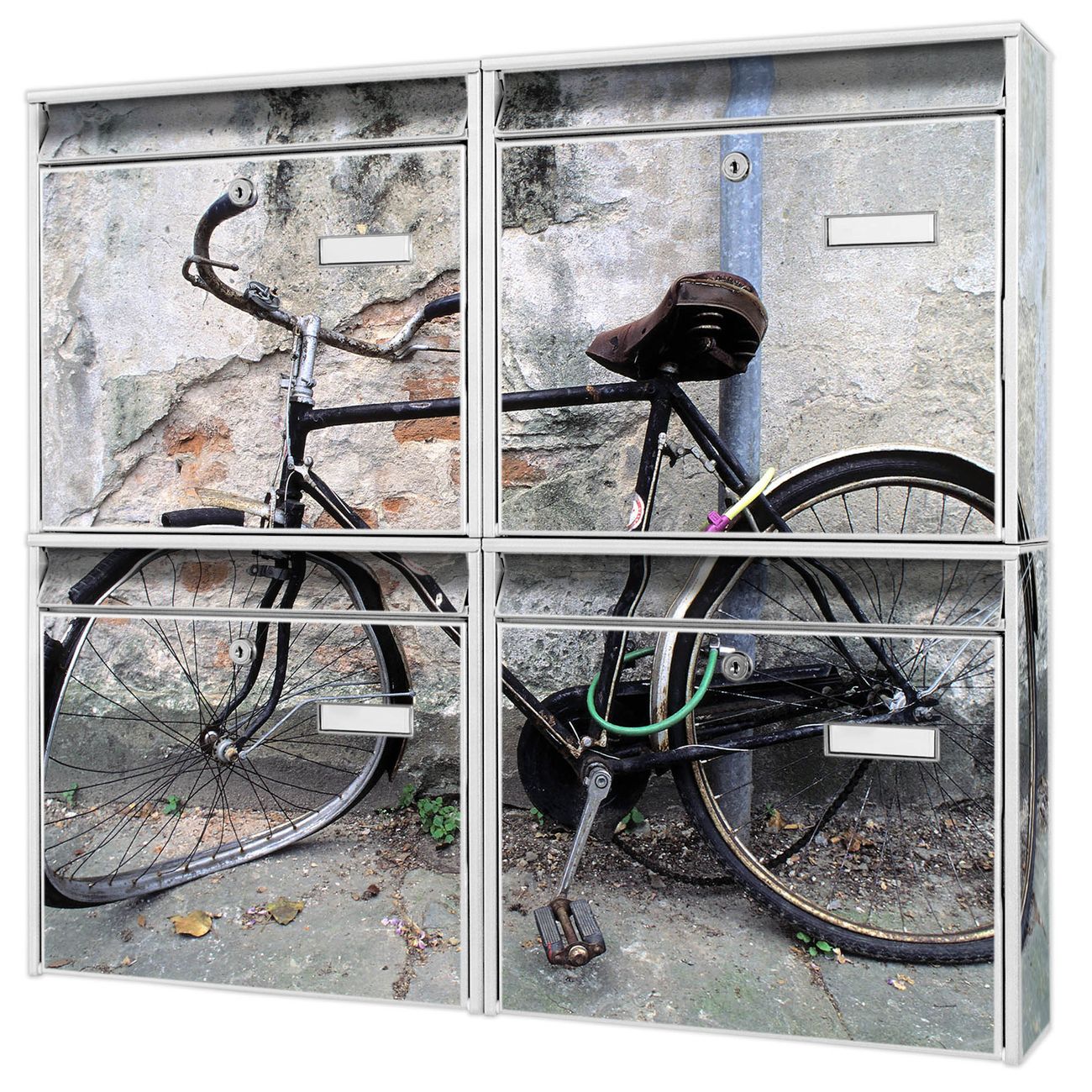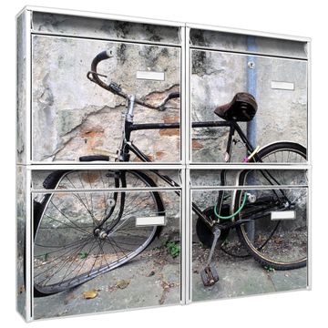 FUNKTION: Die Burg-Wächter Briefkastenanlage mit Motiv Nostalgie Rad bietet Ihnen ausreichend Fassungsvermögen um auch A4 und C4 Sendungen zu empfangen. Das integrierte Namensschild lässt sich individuell beschriften. Wählen Sie aus den Grundfarben weiß, silber und schwarz. DESIGN: Die 4 Briefkästen haben ein ansprechendes und zeitloses Design, ohne dabei auf Funktionalität zu verzichten. Das Material ist sehr stabil, wetterfest und rostfrei. Durch das Motiv Nostalgie Rad werden die Postkästen zu einem Blickfang. DETAILS: Die Postkästen bestehen aus verzinktem Stahl der zusätzlich mit Klarlack versiegelt wurde. Die Kästen sind gesamt 64,5cm hoch, 72,5cm breit und 10cm tief. Das Motiv besteht aus einer wetter- und UV-festen Folie, die Ihren Briefkasten zusätzlich vor Kratzern schützt. Die Postkästen werden mit Montagematerial, je einem Namensschild und je zwei Schlüsseln geliefert. NUTZEN: Das Briefkastenset eignet sich für die Wandmontage, die Größe bietet genügend Platz für Sendungen aller Art. Das zeitlose Design sowie die stabile Bauart bieten Ihnen einen treuen Begleiter für Ihre Post. BANJADO: