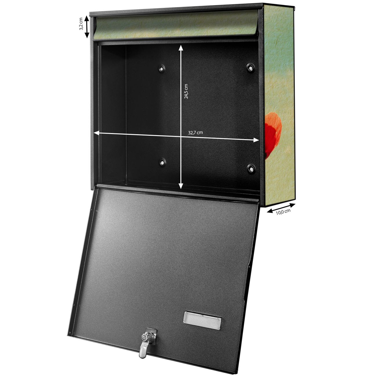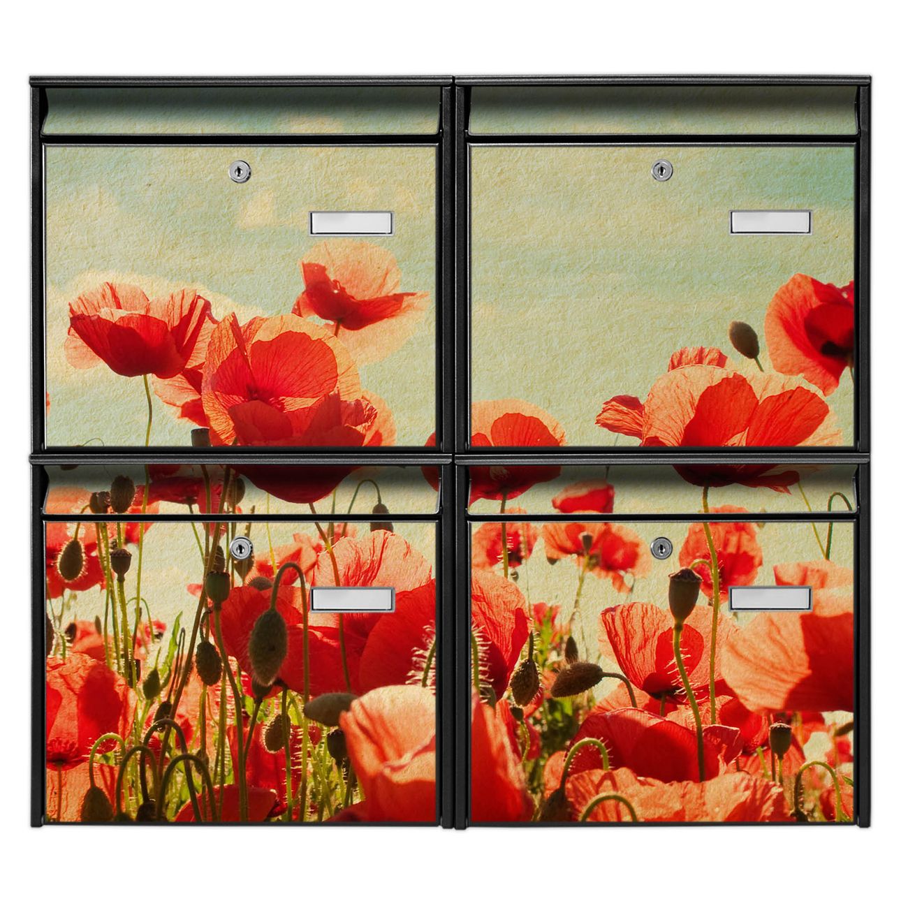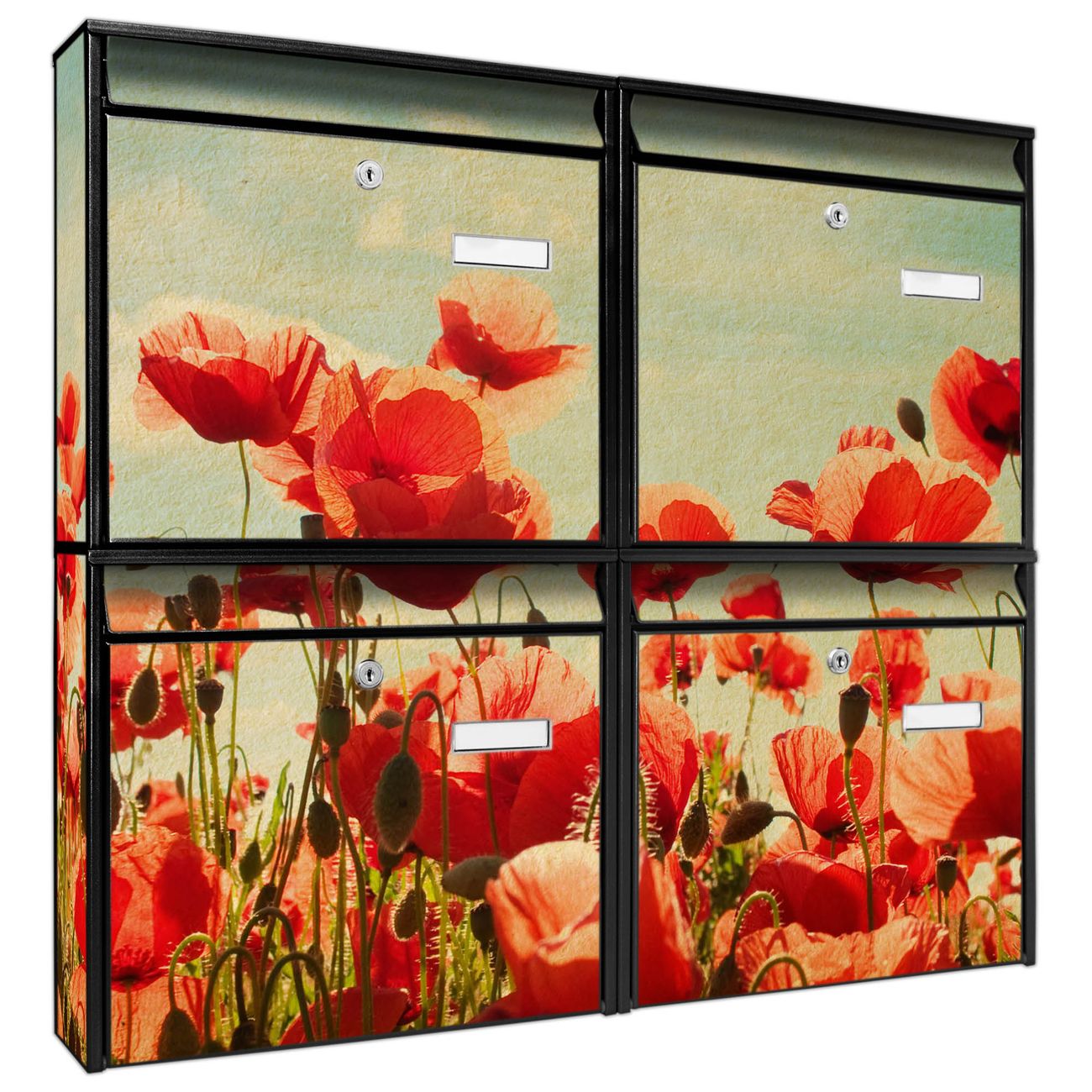 FUNKTION: Die Burg-Wächter Briefkastenanlage mit Motiv Oktobermohn bietet Ihnen ausreichend Fassungsvermögen um auch A4 und C4 Sendungen zu empfangen. Das integrierte Namensschild lässt sich individuell beschriften. Wählen Sie aus den Grundfarben weiß, silber und schwarz. DESIGN: Die 4 Briefkästen haben ein ansprechendes und zeitloses Design, ohne dabei auf Funktionalität zu verzichten. Das Material ist sehr stabil, wetterfest und rostfrei. Durch das Motiv Oktobermohn werden die Postkästen zu einem Blickfang. DETAILS: Die Postkästen bestehen aus verzinktem Stahl der zusätzlich mit Klarlack versiegelt wurde. Die Kästen sind gesamt 64,5cm hoch, 72,5cm breit und 10cm tief. Das Motiv besteht aus einer wetter- und UV-festen Folie, die Ihren Briefkasten zusätzlich vor Kratzern schützt. Die Postkästen werden mit Montagematerial, je einem Namensschild und je zwei Schlüsseln geliefert. NUTZEN: Das Briefkastenset eignet sich für die Wandmontage, die Größe bietet genügend Platz für Sendungen aller Art. Das zeitlose Design sowie die stabile Bauart bieten Ihnen einen treuen Begleiter für Ihre Post. BANJADO: