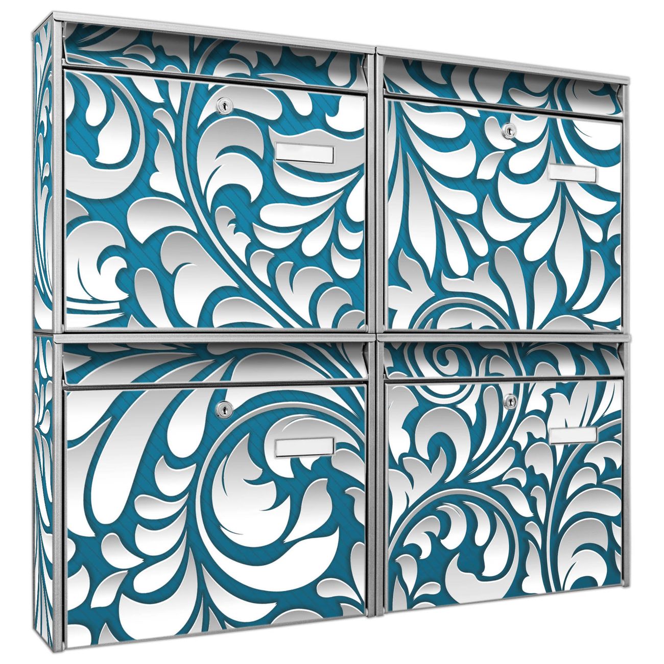 FUNKTION: Die Burg-Wächter Briefkastenanlage mit Motiv Opulente Ranke bietet Ihnen ausreichend Fassungsvermögen um auch A4 und C4 Sendungen zu empfangen. Das integrierte Namensschild lässt sich individuell beschriften. Wählen Sie aus den Grundfarben weiß, silber und schwarz. DESIGN: Die 4 Briefkästen haben ein ansprechendes und zeitloses Design, ohne dabei auf Funktionalität zu verzichten. Das Material ist sehr stabil, wetterfest und rostfrei. Durch das Motiv Opulente Ranke werden die Postkästen zu einem Blickfang. DETAILS: Die Postkästen bestehen aus verzinktem Stahl der zusätzlich mit Klarlack versiegelt wurde. Die Kästen sind gesamt 64,5cm hoch, 72,5cm breit und 10cm tief. Das Motiv besteht aus einer wetter- und UV-festen Folie, die Ihren Briefkasten zusätzlich vor Kratzern schützt. Die Postkästen werden mit Montagematerial, je einem Namensschild und je zwei Schlüsseln geliefert. NUTZEN: Das Briefkastenset eignet sich für die Wandmontage, die Größe bietet genügend Platz für Sendungen aller Art. Das zeitlose Design sowie die stabile Bauart bieten Ihnen einen treuen Begleiter für Ihre Post. BANJADO: