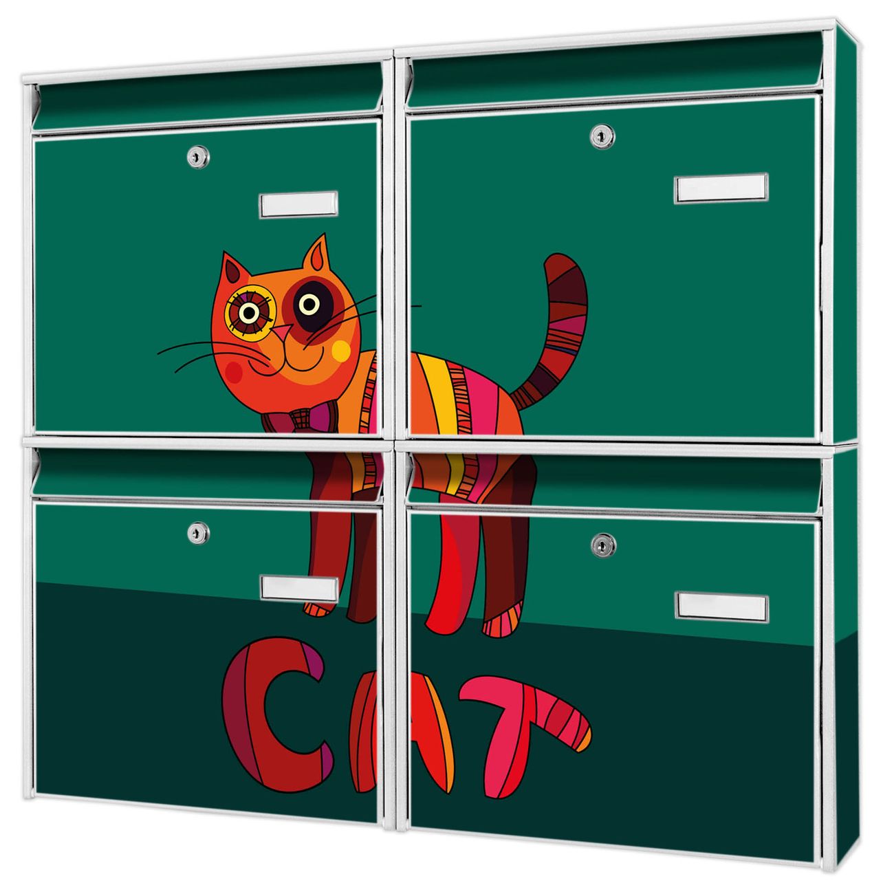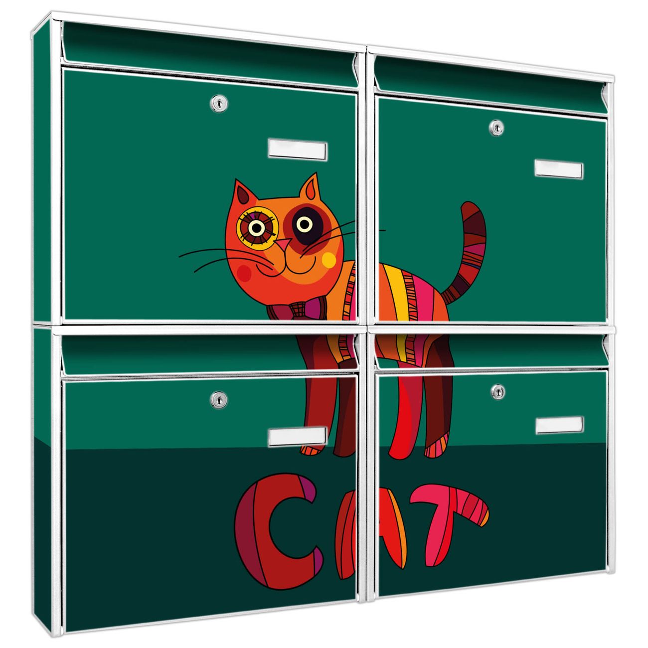 FUNKTION: Die Burg-Wächter Briefkastenanlage mit Motiv Orange Katze bietet Ihnen ausreichend Fassungsvermögen um auch A4 und C4 Sendungen zu empfangen. Das integrierte Namensschild lässt sich individuell beschriften. Wählen Sie aus den Grundfarben weiß, silber und schwarz. DESIGN: Die 4 Briefkästen haben ein ansprechendes und zeitloses Design, ohne dabei auf Funktionalität zu verzichten. Das Material ist sehr stabil, wetterfest und rostfrei. Durch das Motiv Orange Katze werden die Postkästen zu einem Blickfang. DETAILS: Die Postkästen bestehen aus verzinktem Stahl der zusätzlich mit Klarlack versiegelt wurde. Die Kästen sind gesamt 64,5cm hoch, 72,5cm breit und 10cm tief. Das Motiv besteht aus einer wetter- und UV-festen Folie, die Ihren Briefkasten zusätzlich vor Kratzern schützt. Die Postkästen werden mit Montagematerial, je einem Namensschild und je zwei Schlüsseln geliefert. NUTZEN: Das Briefkastenset eignet sich für die Wandmontage, die Größe bietet genügend Platz für Sendungen aller Art. Das zeitlose Design sowie die stabile Bauart bieten Ihnen einen treuen Begleiter für Ihre Post. BANJADO: