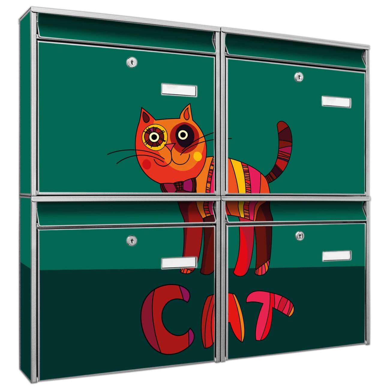 FUNKTION: Die Burg-Wächter Briefkastenanlage mit Motiv Orange Katze bietet Ihnen ausreichend Fassungsvermögen um auch A4 und C4 Sendungen zu empfangen. Das integrierte Namensschild lässt sich individuell beschriften. Wählen Sie aus den Grundfarben weiß, silber und schwarz. DESIGN: Die 4 Briefkästen haben ein ansprechendes und zeitloses Design, ohne dabei auf Funktionalität zu verzichten. Das Material ist sehr stabil, wetterfest und rostfrei. Durch das Motiv Orange Katze werden die Postkästen zu einem Blickfang. DETAILS: Die Postkästen bestehen aus verzinktem Stahl der zusätzlich mit Klarlack versiegelt wurde. Die Kästen sind gesamt 64,5cm hoch, 72,5cm breit und 10cm tief. Das Motiv besteht aus einer wetter- und UV-festen Folie, die Ihren Briefkasten zusätzlich vor Kratzern schützt. Die Postkästen werden mit Montagematerial, je einem Namensschild und je zwei Schlüsseln geliefert. NUTZEN: Das Briefkastenset eignet sich für die Wandmontage, die Größe bietet genügend Platz für Sendungen aller Art. Das zeitlose Design sowie die stabile Bauart bieten Ihnen einen treuen Begleiter für Ihre Post. BANJADO: