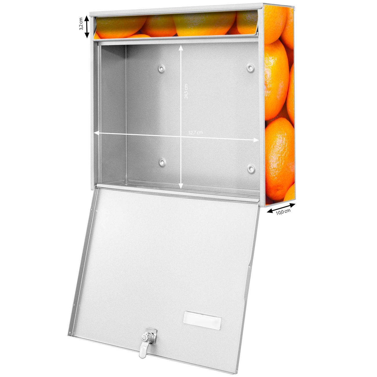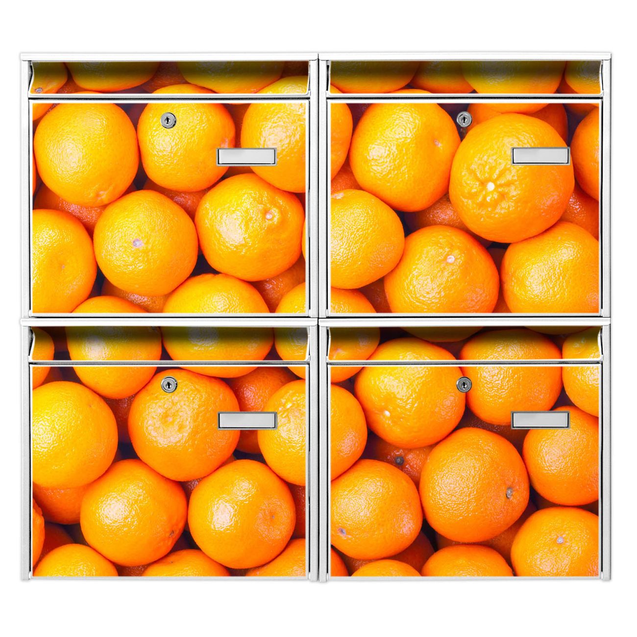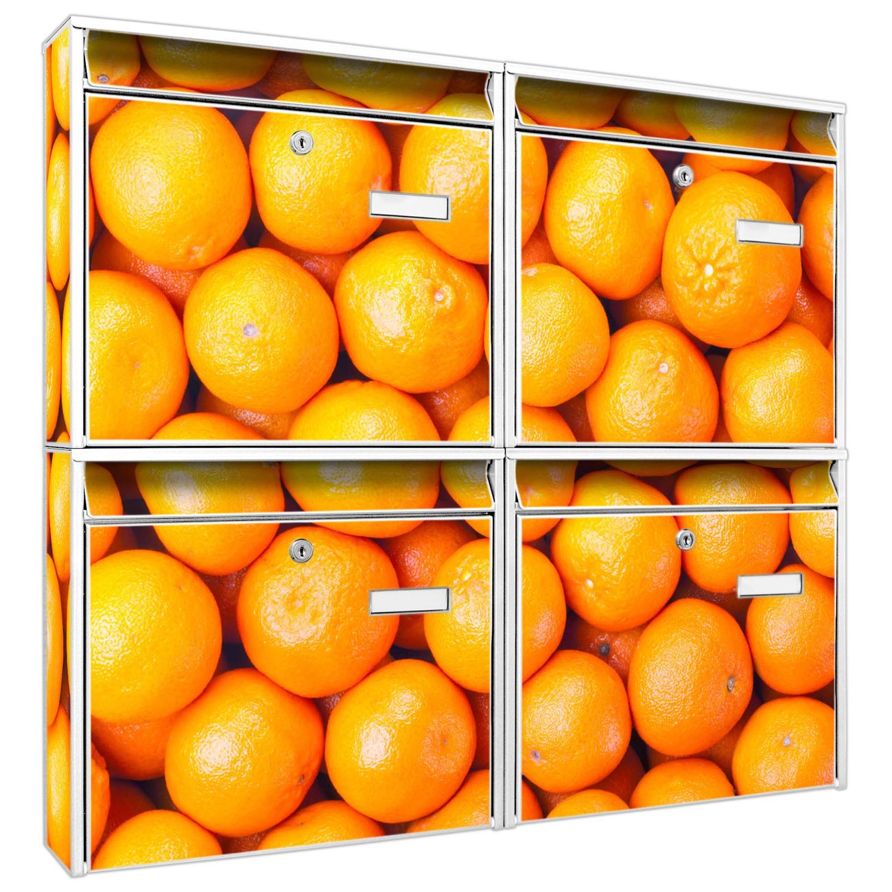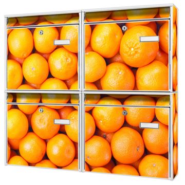FUNKTION: Die Burg-Wächter Briefkastenanlage mit Motiv Orangen bietet Ihnen ausreichend Fassungsvermögen um auch A4 und C4 Sendungen zu empfangen. Das integrierte Namensschild lässt sich individuell beschriften. Wählen Sie aus den Grundfarben weiß, silber und schwarz. DESIGN: Die 4 Briefkästen haben ein ansprechendes und zeitloses Design, ohne dabei auf Funktionalität zu verzichten. Das Material ist sehr stabil, wetterfest und rostfrei. Durch das Motiv Orangen werden die Postkästen zu einem Blickfang. DETAILS: Die Postkästen bestehen aus verzinktem Stahl der zusätzlich mit Klarlack versiegelt wurde. Die Kästen sind gesamt 64,5cm hoch, 72,5cm breit und 10cm tief. Das Motiv besteht aus einer wetter- und UV-festen Folie, die Ihren Briefkasten zusätzlich vor Kratzern schützt. Die Postkästen werden mit Montagematerial, je einem Namensschild und je zwei Schlüsseln geliefert. NUTZEN: Das Briefkastenset eignet sich für die Wandmontage, die Größe bietet genügend Platz für Sendungen aller Art. Das zeitlose Design sowie die stabile Bauart bieten Ihnen einen treuen Begleiter für Ihre Post. BANJADO: