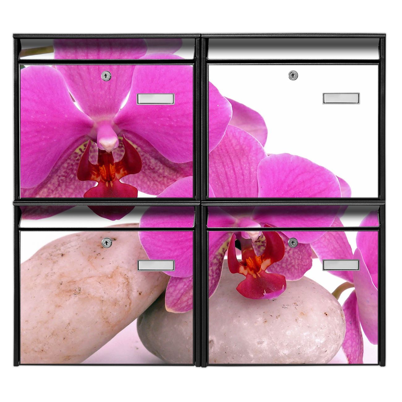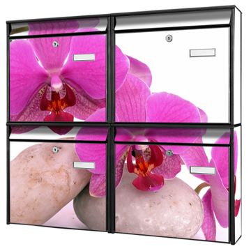 FUNKTION: Die Burg-Wächter Briefkastenanlage mit Motiv Orchidee bietet Ihnen ausreichend Fassungsvermögen um auch A4 und C4 Sendungen zu empfangen. Das integrierte Namensschild lässt sich individuell beschriften. Wählen Sie aus den Grundfarben weiß, silber und schwarz. DESIGN: Die 4 Briefkästen haben ein ansprechendes und zeitloses Design, ohne dabei auf Funktionalität zu verzichten. Das Material ist sehr stabil, wetterfest und rostfrei. Durch das Motiv Orchidee werden die Postkästen zu einem Blickfang. DETAILS: Die Postkästen bestehen aus verzinktem Stahl der zusätzlich mit Klarlack versiegelt wurde. Die Kästen sind gesamt 64,5cm hoch, 72,5cm breit und 10cm tief. Das Motiv besteht aus einer wetter- und UV-festen Folie, die Ihren Briefkasten zusätzlich vor Kratzern schützt. Die Postkästen werden mit Montagematerial, je einem Namensschild und je zwei Schlüsseln geliefert. NUTZEN: Das Briefkastenset eignet sich für die Wandmontage, die Größe bietet genügend Platz für Sendungen aller Art. Das zeitlose Design sowie die stabile Bauart bieten Ihnen einen treuen Begleiter für Ihre Post. BANJADO: