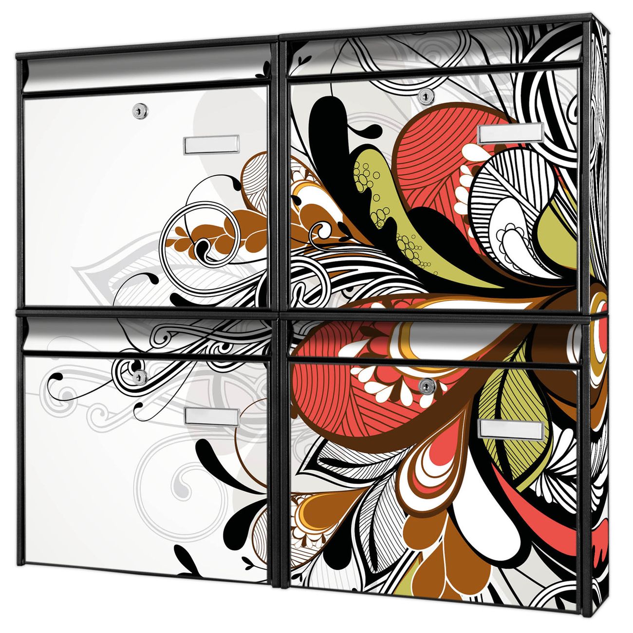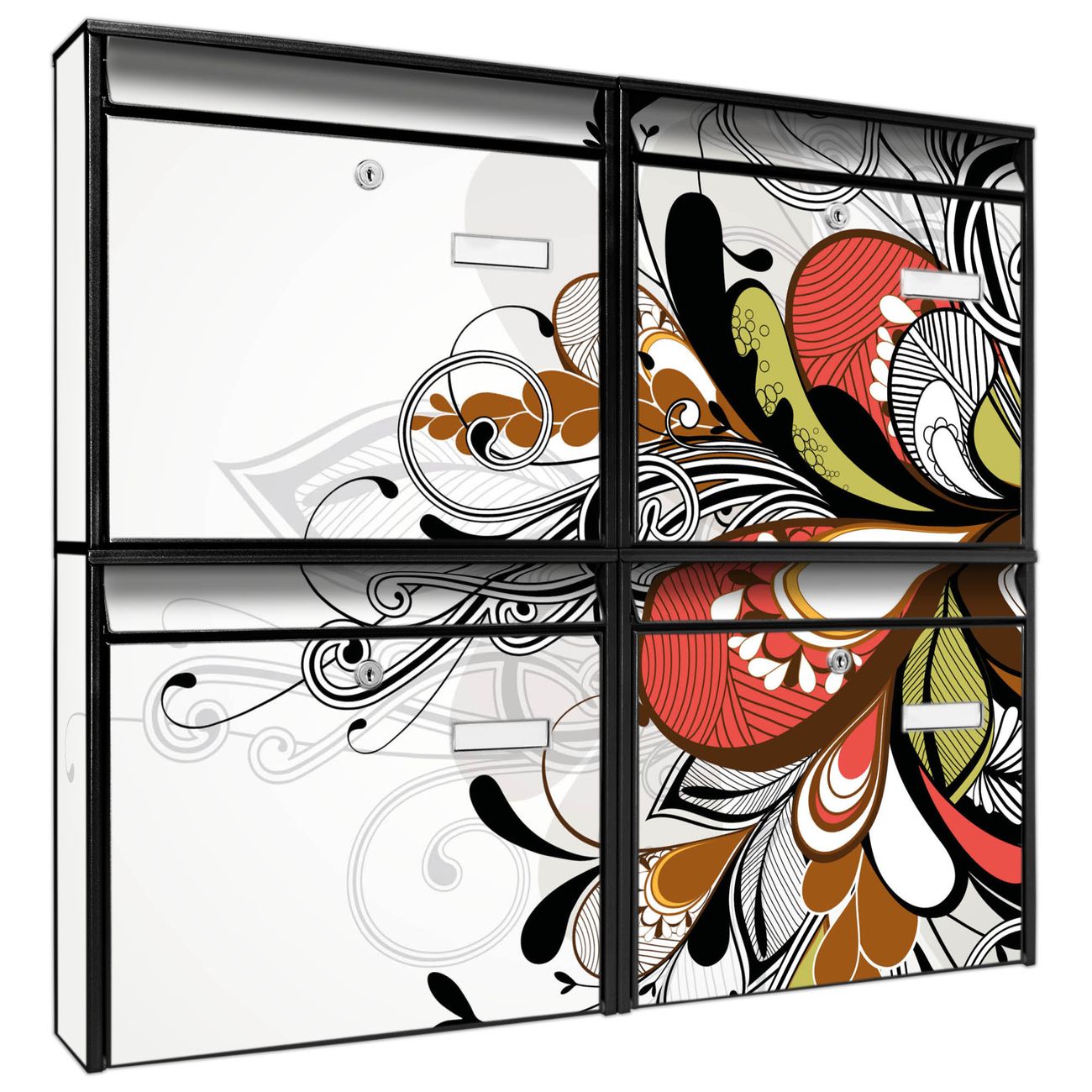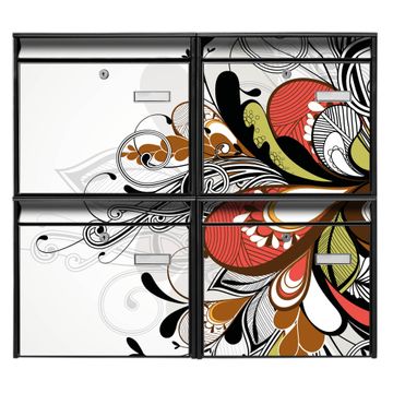 FUNKTION: Die Burg-Wächter Briefkastenanlage mit Motiv Ornament 2 bietet Ihnen ausreichend Fassungsvermögen um auch A4 und C4 Sendungen zu empfangen. Das integrierte Namensschild lässt sich individuell beschriften. Wählen Sie aus den Grundfarben weiß, silber und schwarz. DESIGN: Die 4 Briefkästen haben ein ansprechendes und zeitloses Design, ohne dabei auf Funktionalität zu verzichten. Das Material ist sehr stabil, wetterfest und rostfrei. Durch das Motiv Ornament 2 werden die Postkästen zu einem Blickfang. DETAILS: Die Postkästen bestehen aus verzinktem Stahl der zusätzlich mit Klarlack versiegelt wurde. Die Kästen sind gesamt 64,5cm hoch, 72,5cm breit und 10cm tief. Das Motiv besteht aus einer wetter- und UV-festen Folie, die Ihren Briefkasten zusätzlich vor Kratzern schützt. Die Postkästen werden mit Montagematerial, je einem Namensschild und je zwei Schlüsseln geliefert. NUTZEN: Das Briefkastenset eignet sich für die Wandmontage, die Größe bietet genügend Platz für Sendungen aller Art. Das zeitlose Design sowie die stabile Bauart bieten Ihnen einen treuen Begleiter für Ihre Post. BANJADO: