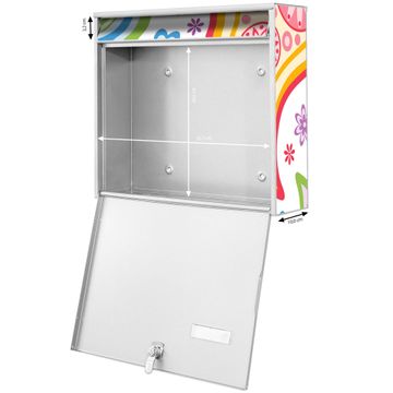 FUNKTION: Die Burg-Wächter Briefkastenanlage mit Motiv Paisley bunt bietet Ihnen ausreichend Fassungsvermögen um auch A4 und C4 Sendungen zu empfangen. Das integrierte Namensschild lässt sich individuell beschriften. Wählen Sie aus den Grundfarben weiß, silber und schwarz. DESIGN: Die 4 Briefkästen haben ein ansprechendes und zeitloses Design, ohne dabei auf Funktionalität zu verzichten. Das Material ist sehr stabil, wetterfest und rostfrei. Durch das Motiv Paisley bunt werden die Postkästen zu einem Blickfang. DETAILS: Die Postkästen bestehen aus verzinktem Stahl der zusätzlich mit Klarlack versiegelt wurde. Die Kästen sind gesamt 64,5cm hoch, 72,5cm breit und 10cm tief. Das Motiv besteht aus einer wetter- und UV-festen Folie, die Ihren Briefkasten zusätzlich vor Kratzern schützt. Die Postkästen werden mit Montagematerial, je einem Namensschild und je zwei Schlüsseln geliefert. NUTZEN: Das Briefkastenset eignet sich für die Wandmontage, die Größe bietet genügend Platz für Sendungen aller Art. Das zeitlose Design sowie die stabile Bauart bieten Ihnen einen treuen Begleiter für Ihre Post. BANJADO: