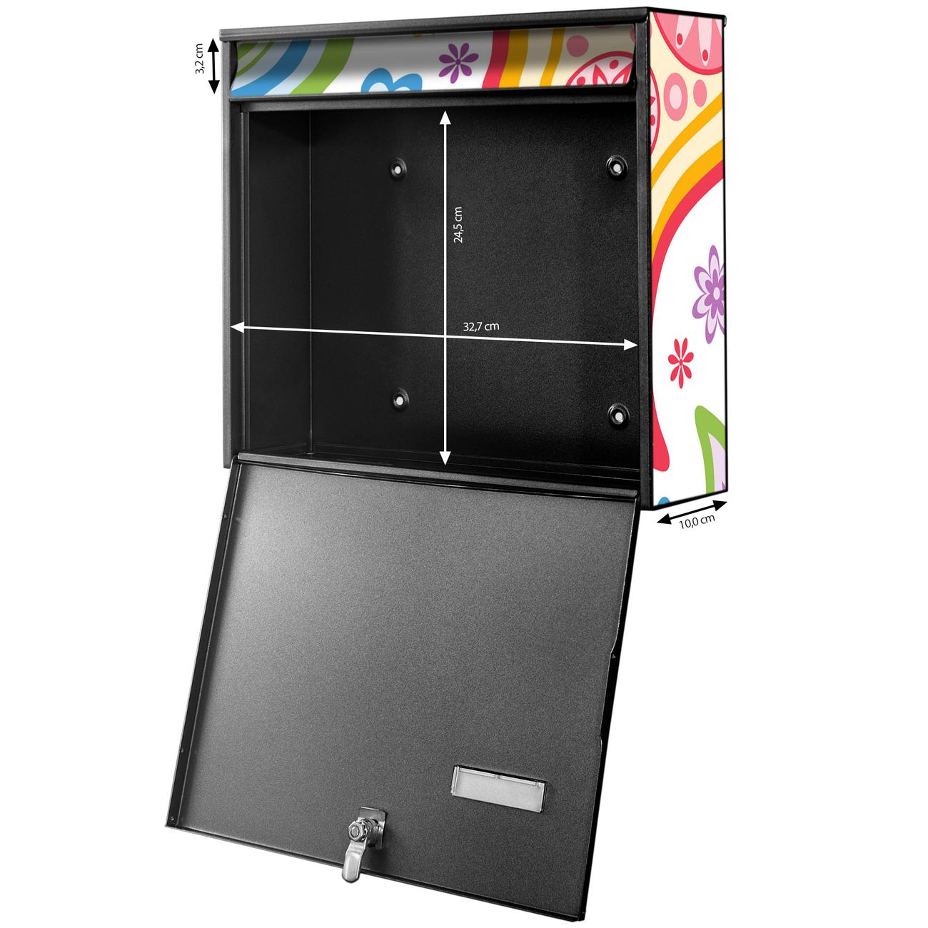 FUNKTION: Die Burg-Wächter Briefkastenanlage mit Motiv Paisley bunt bietet Ihnen ausreichend Fassungsvermögen um auch A4 und C4 Sendungen zu empfangen. Das integrierte Namensschild lässt sich individuell beschriften. Wählen Sie aus den Grundfarben weiß, silber und schwarz. DESIGN: Die 4 Briefkästen haben ein ansprechendes und zeitloses Design, ohne dabei auf Funktionalität zu verzichten. Das Material ist sehr stabil, wetterfest und rostfrei. Durch das Motiv Paisley bunt werden die Postkästen zu einem Blickfang. DETAILS: Die Postkästen bestehen aus verzinktem Stahl der zusätzlich mit Klarlack versiegelt wurde. Die Kästen sind gesamt 64,5cm hoch, 72,5cm breit und 10cm tief. Das Motiv besteht aus einer wetter- und UV-festen Folie, die Ihren Briefkasten zusätzlich vor Kratzern schützt. Die Postkästen werden mit Montagematerial, je einem Namensschild und je zwei Schlüsseln geliefert. NUTZEN: Das Briefkastenset eignet sich für die Wandmontage, die Größe bietet genügend Platz für Sendungen aller Art. Das zeitlose Design sowie die stabile Bauart bieten Ihnen einen treuen Begleiter für Ihre Post. BANJADO:
