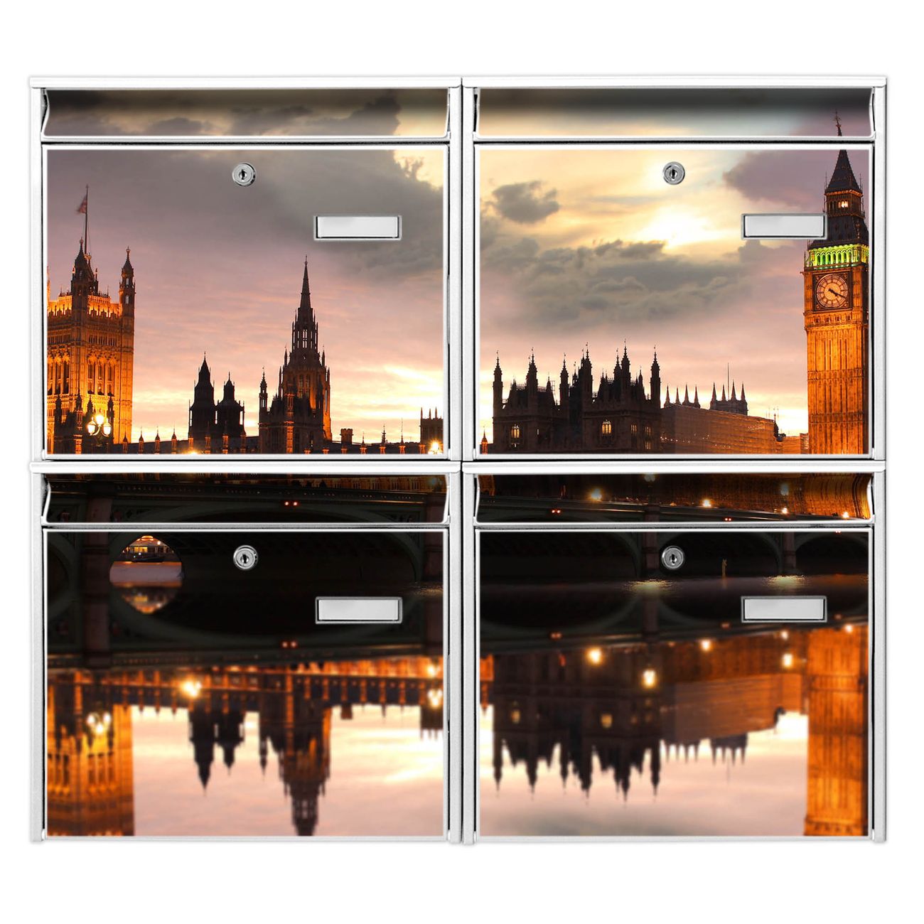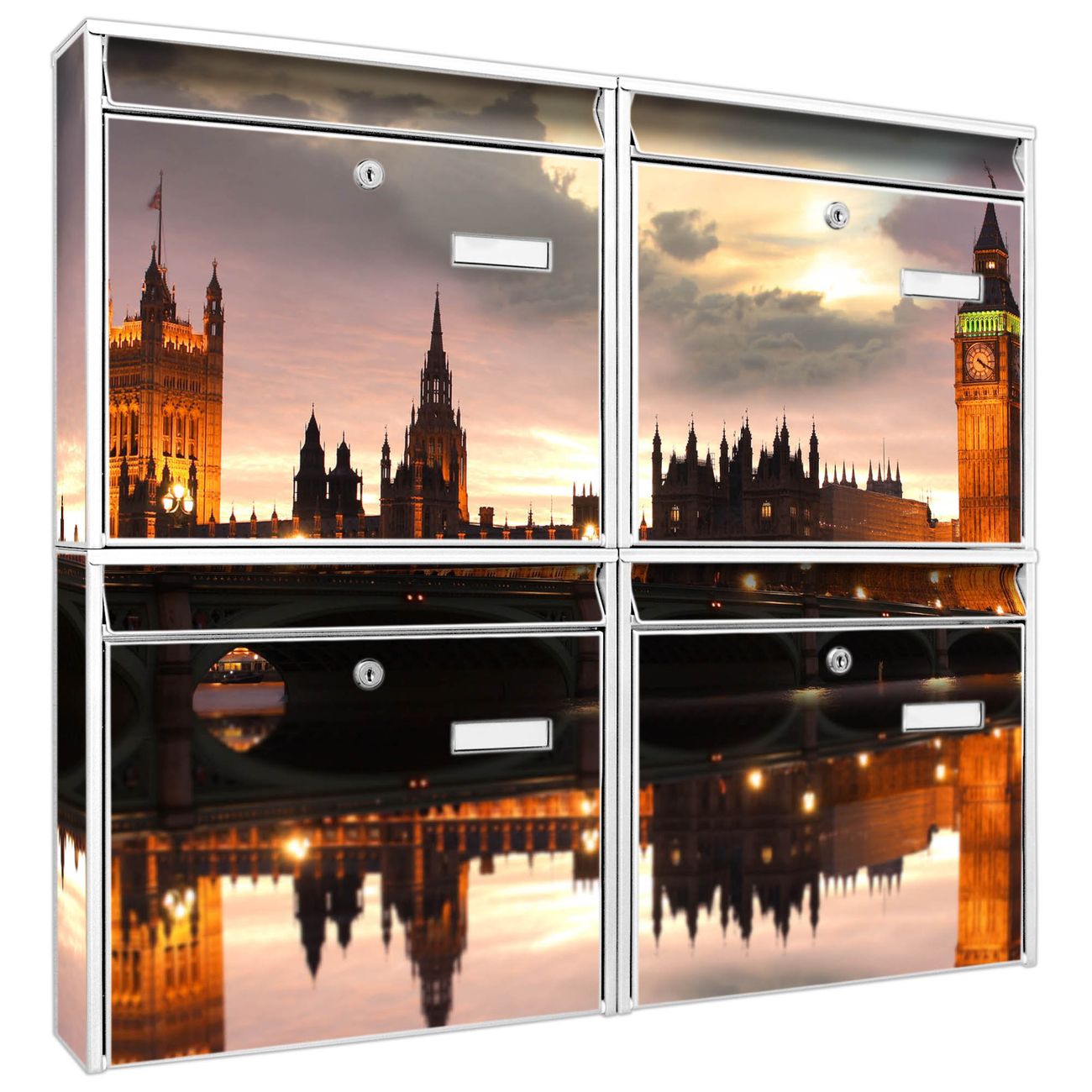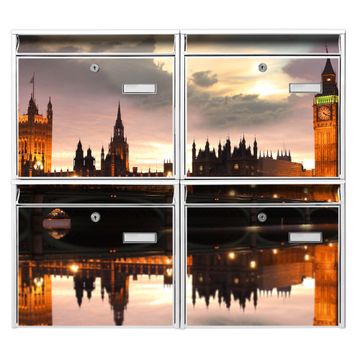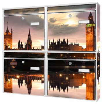 FUNKTION: Die Burg-Wächter Briefkastenanlage mit Motiv Palace of Westminster bietet Ihnen ausreichend Fassungsvermögen um auch A4 und C4 Sendungen zu empfangen. Das integrierte Namensschild lässt sich individuell beschriften. Wählen Sie aus den Grundfarben weiß, silber und schwarz. DESIGN: Die 4 Briefkästen haben ein ansprechendes und zeitloses Design, ohne dabei auf Funktionalität zu verzichten. Das Material ist sehr stabil, wetterfest und rostfrei. Durch das Motiv Palace of Westminster werden die Postkästen zu einem Blickfang. DETAILS: Die Postkästen bestehen aus verzinktem Stahl der zusätzlich mit Klarlack versiegelt wurde. Die Kästen sind gesamt 64,5cm hoch, 72,5cm breit und 10cm tief. Das Motiv besteht aus einer wetter- und UV-festen Folie, die Ihren Briefkasten zusätzlich vor Kratzern schützt. Die Postkästen werden mit Montagematerial, je einem Namensschild und je zwei Schlüsseln geliefert. NUTZEN: Das Briefkastenset eignet sich für die Wandmontage, die Größe bietet genügend Platz für Sendungen aller Art. Das zeitlose Design sowie die stabile Bauart bieten Ihnen einen treuen Begleiter für Ihre Post. BANJADO:
