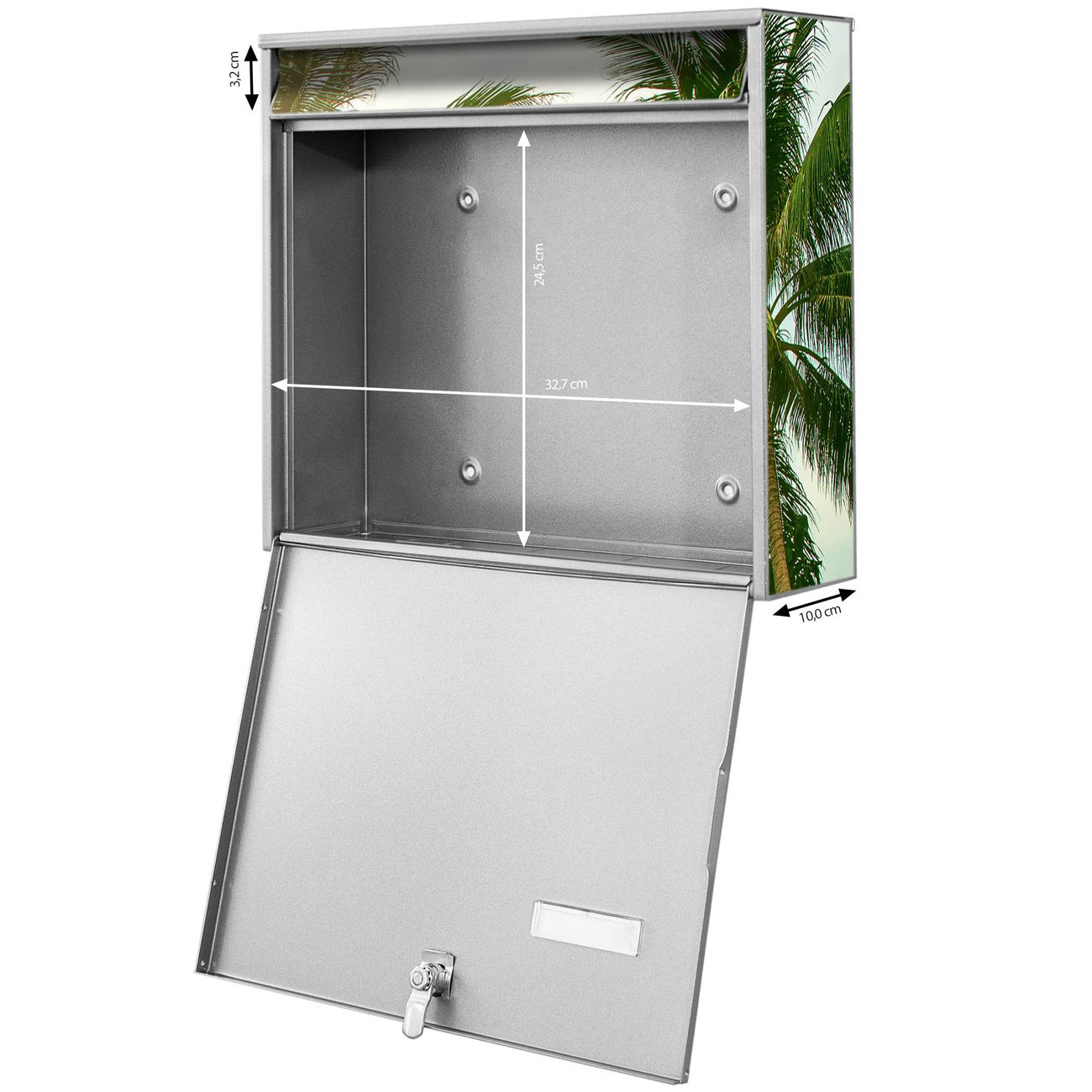 FUNKTION: Die Burg-Wächter Briefkastenanlage mit Motiv Palmen bietet Ihnen ausreichend Fassungsvermögen um auch A4 und C4 Sendungen zu empfangen. Das integrierte Namensschild lässt sich individuell beschriften. Wählen Sie aus den Grundfarben weiß, silber und schwarz. DESIGN: Die 4 Briefkästen haben ein ansprechendes und zeitloses Design, ohne dabei auf Funktionalität zu verzichten. Das Material ist sehr stabil, wetterfest und rostfrei. Durch das Motiv Palmen werden die Postkästen zu einem Blickfang. DETAILS: Die Postkästen bestehen aus verzinktem Stahl der zusätzlich mit Klarlack versiegelt wurde. Die Kästen sind gesamt 64,5cm hoch, 72,5cm breit und 10cm tief. Das Motiv besteht aus einer wetter- und UV-festen Folie, die Ihren Briefkasten zusätzlich vor Kratzern schützt. Die Postkästen werden mit Montagematerial, je einem Namensschild und je zwei Schlüsseln geliefert. NUTZEN: Das Briefkastenset eignet sich für die Wandmontage, die Größe bietet genügend Platz für Sendungen aller Art. Das zeitlose Design sowie die stabile Bauart bieten Ihnen einen treuen Begleiter für Ihre Post. BANJADO: