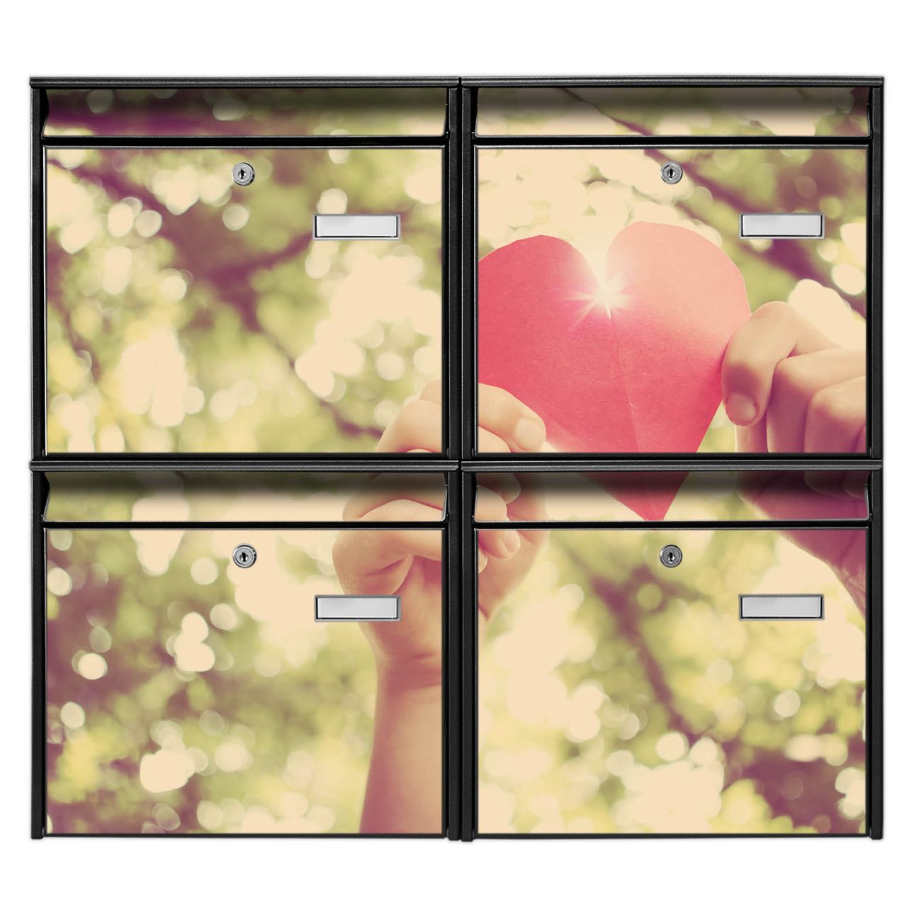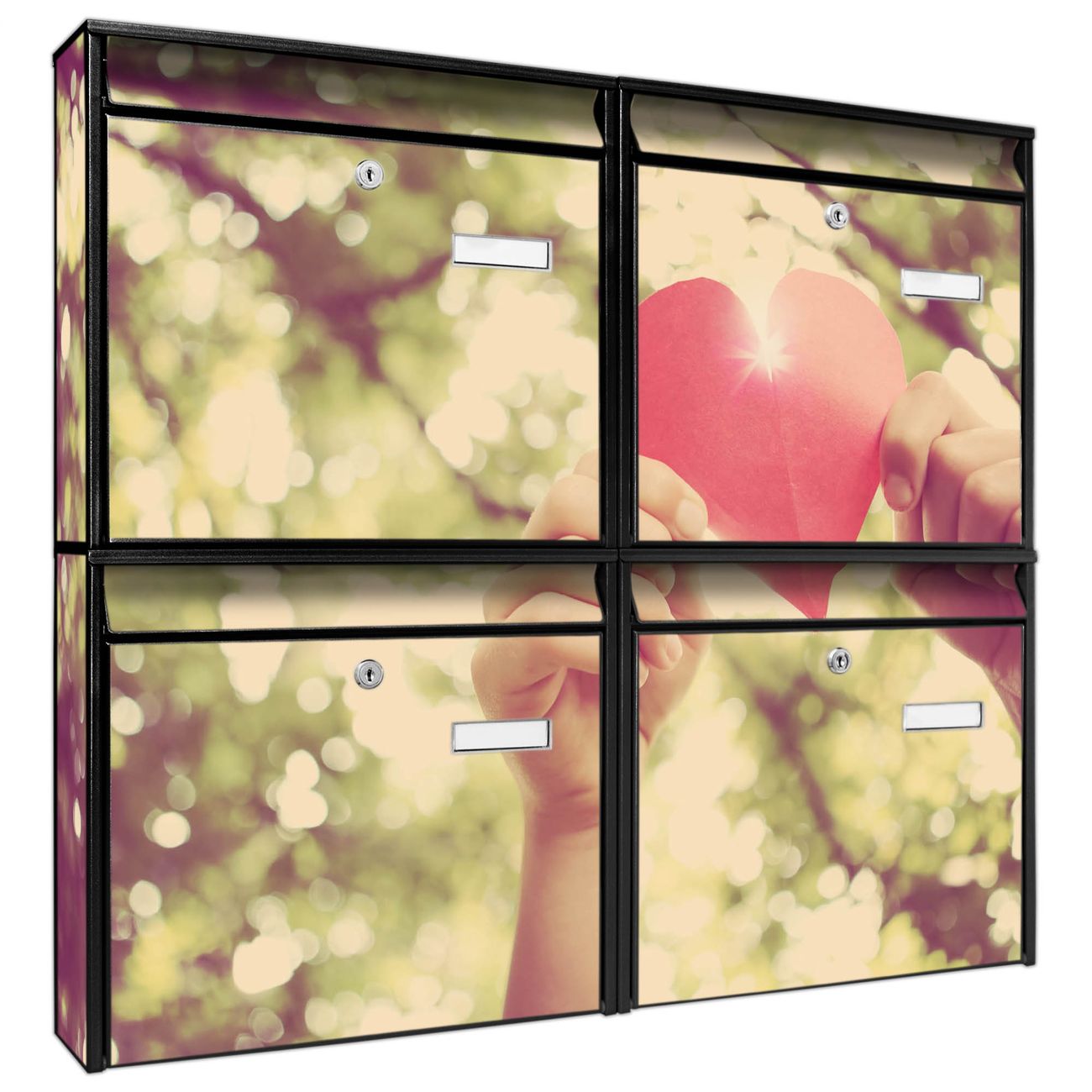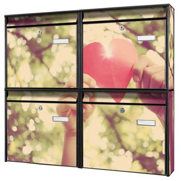 FUNKTION: Die Burg-Wächter Briefkastenanlage mit Motiv Papierherz bietet Ihnen ausreichend Fassungsvermögen um auch A4 und C4 Sendungen zu empfangen. Das integrierte Namensschild lässt sich individuell beschriften. Wählen Sie aus den Grundfarben weiß, silber und schwarz. DESIGN: Die 4 Briefkästen haben ein ansprechendes und zeitloses Design, ohne dabei auf Funktionalität zu verzichten. Das Material ist sehr stabil, wetterfest und rostfrei. Durch das Motiv Papierherz werden die Postkästen zu einem Blickfang. DETAILS: Die Postkästen bestehen aus verzinktem Stahl der zusätzlich mit Klarlack versiegelt wurde. Die Kästen sind gesamt 64,5cm hoch, 72,5cm breit und 10cm tief. Das Motiv besteht aus einer wetter- und UV-festen Folie, die Ihren Briefkasten zusätzlich vor Kratzern schützt. Die Postkästen werden mit Montagematerial, je einem Namensschild und je zwei Schlüsseln geliefert. NUTZEN: Das Briefkastenset eignet sich für die Wandmontage, die Größe bietet genügend Platz für Sendungen aller Art. Das zeitlose Design sowie die stabile Bauart bieten Ihnen einen treuen Begleiter für Ihre Post. BANJADO: