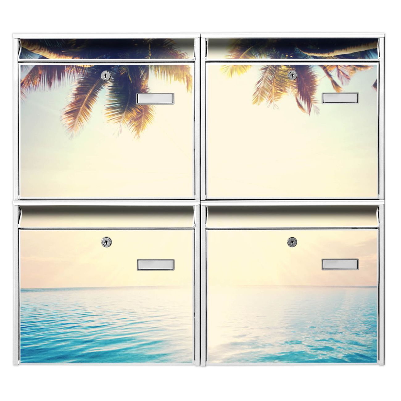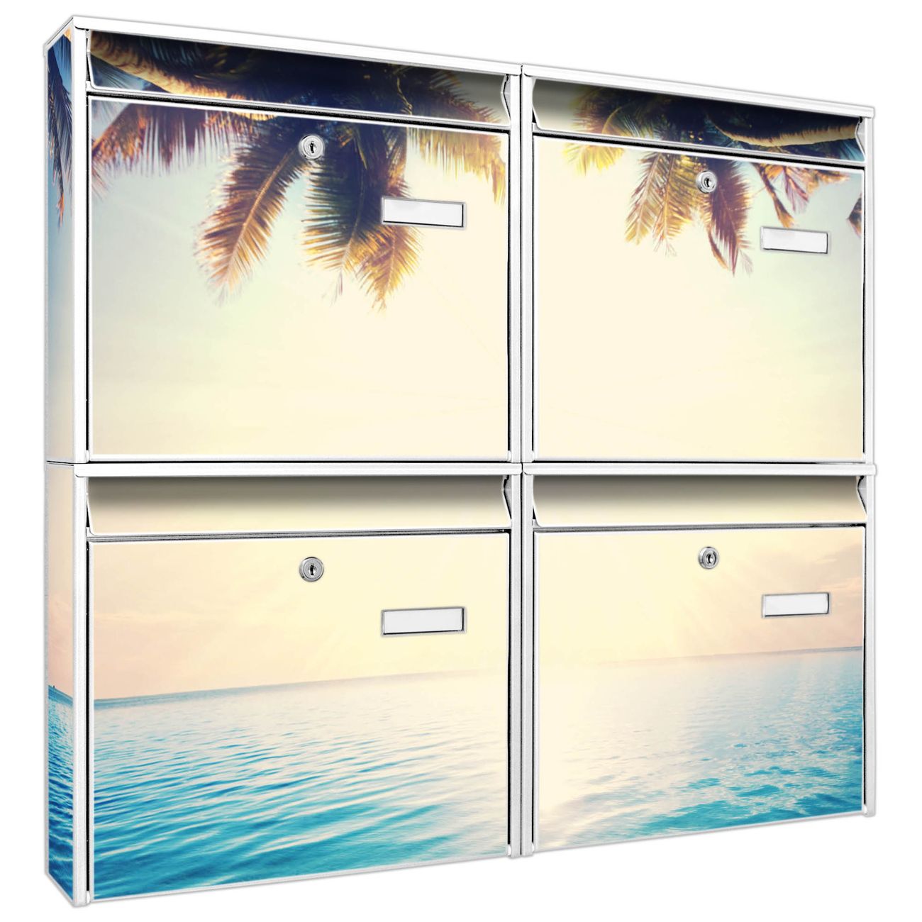 FUNKTION: Die Burg-Wächter Briefkastenanlage mit Motiv Paradis bietet Ihnen ausreichend Fassungsvermögen um auch A4 und C4 Sendungen zu empfangen. Das integrierte Namensschild lässt sich individuell beschriften. Wählen Sie aus den Grundfarben weiß, silber und schwarz. DESIGN: Die 4 Briefkästen haben ein ansprechendes und zeitloses Design, ohne dabei auf Funktionalität zu verzichten. Das Material ist sehr stabil, wetterfest und rostfrei. Durch das Motiv Paradis werden die Postkästen zu einem Blickfang. DETAILS: Die Postkästen bestehen aus verzinktem Stahl der zusätzlich mit Klarlack versiegelt wurde. Die Kästen sind gesamt 64,5cm hoch, 72,5cm breit und 10cm tief. Das Motiv besteht aus einer wetter- und UV-festen Folie, die Ihren Briefkasten zusätzlich vor Kratzern schützt. Die Postkästen werden mit Montagematerial, je einem Namensschild und je zwei Schlüsseln geliefert. NUTZEN: Das Briefkastenset eignet sich für die Wandmontage, die Größe bietet genügend Platz für Sendungen aller Art. Das zeitlose Design sowie die stabile Bauart bieten Ihnen einen treuen Begleiter für Ihre Post. BANJADO: