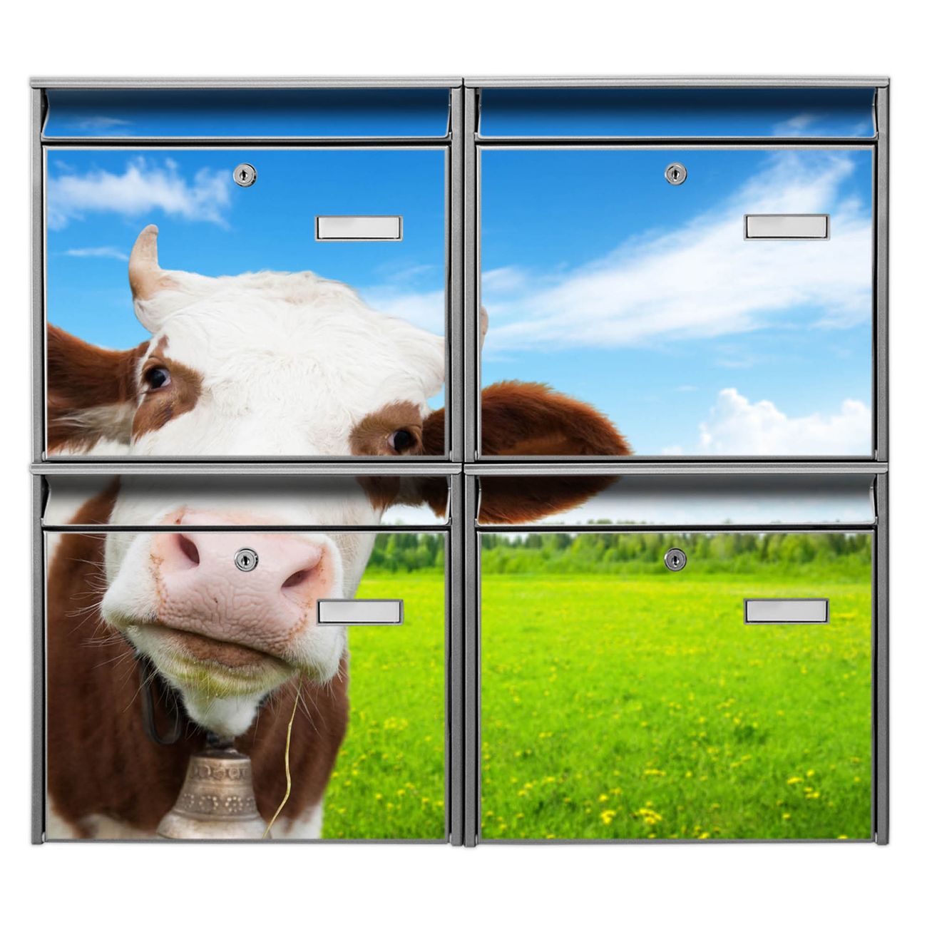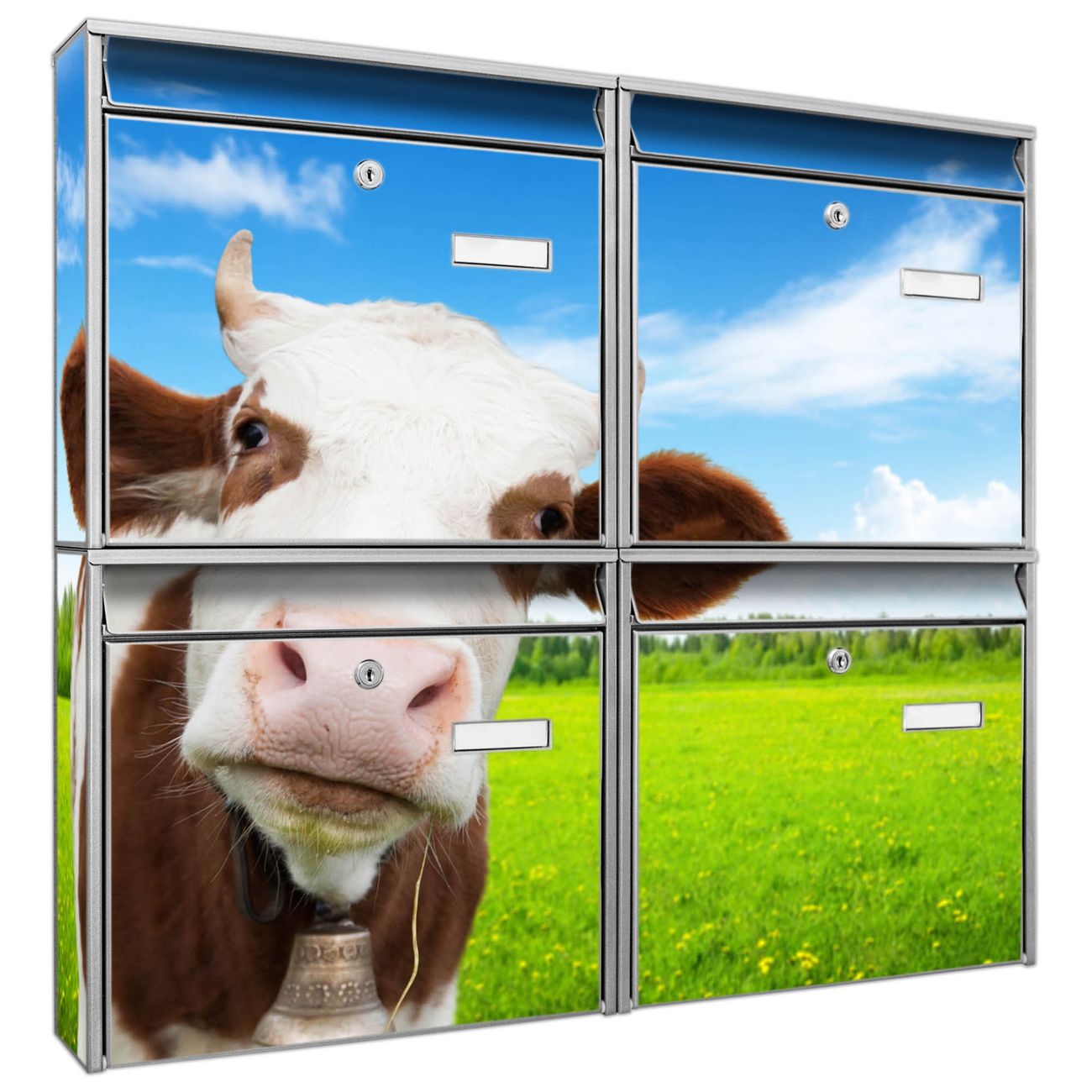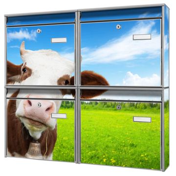 FUNKTION: Die Burg-Wächter Briefkastenanlage mit Motiv Pardon bietet Ihnen ausreichend Fassungsvermögen um auch A4 und C4 Sendungen zu empfangen. Das integrierte Namensschild lässt sich individuell beschriften. Wählen Sie aus den Grundfarben weiß, silber und schwarz. DESIGN: Die 4 Briefkästen haben ein ansprechendes und zeitloses Design, ohne dabei auf Funktionalität zu verzichten. Das Material ist sehr stabil, wetterfest und rostfrei. Durch das Motiv Pardon werden die Postkästen zu einem Blickfang. DETAILS: Die Postkästen bestehen aus verzinktem Stahl der zusätzlich mit Klarlack versiegelt wurde. Die Kästen sind gesamt 64,5cm hoch, 72,5cm breit und 10cm tief. Das Motiv besteht aus einer wetter- und UV-festen Folie, die Ihren Briefkasten zusätzlich vor Kratzern schützt. Die Postkästen werden mit Montagematerial, je einem Namensschild und je zwei Schlüsseln geliefert. NUTZEN: Das Briefkastenset eignet sich für die Wandmontage, die Größe bietet genügend Platz für Sendungen aller Art. Das zeitlose Design sowie die stabile Bauart bieten Ihnen einen treuen Begleiter für Ihre Post. BANJADO: